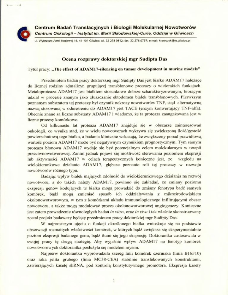 C Centrum Badań Translacyjnych i Biologii Molekularnej Nowotworów O Centrum Onkologii - Instytut im. Marii Skłodowskiej-Curie, Oddział w Gliwicach ul. Wybrzeże Armii Krajowej 15, 44-101 Gliwice; tel. 32 278 9842; fax. 32 278 9757; e-mail: [email protected] Ocena rozprawy doktorskiej mgr Sudipta Das Tytuł pracy: „The effect of ADAM17-silencing on tumor development in murine models" Przedmiotem badań pracy doktorskiej mgr Sudipty Das jest białko ADAM17 należące do licznej rodziny admalizyn grupującej transbłonowe proteazy o wielorakich funkcjach. Metaloproteaza ADAM17 jest białkiem stosunkowo dobrze scharakteryzowanym, biorącym udział w procesie znanym jako złuszczanie ektodomen białek transbłonowych. Pierwszym poznanym substratem tej proteazy był czynnik nekrozy nowotworów TNF, stąd alternatywną nazwą stosowaną w odniesieniu do ADAM17 jest TACE (enzym konwertujący TNF-alfa). Obecnie znane są liczne substraty ADAM17 i wiadomo, że ta proteaza zaangażowana jest w liczne procesy komórkowe. Od kilkunastu lat proteaza ADAM17 znajduje się w obszarze zainteresowań onkologii, co wynika stąd, że w wielu nowotworach wykrywa się zwiększoną ilość/gęstość powierzchniową tego białka, a badania kliniczne wskazują, że zwiększony ponad prawidłową wartość poziom ADAM17 może być negatywnym czynnikiem prognostycznym. Tym samym proteaza błonowa ADAM17 wydaje się być potencjalnym celem molekularnym w terapii przeciwnowotworowej. Zanim jednak pojawi się możliwość sterowania poziomem ekspresji lub aktywności ADAM17 w celach terapeutycznych konieczne jest, ze względu na wielokierunkowe działanie ADAM17, głębsze poznanie roli tej proteazy w rozwoju nowotworów różnego typu. Badając wpływ białek mających zdolność do wielokierunkowego działania na rozwój nowotworu, a do takich należy ADAM17, powinno się zakładać, że zmiany poziomu ekspresji genów kodujących te białka mogą prowadzić do zmiany fenotypu bądź samych komórek, bądź mogą zmieniać sposób ich oddziaływania z mikrośrodowiskiem okołonowotworowym, w tym z komórkami układu immunologicznego infiltrującymi obszar nowotworu, a także mogą modulować proces okołonowotworowej angiogenezy. Konieczne jest zatem prowadzenie równoległych badan in vitro, oraz in vivo i tak właśnie skonstruowany został projekt badawczy będący przedmiotem pracy doktorskiej mgr Sudipty Das. W najprostszym ujęciu o funkcji określonego białka wnioskuje się na podstawie obserwacji rozmaitych właściwości komórek, w których bądź zwiększa się eksperymentalnie poziom ekspresji badanego genu, bądź tłumi się jego ekspresję. Doktorantka zastosowała w swojej pracy tę drugą strategię. Aby wyjaśnić wpływ ADAM17 na fenotyp komórek nowotworowych doktorantka posłużyła się modelem mysim. Najpierw doktorantka wyprowadziła szereg linii komórek czerniaka (linia Bl6F10) oraz raka jelita grubego (linia MC38-CEA) stabilnie transfekowanych konstruktami, zawierających kasetę shRNA, pod kontrolą konstytutywnego promotora. Ekspresja kasety 1 shRNA prowadziła do pojawienia się w komórce swoistych cząsteczek interferującego RNA, a to w konsekwencji powodowało znaczące obniżenie poziomu mRNA ADAM17. Ponieważ procedura stabilnej transfekcji niesie możliwość wystąpienia efektu pozycji, stąd doktorantka bardzo słusznie prowadziła badanie wpływu wytłumienia ekspresji ADAM17 na właściwości transfekownych komórek równolegle na kilku modyfikowanych liniach (4 linie w przypadku komórek czerniaka i 3 w przypadku komórek gruczolakoraka). Linie te charakteryzowały się podobnym, wysokim poziomem (około 80%) wytłumienia ekspresji badanego genu na poziomie transkryptu. Doktorantka nie badała jednak wytłumienia ekspresji genu ADAM17 na poziomie białka. Badanie in vitro podstawowych właściwości istotnych dla progresji nowotworu nie wykazało, aby obniżenie poziomu ekspresji genu ADAM17 powodowało zmiany w żywotności czy tempie proliferacji zmodyfikowanych genetycznie komórek w porównaniu z komórkami kontrolnymi. Doktorantka wykazała natomiast, że komórki z wytłumioną ekspresją ADAM17 migrują wolniej niż komórki kontrolne. Właściwość tę doktorantka udokumentowała posługując się dwoma testami, tzw. testem „scrach" (zarastanie rysy utworzonej w monowarstwie komórek), oraz śledząc trajektorie wędrówki pojedynczych komórek posługując się odpowiednim mikroskopem. Interesującą obserwacją było także wykazanie, że wytłumienie ekspresji ADAM17 powoduje ograniczenie zdolności komórek do wzrostu w pożywce półpłynnej (w tzw. miękkim agarze), jakkolwiek doświadczenie zostało wykonane jedynie dla komórek czerniaka, ponieważ komórki linia MC38-CEA w warunkach doświadczenia (zarówno kontrolne, jak i z wytłumioną ekspresją ADAM17) umierały po kilku dniach hodowli. Powyższe obserwacje, a mianowicie obniżenie potencjału migracyjnego oraz ograniczenie tworzenia kolonii w miękkim agarze wskazuje, że wytłumienie ekspresji ADAM17 zmienia fenotyp komórek nowotworowych w kierunku ograniczenia ich potencjału tumorogennego, być może ograniczając ich zdolność do przerzutowania. W odniesieniu do wzrostu guza in situ wyniki badań in vitro sugerowały, że jeśli komórki z wytłumioną stabilnie ekspresją genu ADAM17 zostaną wszczepione myszom, to można było oczekiwać, że guzy powstałe z komórek modyfikowanych powinny rosnąć z podobną szybkością jak guzy powstałe z komórek kontrolnych, ponieważ wytłumienie ekspresji ADAM17 nie wpływało na szybkość proliferacji i żywotność komórek. Badania wykonane in vivo, w których doktorantka monitorowała wzrost guzów do 18 dnia od implantacji komórek (w niektórych przypadkach dłużej), wykazały jednak, że zarówno w przypadku komórek czerniaka, jak i w przypadku komórek raka jelita grubego, rozmiar i waga guzów powstałych z komórek, w których w