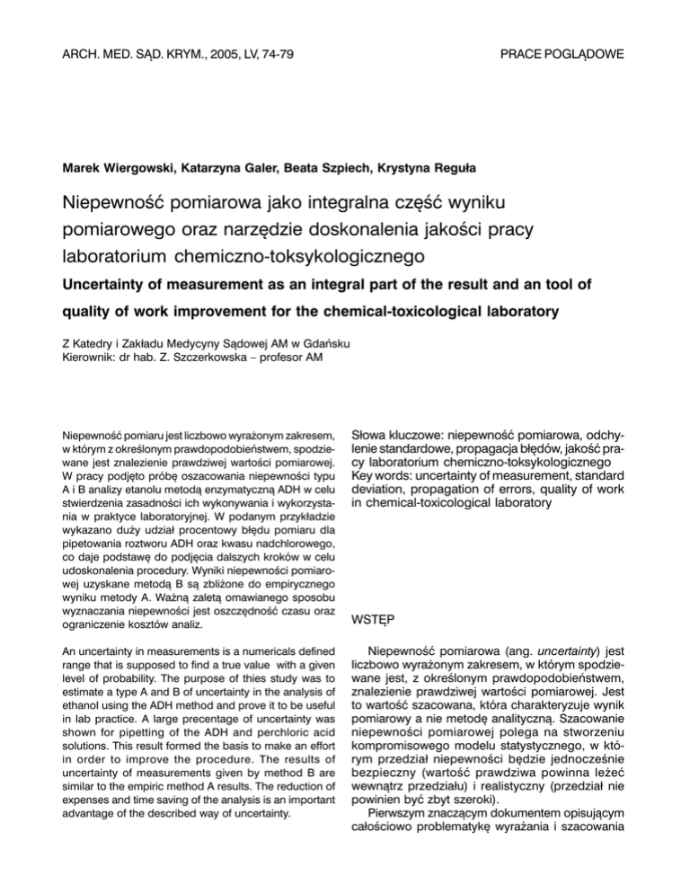 ARCH. MED. SĄD. KRYM., 2005, LV, 74-79 PRACE POGLĄDOWE Marek Wiergowski, Katarzyna Galer, Beata Szpiech, Krystyna Reguła Niepewność pomiarowa jako integralna część wyniku pomiarowego oraz narzędzie doskonalenia jakości pracy laboratorium chemiczno-toksykologicznego Uncertainty of measurement as an integral part of the result and an tool of quality of work improvement for the chemical-toxicological laboratory Z Katedry i Zakładu Medycyny Sądowej AM w Gdańsku Kierownik: dr hab. Z. Szczerkowska – profesor AM Niepewność pomiaru jest liczbowo wyrażonym zakresem, w którym z określonym prawdopodobieństwem, spodziewane jest znalezienie prawdziwej wartości pomiarowej. W pracy podjęto próbę oszacowania niepewności typu A i B analizy etanolu metodą enzymatyczną ADH w celu stwierdzenia zasadności ich wykonywania i wykorzystania w praktyce laboratoryjnej. W podanym przykładzie wykazano duży udział procentowy błędu pomiaru dla pipetowania roztworu ADH oraz kwasu nadchlorowego, co daje podstawę do podjęcia dalszych kroków w celu udoskonalenia procedury. Wyniki niepewności pomiarowej uzyskane metodą B są zbliżone do empirycznego wyniku metody A. Ważną zaletą omawianego sposobu wyznaczania niepewności jest oszczędność czasu oraz ograniczenie kosztów analiz. Słowa kluczowe: niepewność pomiarowa, odchylenie standardowe, propagacja błędów, jakość pracy laboratorium chemiczno-toksykologicznego Key words: uncertainty of measurement, standard deviation, propagation of errors, quality of work in chemical-toxicological laboratory An uncertainty in measurements is a numericals defined range that is supposed to find a true value with a given level of probability. The purpose of thies study was to estimate a type A and B of uncertainty in the analysis of ethanol using the ADH method and prove it to be useful in lab practice. A large precentage of uncertainty was shown for pipetting of the ADH and perchloric acid solutions. This result formed the basis to make an effort in order to improve the procedure. The results of uncertainty of measurements given by method B are similar to the empiric method A results. The reduction of expenses and time saving of the analysis is an important advantage of the described way of uncertainty. Niepewność pomiarowa (ang. uncertainty) jest liczbowo wyrażonym zakresem, w którym spodziewane jest, z określonym prawdopodobieństwem, znalezienie prawdziwej wartości pomiarowej. Jest to wartość szacowana, która charakteryzuje wynik pomiarowy a nie metodę analityczną. Szacowanie niepewności pomiarowej polega na stworzeniu kompromisowego modelu statystycznego, w którym przedział niepewności będzie jednocześnie bezpieczny (wartość prawdziwa powinna leżeć wewnątrz przedziału) i realistyczny (przedział nie powinien być zbyt szeroki). Pierwszym znaczącym dokumentem opisującym całościowo problematykę wyrażania i szacowania WSTĘP Nr 1 NIEPEWNOŚĆ POMIAROWA JAKO INTEGRALNA CZĘŚĆ WYNIKU POMIAROWEGO niepewności pomiarowej był przewodnik wydany w 1993 roku i przygotowany wspólnie przez siedem organizacji międzynarodowych metrologicznych (BIPM, IEC, IFCC, ISO, IUPAC, IUPAP i OIML) pod nazwą „Guide to the Expression of Uncertainty in Measurement” [9], który został również wydany w polskim tłumaczeniu [4]. W światowych zasobach Internetu dostępnych jest, co najmniej, kilka znaczących przewodników oraz wiele publikacji, które szczegółowo opisują problematykę ilościowego wyrażenia niepewności pomiarowej oraz promują jednolite zasady dobrej praktyki laboratoryjnej [2, 12]. METODY BADAWCZE Niepewność pomiarowa obejmuje zarówno błędy przypadkowe jak i błędy systematyczne, przy czym wielkość ta jest traktowana w szerszym aspekcie niż tradycyjnie rozumiana analiza błędu pomiarowego. Wartość liczbowa niepewności może być wyznaczona metodą typu A i typu B [9]. Niepewność otrzymana metodą typu A jest obliczana na podstawie serii powtórzonych obserwacji i wyrażana jest w postaci odchylenia standardowego (niepewność standardowa typu A, ang. standard uncertainty). Niepewność typu B jest obliczana z wykorzystaniem dostępnej wiedzy (a priori) jako estymata odchylenia standardowego (niepewność standardowa typu B). Trudniejsza w opisaniu jest niepewność typu B, gdzie bada się zależności między wielkością mierzoną a parametrami, od których ona zależy. Dlatego początkowym etapem na drodze szacowania niepewności pomiarowej jest jasne zdefiniowanie jednostki pomiarowej (udzielenie odpowiedzi na pytanie „co mierzymy?”) oraz pełny opis procedury analitycznej („co wpływa na wynik końcowy oraz w jakich warunkach dokonujemy pomiaru?”). Następnie dokonuje się opisu możliwych źródeł niepewności pomiarowej i szacuje ich wartości. Szacowanie wartości składowych niepewności i ich korelacji najczęściej pozwala na stworzenie modelu matematycznego dla danej procedury. Dalszym etapem jest zsumowanie poszczególnych składowych niepewności (w postaci estymatów odchyleń standardowych) stosując najczęściej prawo propagacji błędu statystycznego do wielkości zwanej złożoną niepewnością pomiarową (ang. combined standard uncertainty). Końcową wartość niepewności pomiarowej zwaną rozszerzoną niepewnością (ang. expanded uncertainty) oblicza się na podstawie założonego szacowanego prawdopodobieństwa oraz współczynnika rozszerzenia k (ang. coverage factor), który przyjmuje 75 wartości od 2 do 3 w zależności od poziomu prawdopodobieństwa w zakresie 95-99%. Polskie Centrum Akredytacji, powołując się na międzynarodowe dokumenty akredytacyjne [10,13], wymaga od laboratoriów przestrzegania cech spójności pomiarowej. Do tych cech należy także niepewność pomiaru, której wartość powinna być podana przy poziomie ufności równym 95% oraz współczynniku rozszerzenia k równym 2. Należy zaznaczyć, iż składowe niepewności ty