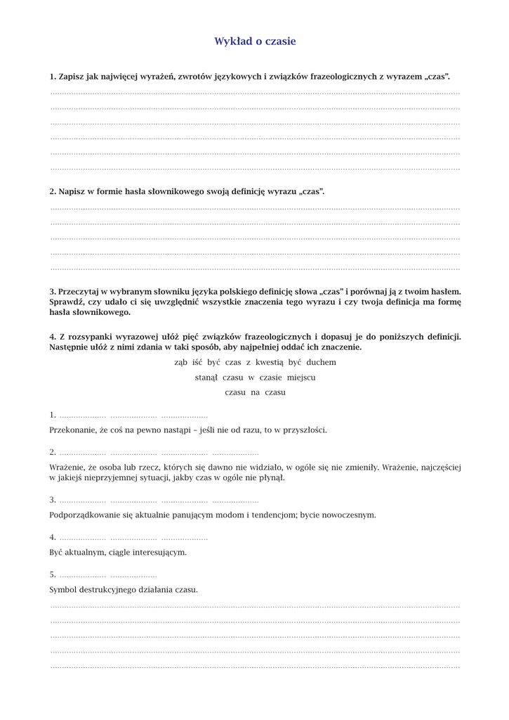 Wykład o czasie 1. Zapisz jak najwięcej wyrażeń, zwrotów językowych i związków frazeologicznych z wyrazem „czas”. ............................................................................................................................... ................................................ ............................................................................................................................... ................................................ ............................................................................................................................... ................................................ ............................................................................................................................... ................................................ ............................................................................................................................... ................................................ ............................................................................................................................... ................................................ 2. Napisz w formie hasła słownikowego swoją definicję wyrazu „czas”. ............................................................................................................................... ................................................ ............................................................................................................................... ................................................ ............................................................................................................................... ................................................ ............................................................................................................................... ................................................ ............................................................................................................................... ................................................ 3. Przeczytaj w wybranym słowniku języka polskiego definicję słowa „czas” i porównaj ją z twoim hasłem. Sprawdź, czy udało ci się uwzględnić wszystkie znaczenia tego wyrazu i czy twoja definicja ma formę hasła słownikowego. 4. Z rozsypanki wyrazowej ułóż pięć związków frazeologicznych i dopasuj je do poniższych definicji. Następnie ułóż z nimi zdania w taki sposób, aby najpełniej oddać ich znaczenie. ząb iść być czas z kwestią być duchem stanął czasu w czasie miejscu czasu na czasu 1. .................... .................... .................... Przekonanie, że coś na pewno nastąpi – jeśli nie od razu, to w przyszłości. 2. .................... .................... .................... .................... Wrażenie, że osoba lub rzecz, których się dawno nie widziało, w ogóle się nie zmieniły. Wrażenie, najczęściej w jakiejś nieprzyjemnej sytuacji, jakby czas w ogóle nie płynął. 3. .................... .................... .................... .................... Podporządkowanie się aktualnie panującym modom i tendencjom; bycie nowoczesnym. 4. .................... .................... .................... Być aktualnym, ciągle interesującym. 5. .................... .................... Symbol destrukcyjnego działania czasu. ............................................................................................................................... ................................................ ............................................................................................................................... ................................................ ............................................................................................................................... ................................................ ............................................................................................................................... ................................................ ............................................................................................................................... ................................................ 5. Zagadnienie czasu od dawna interesowało człowieka i było przedmiotem rozważań filozoficznych oraz tematem dzieł literatury i sztuki. Starożytny filozof Heraklit kojarzył upływ czasu z płynącą rzeką. Mówił: „Nikt nie wstępuje dwa razy do tej samej rzeki. Wszystko płynie”. Napisz, jaki zauważasz związek między myślą Heraklita a potocznym rozumieniem czasu. ............................................................................................................................... ................................................ ............................................................................................................................... ................................................ ............................................................................................................................... ................................................ ............................................................................................................................... ................................................ ............................................................................................................................... ................................................ 6. W sztuce symbolami czasu często są klepsydra, świeca i czaszka. Uzasadnij, dlaczego – twoim zdaniem – tak jest. W razie potrzeby możesz skorzystać ze słownika symboli. ............................................................................................................................... ................................................ ..................