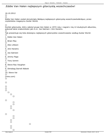 Gigs.pl - Koncerty :: Festiwale :: Imprezy .Eddie Van Halen najlepszym gitarzystą wszechczasów! 16.10.2012 Eddie Van Halen został okrzyknięty „najlepszym gitarzystą wszechczasów” przez czytelników magazynu Guitar World. Duński gitarzysta, który założył grupę Van Halen w 1972 roku i nagrał z nią 12 studyjnych albumów, pokonał takie znakomitości jak m.in. Joe Satriani i Jimi Hendrix. Tak prezentuje się lista dziesięciu najlepszych gitarzystów wszechczasów według Guitar World: 1. Eddie Van Halen 2. Brian May 3. Alex Lifeson 4. Jimi Hendrix 5. Joe Satriani 6. Jimmy Page 7. Tony Iommi 8. Steve Ray Vaughan 9. Dimebag Darrell Abbott 10. Steve Vai (nme.com) http://gigs.pl Kreator PDF Utworzono 3 March, 2017, 16:19 Gigs.pl - Koncerty :: Festiwale :: Imprezy http://gigs.pl Kreator PDF Utworzono 3 March, 2017, 16:19