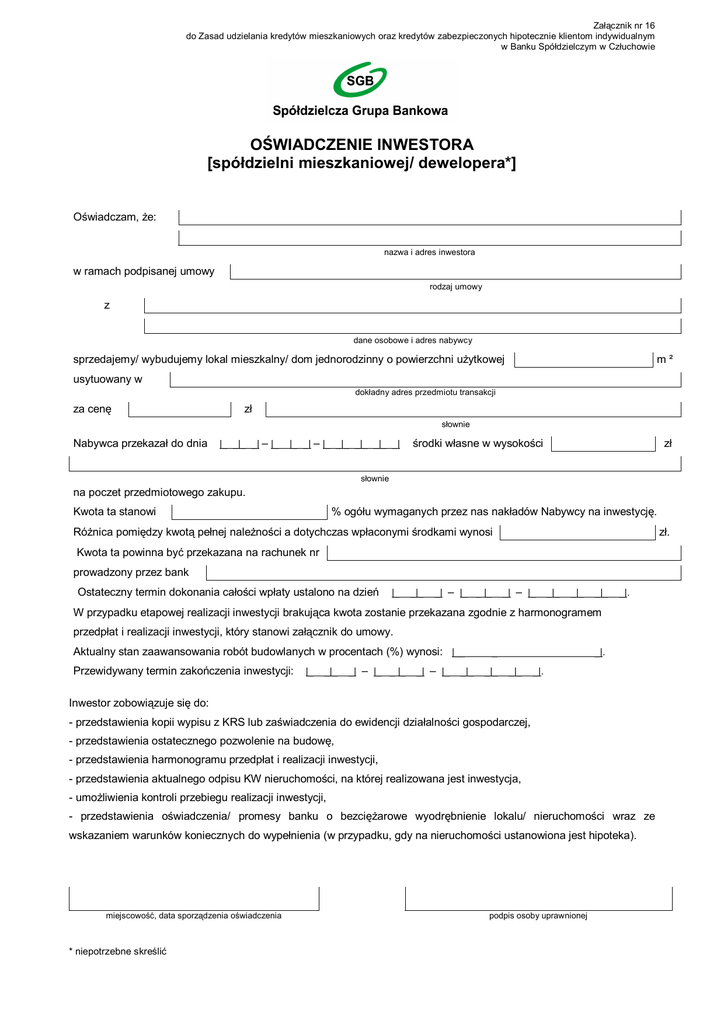 Załącznik nr 16 do Zasad udzielania kredytów mieszkaniowych oraz kredytów zabezpieczonych hipotecznie klientom indywidualnym w Banku Spółdzielczym w Człuchowie OŚWIADCZENIE INWESTORA [spółdzielni mieszkaniowej/ dewelopera*] Oświadczam, że: nazwa i adres inwestora w ramach podpisanej umowy rodzaj umowy z dane osobowe i adres nabywcy sprzedajemy/ wybudujemy lokal mieszkalny/ dom jednorodzinny o powierzchni użytkowej m² usytuowany w dokładny adres przedmiotu transakcji za cenę zł słownie Nabywca przekazał do dnia |_ _|_ _| – |_ |_ _| – |_ _|_ _|_ _|_ _| środki własne w wysokości zł słownie na poczet przedmiotowego zakupu. Kwota ta stanowi % ogółu wymaganych przez nas nakładów Nabywcy na inwestycję. Różnica pomiędzy kwotą pełnej należności a dotychczas wpłaconymi środkami wynosi zł. Kwota ta powinna być przekazana na rachunek nr prowadzony przez bank Ostateczny termin dokonania całości wpłaty ustalono na dzień |_ _|_ _| – |_ _ |_ _| – |_ _|_ _|_ _|_ _|. W przypadku etapowej realizacji inwestycji brakująca kwota zostanie przekazana zgodnie z harmonogramem przedpłat i realizacji inwestycji, który stanowi załącznik do umowy. Aktualny stan zaawansowania robót budowlanych w procentach (%) wynosi: |__ Przewidywany termin zakończenia inwestycji: |_ _|_ _| – |_ _ |_ _| – |_ _|_ _ _|_ _|. _|_ _|. Inwestor zobowiązuje się do: - przedstawienia kopii wypisu z KRS lub zaświadczenia do ewidencji działalności gospodarczej, - przedstawienia ostatecznego pozwolenie na budowę, - przedstawienia harmonogramu przedpłat i realizacji inwestycji, - przedstawienia aktualnego odpisu KW nieruchomości, na której realizowana jest inwestycja, - umożliwienia kontroli przebiegu realizacji inwestycji, - przedstawienia oświadczenia/ promesy banku o bezciężarowe wyodrębnienie lokalu/ nieruchomości wraz ze wskazaniem warunków koniecznych do wypełnienia (w przypadku, gdy na nieruchomości ustanowiona jest hipoteka). miejscowość, data sporządzenia oświadczenia * niepotrzebne skreślić podpis osoby uprawnionej
