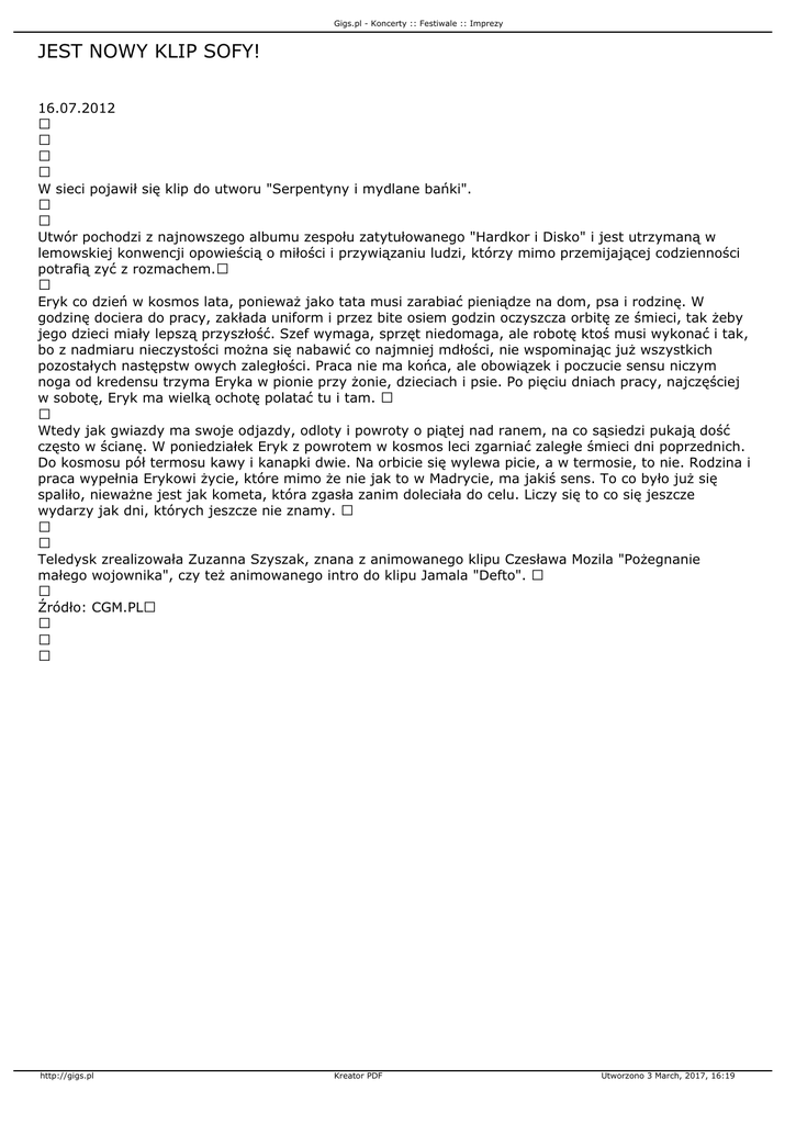 Gigs.pl - Koncerty :: Festiwale :: Imprezy JEST NOWY KLIP SOFY! 16.07.2012 W sieci pojawił się klip do utworu "Serpentyny i mydlane bańki". Utwór pochodzi z najnowszego albumu zespołu zatytułowanego "Hardkor i Disko" i jest utrzymaną w lemowskiej konwencji opowieścią o miłości i przywiązaniu ludzi, którzy mimo przemijającej codzienności potrafią zyć z rozmachem. Eryk co dzień w kosmos lata, ponieważ jako tata musi zarabiać pieniądze na dom, psa i rodzinę. W godzinę dociera do pracy, zakłada uniform i przez bite osiem godzin oczyszcza orbitę ze śmieci, tak żeby jego dzieci miały lepszą przyszłość. Szef wymaga, sprzęt niedomaga, ale robotę ktoś musi wykonać i tak, bo z nadmiaru nieczystości można się nabawić co najmniej mdłości, nie wspominając już wszystkich pozostałych następstw owych zaległości. Praca nie ma końca, ale obowiązek i poczucie sensu niczym noga od kredensu trzyma Eryka w pionie przy żonie, dzieciach i psie. Po pięciu dniach pracy, najczęściej w sobotę, Eryk ma wielką ochotę polatać tu i tam. Wtedy jak gwiazdy ma swoje odjazdy, odloty i powroty o piątej nad ranem, na co sąsiedzi pukają dość często w ścianę. W poniedziałek Eryk z powrotem w kosmos leci zgarniać zaległe śmieci dni poprzednich. Do kosmosu pół termosu kawy i kanapki dwie. Na orbicie się wylewa picie, a w termosie, to nie. Rodzina i praca wypełnia Erykowi życie, które mimo że nie jak to w Madrycie, ma jakiś sens. To co było już się spaliło, nieważne jest jak kometa, która zgasła zanim doleciała do celu. Liczy się to co się jeszcze wydarzy jak dni, których jeszcze nie znamy. Teledysk zrealizowała Zuzanna Szyszak, znana z animowanego klipu Czesława Mozila "Pożegnanie małego wojownika", czy też animowanego intro do klipu Jamala "Defto". Źródło: CGM.PL http://gigs.pl Kreator PDF Utworzono 3 March, 2017, 16:19