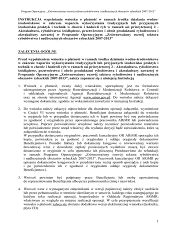 Program Operacyjny: „Zrównoważony rozwój sektora rybołówstwa i nadbrzeżnych obszarów rybackich 2007-2013” INSTRUKCJA wypełniania wniosku o płatność w ramach środka działania wodnośrodowiskowe w zakresie wsparcia wykorzystania tradycyjnych lub przyjaznych środowisku praktyk i technik w chowie i hodowli ryb w ramach osi priorytetowej 2 Akwakultura, rybołówstwo śródlądowe, przetwórstwo i obrót produktami rybołówstwa i akwakultury zawartej w Programie Operacyjnym „Zrównoważony rozwój sektora rybołówstwa i nadbrzeżnych obszarów rybackich 2007-2013” ZALECENIA OGÓLNE Przed wypełnieniem wniosku o płatność w ramach środka działania wodno-środowiskowe w zakresie wsparcia wykorzystania tradycyjnych lub przyjaznych środowisku praktyk i technik w chowie i hodowli ryb w ramach osi priorytetowej 2 - Akwakultura, rybołówstwo śródlądowe, przetwórstwo i obrót produktami rybołówstwa i akwakultury zawartej w Programie Operacyjnym „Zrównoważony rozwój sektora rybołówstwa i nadbrzeżnych obszarów rybackich 2007-2013”, należy zapoznać się z niniejszą Instrukcją 1. Wniosek o płatność, zwany dalej wnioskiem, sporządzany jest na formularzu udostępnionym przez Agencję Restrukturyzacji i Modernizacji Rolnictwa w Centrali i oddziałach regionalnych Agencji Restrukturyzacji i Modernizacji Rolnictwa oraz na stronie internetowej Agencji www.arimr.gov.pl. Do wniosku należy dołączyć wymagane dokumenty, zgodnie ze wskazaniami zawartymi w niniejszej Instrukcji. 2. Do wniosku należy załączyć odpowiednie dla charakteru operacji załączniki, wymienione w Części VI wzoru wniosku o płatność. Beneficjent dostarcza załączniki do wniosku w oryginale lub w przypadku dostarczenia ich w kopii powinny być one poświadczone za zgodność z oryginałem przez upoważnionego pracownika ARiMR lub poświadczone urzędowo. Poprzez poświadczenie urzędowe należy rozumieć poświadczenie notarialne lub poświadczenie przez urząd właściwy dla wydania decyzji bądź zaświadczenia, które są załącznikiem do wniosku. W przypadku dostarczenia oryginałów, pracownik kancelaryjny OR ARiMR sporządza ich kopie, poświadcza je za godność z oryginałem i oddaje oryginały dokumentów Beneficjentowi. Ponadto faktury lub dokumenty księgowe o równoważnej wartości dowodowej wraz z dowodami zapłaty poniesionych wydatków muszą być zawsze dostarczone w oryginale w celu opatrzenia ich pieczęcią Przedstawiono do refundacji w ramach Programu Operacyjnego „Zrównoważony rozwój sektora rybołówstwa i nadbrzeżnych obszarów rybackich 2007-2013”. Pracownik kancelaryjny OR ARiMR po opisaniu dokumentów księgowych w przedstawiony wyżej sposób sporządza z nich kopie i po potwierdzeniu ich z zgodność z oryginałem oddaje oryginały dokumentów Beneficjentowi. 3. Wniosek powinien być podpisany przez Beneficjenta lub osobę upoważnioną do reprezentowania Beneficjenta albo przez pełnomocnika (imię i nazwisko). 4. Wniosek wraz z wymaganymi załącznikami w wersji papierowej należy złożyć osobiście lub przez pełnomocnika w terminie określonym w umowie, każdego roku następującego po każdym roku realizacji operacji, bezpośrednio w Oddziale Regionalnym ARiMR, właściwym ze względu na miejsce realizacji operacji. W celu przyspieszenia weryfikacji wniosku o płatność zaleca się złożenie dodatkowo wersji elektronicznej wniosku (dyskietka, płyta CD). 1 Program Operacyjny: „Zrównoważony rozwój sektora rybołówstwa i nadbrzeżnych obszarów rybackich 2007-2013” 5. Beneficjent czytelnie wypełnia niebieskim lub czarnym kolorem wyłącznie białe pola wniosku. 6. Dla każdego roku realizacji operacji należy złożyć oddzielny wniosek. 7. W przypadku stwierdzenia braków/błędów w złożonej dokumentacji, wniosek wymagał będzie uzupełnienia/poprawienia/wyjaśnienia w terminie określonym w piśmie informującym o uzupełnieniu/poprawieniu/wyjaśnieniu wniosku o płatność. Terminy liczone są w dniach kalendarzowych od dnia następującego po dniu doręczenia wezwania. W przypadku, gdy koniec terminu przypada na dzień ustawowo wolny od pracy, wówczas za ostatni dzień tego terminu uważa się najbliższy następny dzień roboczy. 8. Wszystkie dokumenty sporządzone w języku obcym powinny być przetłumaczone na język polski przez tłumacza przysięgłego. 9. Płatności dokonuje się po złożeniu poprawnie i kompletnie wypełnionego wraz ze wszystkimi wymaganymi załącznikami potwierdzającymi realizację oraz po sprawdzeniu przez ARiMR zgodności zrealizowanej operacji z umową. złożenia poprawnego i kompletnego wniosku uważana jest data, kiedy ARiMR wniosek poprawnie wypełniony wraz ze wszystkimi wymaganymi załącznikami. wniosku operacji Za datę otrzyma 10. Wraz z wnioskiem o płatność należy złożyć wszystkie niezbędne opinie, zaświadczenia, uzgodnienia, pozwolenia lub inne decyzje związane z realizacją operacji, o ile wymagają tego obowiązujące przepisy prawa oraz postanowienia umowy. 11. Dane finansowe podane we wniosku wyrażone są w PLN z dokładnością do dwóch miejsc po przecinku. 12. We wniosku występują następujące rodzaje pól: - [SEKCJA OBOWIĄZKOWA] - sekcja obowiązkowa do wypełnienia przez Beneficjenta poprzez wpisanie odpowiednich danych lub zaznaczenie odpowiedniego pola - [POLE WYPEŁNIA PRACOWNIK ARiMR] – pole wypełniane przez pracownika ARiMR po wpłynięciu wniosku do Oddziału Regionalnego ARiMR INSTRUKCJA WYPEŁNIANIA POSZCZEGÓLNYCH PUNKTÓW FORMULARZA WNIOSKU O PŁATNOŚĆ Potwierdzenie przyjęcia – [POLE WYPEŁNIA PRACOWNIK ARiMR] Znak sprawy – [POLE WYPEŁNIA PRACOWNIK ARiMR] I. DANE Z UMOWY [SEKCJA OBOWIĄZKOWA]. 1. Nazwa Funduszu: Europejski Fundusz Rybacki (EFR). Nazwa wpisana na stałe. 2. Nazwa Programu Operacyjnego: „Zrównoważony rozwój sektora rybołówstwa i nadbrzeżnych obszarów rybackich 2007-2013”. Nazwa wpisana na stałe. 2 Program