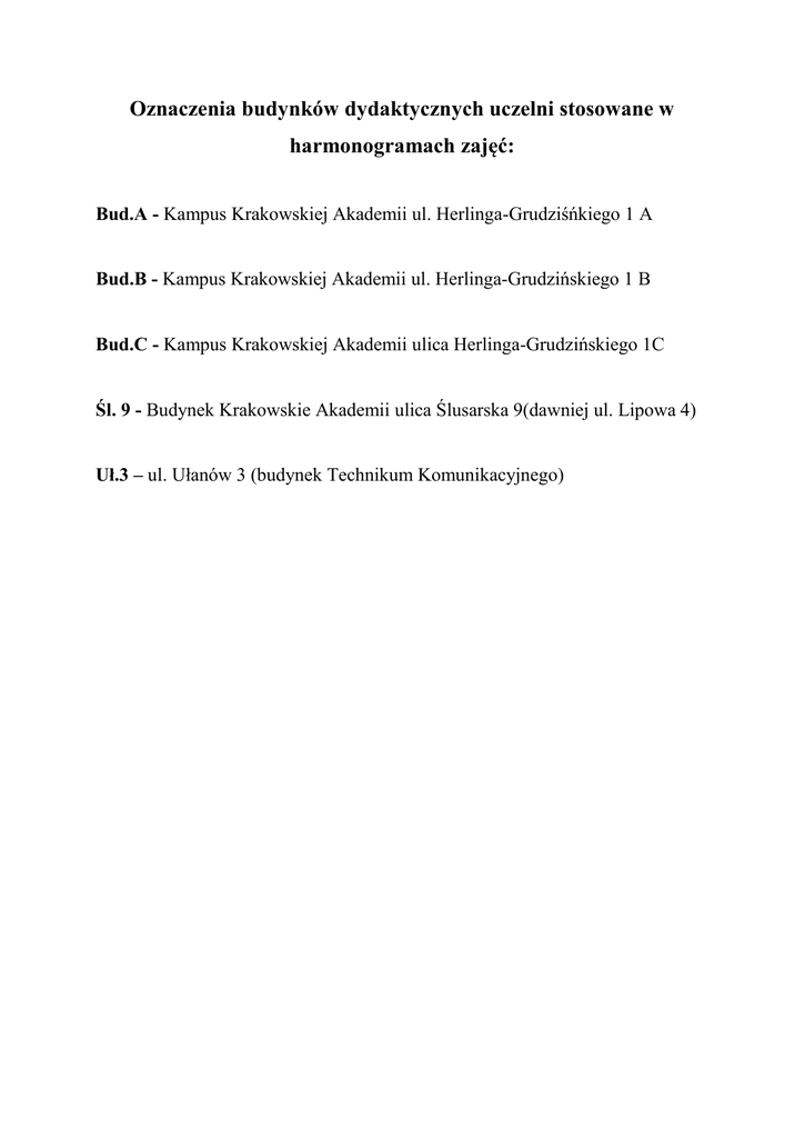 Oznaczenia budynków dydaktycznych uczelni stosowane w harmonogramach zajęć: Bud.A - Kampus Krakowskiej Akademii ul. Herlinga-Grudziśńkiego 1 A Bud.B - Kampus Krakowskiej Akademii ul. Herlinga-Grudzińskiego 1 B Bud.C - Kampus Krakowskiej Akademii ulica Herlinga-Grudzińskiego 1C Śl. 9 - Budynek Krakowskie Akademii ulica Ślusarska 9(dawniej ul. Lipowa 4) Uł.3 – ul. Ułanów 3 (budynek Technikum Komunikacyjnego)