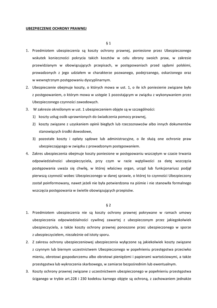 UBEZPIECZENIE OCHRONY PRAWNEJ § 1 1. Przedmiotem ubezpieczenia są koszty ochrony prawnej, poniesione przez Ubezpieczonego wskutek konieczności pokrycia takich kosztów w celu obrony swoich praw, w zakresie przewidzianym w obowiązujących przepisach, w postępowaniach przed sądami polskimi, prowadzonych z jego udziałem w charakterze pozwanego, podejrzanego, oskarżonego oraz w wewnętrznym postępowaniu dyscyplinarnym. 2. Ubezpieczenie obejmuje koszty, o których mowa w ust. 1, o ile ich poniesienie związane było z postępowaniem, o którym mowa w ustępie 1 pozostającym w związku z wykonywaniem przez Ubezpieczonego czynności zawodowych. 3. W zakresie określonym w ust. 1 ubezpieczeniem objęte są w szczególności: 1) koszty usług osób uprawnionych do świadczenia pomocy prawnej, 2) koszty związane z uzyskaniem opinii biegłych lub rzeczoznawców albo innych dokumentów stanowiących środki dowodowe, 3) pozostałe koszty i opłaty sądowe lub administracyjne, o ile służą one ochronie praw ubezpieczającego w związku z prowadzonym postępowaniem. 4. Zakres ubezpieczenia obejmuje koszty poniesione w postępowaniu wszczętym w czasie trwania odpowiedzialności ubezpieczyciela, przy czym w razie wątpliwości za datę wszczęcia postępowania uważa się chwilę, w której właściwy organ, urząd lub funkcjonariusz podjął pierwszą czynność wobec Ubezpieczonego w danej sprawie, o której to czynności Ubezpieczony został poinformowany, nawet jeżeli nie była potwierdzona na piśmie i nie stanowiła formalnego wszczęcia postępowania w świetle obowiązujących przepisów. § 2 1. Przedmiotem ubezpieczenia nie są koszty ochrony prawnej pokrywane w ramach umowy ubezpieczenia odpowiedzialności cywilnej zawartej z ubezpieczonym przez jakiegokolwiek ubezpieczyciela, a także koszty ochrony prawnej ponoszone przez ubezpieczonego w sporze z ubezpieczycielem, niezależnie od istoty sporu. 2. Z zakresu ochrony ubezpieczeniowej ubezpieczenia wyłączone są jakiekolwiek koszty związane z czynnym lub biernym uczestnictwem Ubezpieczonego w popełnieniu przestępstwa przeciwko mieniu, obrotowi gospodarczemu albo obrotowi pieniędzmi i papierami wartościowymi, a także przestępstwa lub wykroczenia skarbowego, w zamiarze bezpośrednim lub ewentualnym. 3. Koszty ochrony prawnej związane z uczestnictwem ubezpieczonego w popełnieniu przestępstwa ściganego w trybie art.228 i 230 kodeksu karnego objęte są ochroną, z zachowaniem jednakże prawa regresu do Ubezpieczonego w sytuacji, gdy wina umyślna ubezpieczonego zostanie potwierdzona prawomocnym wyrokiem. 4. Ponadto z zakresu ubezpieczenia wyłączone są koszty: 1) poniesione w postępowaniu wszczętym w okresie odpowiedzialności ubezpieczyciela, w wyniku apelacji lub wniesienia innego środka zaskarżenia, albo wznowienia postępowania, o ile dotyczą postępowania prowadzonego przed rozpoczęciem okresu odpowiedzialności ubezpieczyciela, 2) powstałe w następstwie korzystania z usług osób nie uprawnionych do świadczenia pomocy prawnej lub wydawania opinii w danym zakresie, 3) powstałe w następstwie korzystania z usług osób, nie posiadających prawa wykonywania zawodu, 4) wynikłe wskutek poniesienia -‐ na polecenie Ubezpieczonego -‐ kosztów, które nie były konieczne w celu obrony praw ubezpieczonego, albo dotyczących środków dowodowych nieistotnych z punktu widzenia przebiegu postępowania, 5) związane ze świadomym udzieleniem przez Ubezpieczonego nieprawdziwych lub wprowadzających w błąd informacji, albo dostarczeniem sfałszowanych dokumentów, 6) związane ze świadomym zatajeniem przez Ubezpieczonego informacji lub dokumentów mogących mieć wpływ na sposób świadczenia pomocy prawnej albo przebieg postępowania, 7) poniesione w postępowaniu wszczętym na wniosek krewnych lub powinowatych Ubezpieczonego, albo osób prowadzących z nim wspólne gospodarstwo domowe, a także pozostających z nim w stosunku zależności wynikającym z zatrudnienia ich przez ubezpieczonego lub z innej podstawy, 8) poniesione w związku z korzystaniem przez Ubezpieczonego z pomocy prawnej osób przez niego zatrudnionych, o ile dana czynność mieściła się w zakresie ich obowiązków, 9) poniesione na pokrycie kar sądowych lub administracyjnych nałożonych na Ubezpieczonego albo osoby świadczące na jego rzecz pomoc prawną.