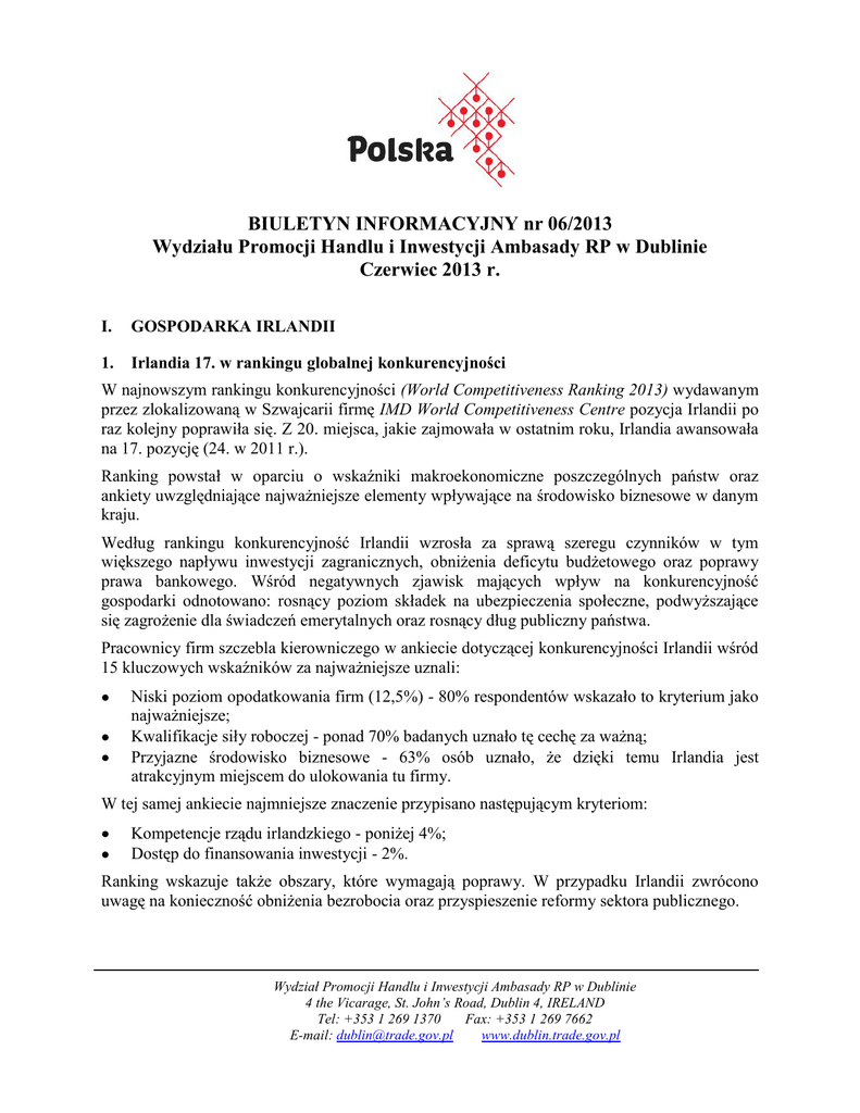 BIULETYN INFORMACYJNY nr 06/2013 Wydziału Promocji Handlu i Inwestycji Ambasady RP w Dublinie Czerwiec 2013 r. I. GOSPODARKA IRLANDII 1. Irlandia 17. w rankingu globalnej konkurencyjności W najnowszym rankingu konkurencyjności (World Competitiveness Ranking 2013) wydawanym przez zlokalizowaną w Szwajcarii firmę IMD World Competitiveness Centre pozycja Irlandii po raz kolejny poprawiła się. Z 20. miejsca, jakie zajmowała w ostatnim roku, Irlandia awansowała na 17. pozycję (24. w 2011 r.). Ranking powstał w oparciu o wskaźniki makroekonomiczne poszczególnych państw oraz ankiety uwzględniające najważniejsze elementy wpływające na środowisko biznesowe w danym kraju. Według rankingu konkurencyjność Irlandii wzrosła za sprawą szeregu czynników w tym większego napływu inwestycji zagranicznych, obniżenia deficytu budżetowego oraz poprawy prawa bankowego. Wśród negatywnych zjawisk mających wpływ na konkurencyjność gospodarki odnotowano: rosnący poziom składek na ubezpieczenia społeczne, podwyższające się zagrożenie dla świadczeń emerytalnych oraz rosnący dług publiczny państwa. Pracownicy firm szczebla kierowniczego w ankiecie dotyczącej konkurencyjności Irlandii wśród 15 kluczowych wskaźników za najważniejsze uznali: Niski poziom opodatkowania firm (12,5%) - 80% respondentów wskazało to kryterium jako najważniejsze; Kwalifikacje siły roboczej - ponad 70% badanych uznało tę cechę za ważną; Przyjazne środowisko biznesowe - 63% osób uznało, że dzięki temu Irlandia jest atrakcyjnym miejscem do ulokowania tu firmy. W tej samej ankiecie najmniejsze znaczenie przypisano następującym kryteriom: Kompetencje rządu irlandzkiego - poniżej 4%; Dostęp do finansowania inwestycji - 2%. Ranking wskazuje także obszary, które wymagają poprawy. W przypadku Irlandii zwrócono uwagę na konieczność obniżenia bezrobocia oraz przyspieszenie reformy sektora publicznego. Wydział Promocji Handlu i Inwestycji Ambasady RP w Dublinie 4 the Vicarage, St. John’s Road, Dublin 4, IRELAND Tel: +353 1 269 1370 Fax: +353 1 269 7662 E-mail: [email protected] www.dublin.trade.gov.pl Wydział Promocji Handlu i Inwestycji Ambasady RP w Dublinie Za najbardziej konkurencyjną gospodarkę świata uznano USA, a w pierwszej dziesiątce znalazły się cztery kraje europejskie - Szwajcaria, Szwecja, Norwegia i Niemcy. Polska zajęła 33 miejsce i w stosunku do poprzedniego roku umocniła się o jedną pozycję. Pełna lista rankingu konkurencyjności dostępna jest na stronie internetowej World Competitiveness Centre (WCC). 2. Nowy program stymulujący rozwój gospodarki irlandzkiej Rząd irlandzki ogłosił program stymulujący rozwój gospodarki, który stworzy nowe miejsca pracy. Na ten cel przeznaczonych zostanie 150 mln EUR pochodzących ze sprzedaży majątku skarbu państwa, w tym głównie licencji w narodowych zakładach losowych – National Lottery. Jak przyznaje minister ds. wydatków publicznych Brendan Howlin wyasygnowana kwota jest skromna jak na możliwości budżetu, jednak stanowi punkt zwrotny po kilku latach znaczących cięć. W ramach programu po 50 mln EUR przeznaczonych zostanie na realizację trzech następujące zadań: naprawę dróg lokalnych, budowę 28 nowych szkół oraz poprawę wydajności energetycznej w 25 tys. lokalach komunalnych. Według założeń rządu powyższy program przyczyni się do stworzenia 3 tys. miejsc pracy. Ogłoszony program jest odrębnym od działań wyznaczonych przez rząd w ubiegłym roku. Wtedy to w ramach planu stymulującego gospodarkę irlandzką planowano przeznaczyć 2,2 mld EUR co miało stworzyć około 13 tys. nowych miejsc pracy. Środki na realizację obecnego programu mają pozwolić na remont dodatkowych 600 km dróg, uruchomienie do końca roku budowy 28 szkół (ministerstwo edukacji dołoży dodatkowe 40 mln EUR, co da łącznie 90 mln EUR na ten cel) oraz obniżenie zużycia energii potrzebnej do ogrzewania w 25 tys. lokalach komunalnych z poziomu G do D w skali efektywności energetycznej (Building Energy Ratings - BER). 3. Produkcja przemysłowa w Irlandii w kwietniu 2013 r. Według wstępnych danych Central Statistics Office (CSO) produkcja przemysłowa firm irlandzkich w kwietniu 2013 r. w wyrażeniu ilościowym zwiększyła się o 3,2% w porównaniu z marcem br. W skali roku, w porównaniu z kwietniem 2012 r., produkcja wzrosła o 1,5%. W kwietniu 2013 r. nowoczesne sektory obejmujące gałęzie związane z zaawansowanymi technologiami i przemysłem chemicznym w porównaniu z marcem br. odnotowały wzrost produkcji w wysokości 7,8%. Natomiast w tzw. sektorach tradycyjnych produkcja zwiększyła się o 0,2%. W wyrażeniu wartościowym produkcja przemysłowa w kwietniu 2013 r. w stosunku do poprzedniego miesiąca zwiększyła się o 1,4%, a w porównaniu z kwietniem 2012 r. indeks ten wzrósł o 6,2%. 4. Inflacja w Irlandii w maju 2013 r. Według danych irlandzkiego Centralnego Urzędu Statystycznego inflacja w Irlandii, mierzona wskaźnikiem cen detalicznych (Consumer Price Index – CPI) w maju 2013 r. zmniejszyła się o 0,1% w stosunku do kwietnia br., zaś w porównaniu z majem 2012 r. zwiększyła się o 0,4%. Największe zmiany cen w ujęciu rocznym odnotowano w takich pozycjach jak: szkolnictwo (+4,8%), napoje alkoholowe i wyroby tytoniowe (+4,3%) oraz towary i usługi różne (+2,2%). W 2 Wydział Promocji Handlu i Inwestycji Ambasady RP w Dublinie tym samym okresie miały miejsce również spadki cen. Wystąpiły one w następujących kategoriach towarów i usług: meble, sprzęt gospodarstwa domowego (-3,3%), odzież i obuwie (-2,7%) oraz łączność (-2,7%). W stosunku do kwietnia 2013 r. spadki cen odnotowano w kategoriach: mieszkalnictwo, woda, energia elektryczna, gaz i pozostałe paliwa opałowe (-0,6%), odzież i obuwie (-0,6%) oraz transport (-0,5%). Roczny wskaźnik inflacji w sektorze usług wyniósł w maju 2013 r. 1,8%, podczas gdy ceny towarów spadły o 1,3%