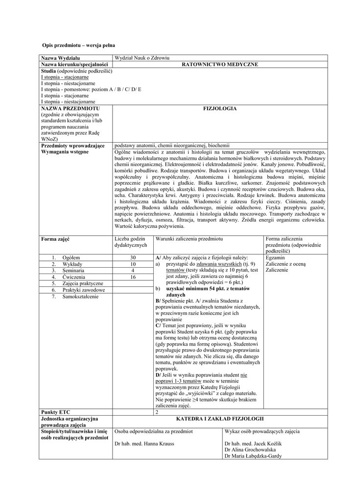 Opis przedmiotu – wersja pełna Wydział Nauk o Zdrowiu Nazwa Wydziału Nazwa kierunku/specjalności RATOWNICTWO MEDYCZNE Studia (odpowiednie podkreślić) I stopnia - stacjonarne I stopnia - niestacjonarne I stopnia - pomostowe: poziom A / B / C/ D/ E I stopnia - stacjonarne I stopnia - niestacjonarne NAZWA PRZEDMIOTU FIZJOLOGIA (zgodnie z obowiązującym standardem kształcenia i/lub programem nauczania zatwierdzonym przez Radę WNoZ) podstawy anatomii, chemii nieorganicznej, biochemii Przedmioty wprowadzające Wymagania wstępne Ogólne wiadomości z anatomii i histologii na temat gruczołów wydzielania wewnętrznego, budowy i molekularnego mechanizmu działania hormonów białkowych i steroidowych. Podstawy chemii nieorganicznej. Elektroujemność i elektrodadatność jonów. Kanały jonowe. Pobudliwość, komórki pobudliwe. Rodzaje transportów. Budowa i organizacja układu wegetatywnego. Układ współczulny i przywspółczulny. Anatomiczna i histologiczna budowa mięśni, mięśnie poprzecznie prążkowane i gładkie. Białka kurczliwe, sarkomer. Znajomość podstawowych zagadnień z zakresu optyki, akustyki. Budowa i czynność receptorów czuciowych. Budowa oka, ucha. Charakterystyka krwi. Antygeny i przeciwciała. Rodzaje krwinek. Budowa anatomiczna i histologiczna układu krążenia. Wiadomości z zakresu fizyki cieczy. Ciśnienia, zasady przepływu. Budowa układu oddechowego, mięśnie oddechowe. Fizyka przepływu gazów, napięcie powierzchniowe. Anatomia i histologia układu moczowego. Transporty zachodzące w nerkach, dyfuzja, osmoza, filtracja, transport aktywny. Źródła energii organizmu człowieka. Wartość kaloryczna pożywienia. Forma zajęć 1. 2. 3. 4. 5. 6. 7. Ogółem Wykłady Seminaria Ćwiczenia Zajęcia praktyczne Praktyki zawodowe Samokształcenie Punkty ETC Jednostka organizacyjna prowadząca zajęcia Stopień/tytuł/nazwisko i imię osób realizujących przedmiot Liczba godzin dydaktycznych 30 10 4 16 Warunki zaliczenia przedmiotu A/ Aby zaliczyć zajęcia z fizjologii należy: a) przystąpić do zdawania wszystkich (tj. 9) tematów (testy składają się z 10 pytań, test jest zdany, jeśli zawiera co najmniej 6 prawidłowych odpowiedzi = 6 pkt.) b) uzyskać minimum 54 pkt. z tematów zdanych B/ Spełnienie pkt. A/ zwalnia Studenta z poprawiania ewentualnych tematów niezdanych, w przeciwnym razie konieczne jest ich poprawianie C/ Temat jest poprawiony, jeśli w wyniku poprawki Student uzyska 6 pkt. (gdy poprawka ma formę testu) lub otrzyma ocenę dostateczną (gdy poprawka ma formę opisową). Studentowi przysługuje prawo do dwukrotnego poprawiania tematów nie zdanych. Nie zlicza się, dla danego tematu, punktów ze sprawdzianu i ewentualnych poprawek. D/ Jeśli w wyniku poprawiania student nie poprawi 1-3 tematów może w terminie wyznaczonym przez Katedrę Fizjologii przystąpić do „wyjściówki” z całego materiału. Nie poprawienie ≥4 tematów skutkuje brakiem zaliczenia zajęć. 2 KATEDRA I ZAKŁAD FIZJOLOGII Forma zaliczenia przedmiotu (odpowiednie podkreślić) Egzamin Zaliczenie z oceną Zaliczenie Osoba odpowiedzialna za przedmiot Wykaz osób prowadzących zajęcia Dr hab. med. Hanna Krauss Dr hab. med. Jacek Koźlik Dr Alina Grochowalska Dr Maria Łabędzka-Gardy Dr Justyna Kupsz Dr Wiesław Uryszek Dr Tomasz Hryniewiecki Dr med. Dorota Nowak Cele przedmiotu (wynikowe - Poznanie podstawowych funkcji organizmu oraz procesów regulujących przebieg czynności dotyczące wiedzy, umiejętności życiowych u człowieka. Rozumienie znaczenia równowagi wewnętrznej oraz kontrolnej i postaw) i regulacyjnej roli układu nerwowego i hormonalnego dla prawidłowego funkcjonowania organizmu. Znajomość fizjologii krwi, budowy i działania układu krążenia, układu oddechowego, mięśni poprzecznie prążkowanych i gładkich, układu pokarmowego, roli składników pokarmowych oraz witamin w żywieniu, działania układu moczowego, znaczenia nerki w utrzymywaniu homeostazy organizmu. Opanowanie umiejętności odróżniania prawidłowego przebiegu procesów życiowych od przebiegu nieprawidłowego, chorobowego. Poznanie i zdolność do samodzielnej interpretacji podstawowych norm fizjologicznych. Umiejętność wykonania podstawowych badań funkcji życiowych. Rozumienie powiązań fizjologii z dyscyplinami klinicznymi. Metody dydaktyczne (sposób Seminaria. Repetytoria. Wykłady. Ćwiczenia. pracy nauczyciela, umożliwiający osiągnięcie celów kształcenia) Prezentacje multimedialne. Dynamometry. Perymetr. Tablice Snellena. Tablice Ishihary. Stroiki. Środki dydaktyczne usprawniające proces nauczania Otoskop. Zestawy do oznaczania grup krwi i parametrów hemostazy. Aparat EKG. Aparaty do mierzenia ciśnienia. Stetoskopy. Spirometr. Cykloergometr. Główne treści programowe z przedmiotu – forma zajęć uwzględniająca kolejność, liczbę godzin, temat i treści nauczania Wykłady Temat i treści nauczania Numer kolejny Liczba godzin 1. 3 Homeostaza. Gospodarka wodna ustroju. Gospodarka kwasowo-zasadowa. Typy sprzężeń zwrotnych. Funkcja poszczególnych układów w zachowaniu homeostazy. 2. 3 Podstawy wydzielania wewnętrznego. Oś podwzgórze-przysadka. 3. 3 Funkcja układu krążenia. UBP. Cykl serca 4. 3 Czynność układu pokarmowego. Trawienie i wchłanianie. Motoryka przewodu pokarmowego. Seminarium Temat i treści nauczania Numer kolejny 1. Liczba godzin 1 + 1/3 Hormony cz.2. Fizjologia gruczołu tarczowego. Metabolizm jodu. Hormony tarczycy. Fizjologia rdzenia nadnerczy. Hormony rdzenia nadnerczy. Fizjologia kory nadnerczy. Mineralokortykosteroidy. Glukokortykosteroidy. Androgeny nadnerczowe. Fizjologia przytarczyc. 2. 1 + 1/3 Fizjologia żywienia. Wartość energetyczna pożywienia. Podstawowa przemiana materii. Całkowita przemiana materii. Rola składników odżywczych – białka; tłuszcze; węglowodany; witaminy; składniki mineralne. 3. 1 + 1/3 Fizjologia układu moczowego. Czynność nerek. Budowa nerki. Nefron. Un