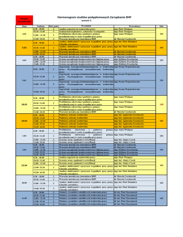 Harmonogram studiów podyplomowych Zarządzanie BHP Kampus Jerozolimskie Data 4.02 semestr 2 Godziny 8.30 - 10.00 10.10- 11.40 12.00 - 13.30 13.40- 15.10 8.30 - 10.00 5.02 4.03 10.10- 11.40 12.00 - 13.30 13.40- 15.10 8.30 - 10.00 10.10- 11.40 12.00 - 13.30 13.40- 15.10 8.30 - 10.00 10.10- 11.40 5.03 12.00 - 13.30 13.40- 15.10 8.30 - 10.00 18.03 10.10- 11.40 12.00 - 13.30 19.03 1.04 2.04 22.04 20.05 21.05 13.40- 15.10 8.30 - 10.00 10.10- 11.40 12.00 - 13.30 13.40- 15.10 15.20- 16.50 Przedmiot Ilość godz. 2 Analiza zagrożeń na stanowisku pracy 2 Seminarium dyplomowe- założenia i wymagania Profilaktyka zdrowotna i podstawy pomocy 2 przedmedycznej w razie wypadku przy pracy Warsztat metodyczny instruktora BHP 2 Analiza okoliczności i przyczyn wypadkow przy pracy. 2 Choroby zawodowe. Analiza okoliczności i przyczyn wypadkow przy pracy. 2 Choroby zawodowe. 2 Warsztat metodyczny instruktora BHP Warsztat metodyczny instruktora BHP 2 2 Warsztat metodyczny instruktora BHP 2 System zarządzania bezpieczeństwem i higieną pracy 2 System zarządzania bezpieczeństwem i higieną pracy System zarządzania bezpieczeństwem i higieną pracy 2 Zagrożenia neuropsychoimmunologiczne w środowisku 2 pracy. Psychospołeczne uwarunkowania środowiska pracy Zagrożenia neuropsychoimmunologiczne w środowisku 2 pracy. Psychospołeczne uwarunkowania środowiska pracy Zagrożenia neuropsychoimmunologiczne w środowisku 2 pracy. Psychospołeczne uwarunkowania środowiska pracy Zagrożenia neuropsychoimmunologiczne w środowisku 2 pracy. Psychospołeczne uwarunkowania środowiska pracy Profilaktyka zdrowotna i podstawy pomocy 2 przedmedycznej w razie wypadku przy pracy Profilaktyka zdrowotna i podstawy pomocy 2 przedmedycznej w razie wypadku przy pracy Profilaktyka zdrowotna i podstawy pomocy 2 przedmedycznej w razie wypadku przy pracy Warsztat metodyczny instruktora BHP 2 Podstawy ochrony środowiska 2 Podstawy ochrony środowiska 2 Podstawy ochrony środowiska 2 Podstawy ochrony środowiska 2 Podstawy ochrony środowiska 2 8.30 - 10.00 2 10.10- 11.40 2 12.00 - 13.30 13.40- 15.10 8.30 - 10.00 10.10- 11.40 12.00 - 13.30 13.40- 15.10 15.20- 16.50 8.30 - 10.00 10.10- 11.40 12.00 - 13.30 2 2 2 2 2 2 2 2 2 2 13.40- 15.10 2 15.20- 16.50 2 8.30 - 10.00 10.10- 11.40 2 2 12.00 - 13.30 2 13.40- 15.10 2 8.30 - 10.00 10.10- 11.40 12.00 - 13.30 13.40- 15.10 15.20- 16.50 2 2 2 2 2 Profilaktyka zdrowotna i podstawy pomocy przedmedycznej w razie wypadku przy pracy Profilaktyka zdrowotna i podstawy pomocy przedmedycznej w razie wypadku przy pracy Systemy oceny zgodności i certyfikacji Systemy oceny zgodności i certyfikacji Warsztat metodyczny instruktora BHP Warsztat metodyczny instruktora BHP System zarządzania bezpieczeństwem i higieną pracy System zarządzania bezpieczeństwem i higieną pracy System zarządzania bezpieczeństwem i higieną pracy Analiza zagrożeń na stanowisku pracy Systemy oceny zgodności i certyfikacji Systemy oceny zgodności i certyfikacji Analiza okoliczności i przyczyn wypadkow przy pracy. Choroby zawodowe. Analiza okoliczności i przyczyn wypadkow przy pracy. Choroby zawodowe. Warsztat metodyczny instruktora BHP Warsztat metodyczny instruktora BHP Analiza okoliczności i przyczyn wypadkow przy pracy. Choroby zawodowe. Analiza okoliczności i przyczyn wypadkow przy pracy. Choroby zawodowe. Pomiary czynników szkodliwych środowiska pracy Pomiary czynników szkodliwych środowiska pracy Pomiary czynników szkodliwych środowiska pracy Pomiary czynników szkodliwych środowiska pracy Pomiary czynników szkodliwych środowiska pracy Prowadzący mgr Piotr Wielgosz mgr Piotr Wielgosz mgr Anna Wielgosz Sala 131 dr Marcin Czechowski mgr inż. Piotr Dziadura mgr inż. Piotr Dziadura dr Marcin Czechowski dr Marcin Czechowski dr Marcin Czechowski mgr Elżbieta Przecherka mgr Elżbieta Przecherka mgr Elżbieta Przecherka mgr Iwona Wojciechowska 131 131 mgr Iwona Wojciechowska mgr Iwona Wojciechowska 131 mgr Iwona Wojciechowska mgr Anna Wielgosz mgr Anna Wielgosz 129 mgr Anna Wielgosz dr Marcin Czechowski mgr inż. Agnieszka Grzelaczyk mgr inż. Agnieszka Grzelaczyk mgr inż. Agnieszka Grzelaczyk mgr inż. Agnieszka Grzelaczyk mgr inż. Agnieszka Grzelaczyk 131 mgr Anna Wielgosz mgr Anna Wielgosz mgr inż. Alojzy Czech mgr inż. Alojzy Czech dr Marcin Czechowski dr Marcin Czechowski mgr Elżbieta Przecherka mgr Elżbieta Przecherka mgr Elżbieta Przecherka mgr Piotr Wielgosz mgr inż. Alojzy Czech mgr inż. Alojzy Czech mgr inż. Piotr Dziadura 131 131 131 mgr inż. Piotr Dziadura dr Marcin Czechowski dr Marcin Czechowski mgr inż. Piotr Dziadura 131 mgr inż. Piotr Dziadura dr inż. Piotr Kaczmarek dr inż. Piotr Kaczmarek dr inż. Piotr Kaczmarek dr inż. Piotr Kaczmarek dr inż. Piotr Kaczmarek 131