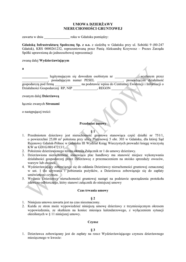 UMOWA DZIERŻAWY NIERUCHOMOŚCI GRUNTOWEJ zawarta w dniu _______________ roku w Gdańsku pomiędzy: Gdańską Infrastrukturą Społeczną Sp. z o.o. z siedzibą w Gdańsku przy ul. Sobótki 9 (80-247 Gdańsk), KRS 0000261232, reprezentowaną przez Panią Aleksandrę Krzywosz – Prezes Zarządu Spółki uprawnioną do jednoosobowej reprezentacji zwaną dalej Wydzierżawiającym a _______________ legitymującym się dowodem osobistym nr ______________ wydanym przez _______________, posiadającym numer PESEL _______________, prowadzącym działalność gospodarczą pod firmą _______________ na podstawie wpisu do Centralnej Ewidencji i Informacji o Działalności Gospodarczej RP, NIP ______________, REGON ______________. zwanym dalej Dzierżawcą łącznie zwanych Stronami o następującej treści: Przedmiot umowy §1 1. Przedmiotem dzierżawy jest nieruchomość gruntowa stanowiąca część działki nr 751/1, o powierzchni 25,00 m² położona przy ulicy Platynowej 5 obr. 303 w Gdańsku, dla której Sąd Rejonowy Gdańsk-Północ w Gdańsku III Wydział Ksiąg Wieczystych prowadzi księgę wieczystą KW nr GD1G/00147213/1. 2. Położenie dzierżawionego terenu określa Załącznik nr 1 do umowy dzierżawy. 3. Dzierżawiona nieruchomość stanowiąca plac handlowy ma stanowić miejsce wykonywania działalności gospodarczej przez Dzierżawcę z przeznaczeniem na stoisko sprzedaży owoców, warzyw lub choinek. 4. Wydzierżawiający zobowiązuje się do oddania Dzierżawcy nieruchomości gruntowej oznaczonej w ust. 1 do używania i pobierania pożytków, a Dzierżawca zobowiązuje się do zapłaty umówionego czynszu. 5. Wydanie Dzierżawcy nieruchomości gruntowej nastąpi na podstawie sporządzenia protokołu zdawczo-odbiorczego, który stanowi załącznik do niniejszej umowy Czas trwania umowy §2 1. Niniejsza umowa zawarta jest na czas nieoznaczony. 2. Każda ze stron może wypowiedzieć niniejszą umowę dzierżawy z trzymiesięcznym okresem wypowiedzenia, ze skutkiem na koniec miesiąca kalendarzowego, z wyłączeniem sytuacji określonych w § 11 niniejszej umowy. Czynsz §3 1. Dzierżawca zobowiązany jest do zapłaty na rzecz Wydzierżawiającego czynszu dzierżawnego miesięcznego w kwocie: 1) w okresie 01.05. – 30.09. danego roku __________ zł netto plus obowiązujący podatek VAT. 2) w okresie 01.10. – 30.04. danego roku __________ zł netto plus obowiązujący podatek VAT. 2. Dzierżawca zobowiązany jest do zawarcia odrębnych umów na dostawę mediów niezbędnych do prowadzenia działalności gospodarczej. §4 1. Czynsz, o którym mowa w § 3 niniejszej umowy Dzierżawca zobowiązany jest uiścić na podstawie miesięcznej faktury wystawionej przez Gdańską Infrastrukturę Społeczną sp. z o.o., zgodnie z obowiązującymi przepisami w terminie 14 dni od ich wystawienia. 2. Wysokość czynszu dzierżawnego może ulec zmianie bez konieczności zmiany umowy dzierżawy z chwilą zmiany przepisów podatkowych w zakresie podatku od towarów i usług. 3. Czynsz dzierżawny, o którym mowa w § 3 ust. 1 podlega corocznej waloryzacji przy zastosowaniu wskaźników zmiany cen nieruchomości ogłaszanych przez Prezesa Głównego Urzędu Statystycznego w Monitorze Polskim za rok poprzedni. 4. Zwaloryzowana stawka czynszu dzierżawnego obowiązuje od dnia 1 maja każdego następnego roku kalendarzowego. 5. Ustalenie wysokości zwaloryzowanej stawki czynszu dzierżawnego następuje w drodze jednostronnego pisemnego oświadczenia Wydzierżawiającego. §5 1. Czynsz dzierżawny, o którym mowa w § 3 ust. 1 niniejszej umowy regulowany będzie przelewem bankowym na rachunek Wydzierżawiającego wskazany w wystawionej przez niego fakturze. 2. Za dzień zapłaty Strony ustalają dzień uznania wpłaty na rachunku bankowym Wydzierżawiającego. 3. W przypadki opóźnienia Dzierżawcy w płatności czynszu, Wydzierżawiającemu przysługuje prawo do naliczania odsetek ustawowych za opóźnienie. Obowiązki Dzierżawcy §6 1. Dzierżawca zobowiązany jest do korzystania z nieruchomości gruntowej zgodnie z jej przeznaczeniem. 2. Dzierżawca zobowiązany jest utrzymywać porządek i czystość na dzierżawionym terenie oraz utrzymać w należnym stanie technicznym i estetycznym jego otoczenie. Zgodnie z uchwałą nr VI/95/15 Rady Miasta Gdańska z dnia 26 lutego 2015 roku w sprawie Regulaminu utrzymania czystości i porządku na terenie miasta Gdańska. Do obowiązków Dzierżawcy należy również zapewnienie czystości oraz usuwanie śniegu, błota i lodu na chodnikach wzdłuż dzierżawionej nieruchomości. 3. Dzierżawca jest zobowiązany do przestrzegania przepisów prawno-administracyjnych i zachowania wymogów ekologicznych w zakresie ochrony i konserwacji dóbr przyrody i kultury podczas eksploatacji dzierżawionego terenu, §7 1. Do obowiązków Dzierżawcy w związku z prowadzoną przez niego działalnością należy również: a) używanie terenu z należytą starannością zgodnie ze złożoną i przyjętą ofertą działalności; b) nie dokonywanie bez zgody Wydzierżawiającego zmian naruszających strukturę terenu; c) postawienie pojemników na wydzielonym terenie na gromadzenie nieczystości powstałych w wyniku prowadzonej działalności oraz ich usuwanie na własny koszt na podstawie umowy zawartej z uprawnionym podmiotem lub na podstawie złożenia deklaracji DO-2 do Zarządu Dróg i Zieleni w Gdańsku; d) przestrzeganie przepisów administracyjno-porządkowych oraz stosowanie się do zarządzeń sanitarnych i przeciwpożarowych; e) uzyskanie zgody Wydzierżawiającego na założenie na terenie informacji lub reklamy i zawarcia w tym przedmiocie umowy z Wydzierżawiającym. 2. Dzierżawca musi uzyskać zgodę Wydzierżawiającego na zmianę sposobu wykorzystania dzierżawionej nieruchomości na inny cel niż określony w ofercie i w niniejszej umowie. §8 1. Dzierżawca powinien ubezpieczyć od ognia i innych zdarzeń losowych na własny koszt wyposażenie, stanowiące j