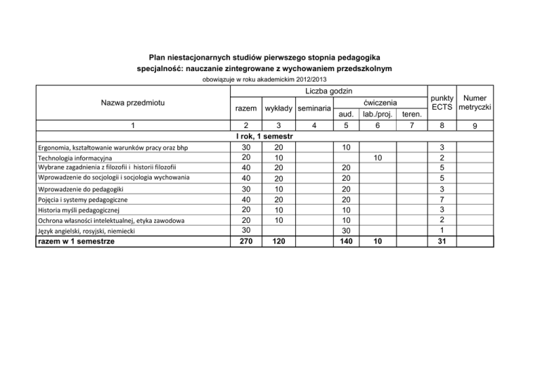 Plan niestacjonarnych studiów pierwszego stopnia pedagogika specjalność: nauczanie zintegrowane z wychowaniem przedszkolnym obowiązuje w roku akademickim 2012/2013 Liczba godzin Nazwa przedmiotu 1 Ergonomia, kształtowanie warunków pracy oraz bhp Technologia informacyjna Wybrane zagadnienia z filozofii i historii filozofii Wprowadzenie do socjologii i socjologia wychowania Wprowadzenie do pedagogiki Pojęcia i systemy pedagogiczne Historia myśli pedagogicznej Ochrona własności intelektualnej, etyka zawodowa Język angielski, rosyjski, niemiecki razem w 1 semestrze razem wykłady seminaria 2 3 I rok, 1 semestr 30 20 20 10 40 20 40 20 30 10 40 20 20 10 20 10 30 270 120 4 punkty Numer ECTS metryczki ćwiczenia aud. 5 lab./proj. 6 10 10 20 20 20 20 10 10 30 140 10 teren. 7 8 3 2 5 5 3 7 3 2 1 31 9 Pedagogika społeczna Podstawy wiedzy o języku i umiejętności językowych Podstawy matematyki Podstawy wiedzy przyrodniczej Emisja głosu Biomedyczne podstawy rozwoju, edukacja zdrowotna Logopedia Podstawy prawne i organizacyjne oświaty i zawodu nauczyciela Język angielski, rosyjski, niemiecki razem w 2 semestrze Wprowadzenie do psychologii Psychologia rozwojowa i osobowości Teoretyczne podstawy wychowania Pedagogika specjalna Diagnostyka i terapia pedagogiczna Praktyka psychologiczno-pedagogiczna Język angielski, rosyjski, niemiecki razem w 3 semestrze I rok, 2 semestr 30 20 30 10 30 10 30 10 20 30 20 50 20 20 10 30 270 100 II rok, 3 semestr 40 20 40 20 40 20 20 50 50 20 30 30 280 100 10 20 20 20 20 10 30 10 30 170 3 3 3 3 2 6 6 2 1 29 20 20 20 30 30 30 30 150 30 5 5 5 6 6 2 1 30 Elementy teorii przekazu, media w edukacji Podstawy dydaktyki ogólnej Psychologia dziecka Teoretyczne podstawy integracji Teoria i metodyka kształcenia zintegrowanego Literatura dziecięca Język angielski, rosyjski, niemiecki razem w 4 semestrze Teoria i metodyka wychowania przedszkolnego Kształtowanie kompetencji językowych dziecka Kształtowanie kompetencji matematycznych dziecka Edukacja przyrodnicza dziecka Edukacja muzyczna dziecka Seminarium licencjackie Praktyka dydaktyczna razem w 5 semestrze Edukacja plastyczna dziecka Edukacja techniczna i informatyczna dziecka Kultura fizyczna w edukacji wczesnoszkolnej Praca korekcyjno – wyrównawcza Seminarium licencjackie razem w 6 semestrze razem II rok, 4 semestr 40 20 40 20 30 10 30 20 60 30 20 10 30 250 110 III rok, 5 semestr 60 30 50 20 50 20 40 20 20 40 10 120 370 110 III rok, 6 semestr 40 20 50 20 40 20 50 20 40 220 1660 80 620 20 20 20 10 30 10 30 140 6 6 3 3 7 3 2 30 30 30 30 20 20 10 10 120 120 130 20 30 20 30 5 5 4 5 9 100 830 28 180 40 40 50 7 5 5 5 5 1 4 32 10 150