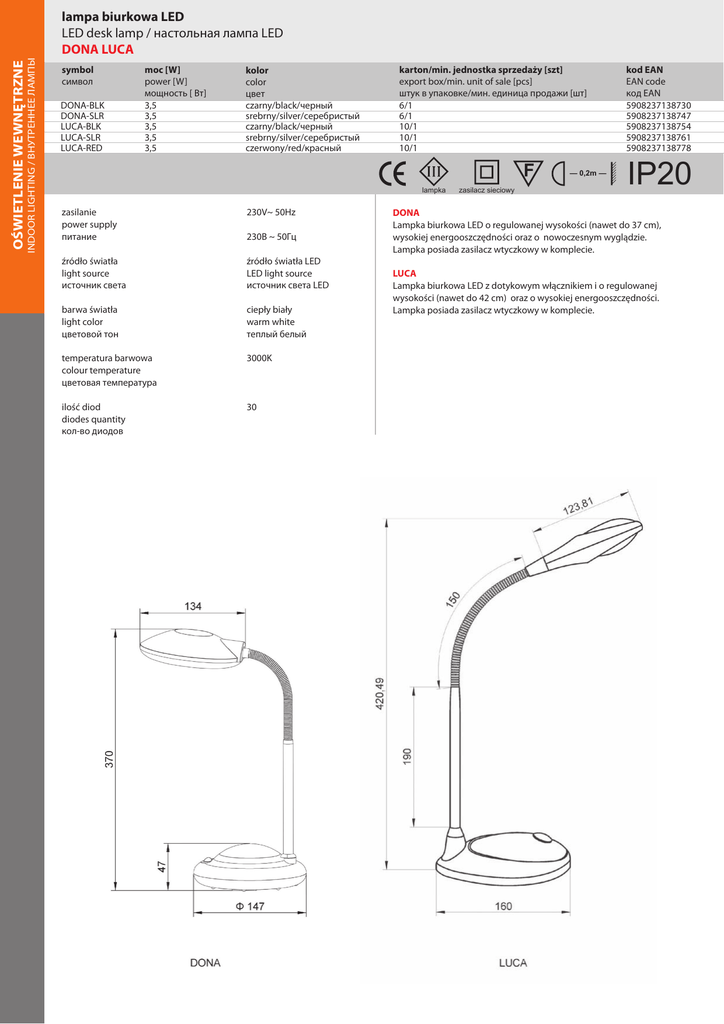 OŚWIETLENIE WEWNĘTRZNE INDOOR LIGHTING / ВНУТРЕННЕЕ ЛАМПЫ lampa biurkowa LED LED desk lamp / настольная лампа LED DONA LUCA symbol символ DONA-BLK DONA-SLR LUCA-BLK LUCA-SLR LUCA-RED moc [W] power [W] мощность [ Вт] 3,5 3,5 3,5 3,5 3,5 kolor color цвет czarny/black/черный srebrny/silver/серебристый czarny/black/черный srebrny/silver/серебристый czerwony/red/красный karton/min. jednostka sprzedaży [szt] export box/min. unit of sale [pcs] штук в упаковке/мин. единица продажи [шт] 6/1 6/1 10/1 10/1 10/1 — 0,2m — lampka zasilanie power supply питание 230V~ 50Hz źródło światła light source источник света źródło światła LED LED light source источник света LED barwa światła light color цветовой тон ciepły biały warm white теплый белый temperatura barwowa colour temperature цветовая температура 3000K ilość diod diodes quantity кол-во диодов 30 230В ~ 50Гц zasilacz sieciowy kod EAN EAN code код EAN 5908237138730 5908237138747 5908237138754 5908237138761 5908237138778 IP20 DONA Lampka biurkowa LED o regulowanej wysokości (nawet do 37 cm), wysokiej energooszczędności oraz o nowoczesnym wyglądzie. Lampka posiada zasilacz wtyczkowy w komplecie. LUCA Lampka biurkowa LED z dotykowym włącznikiem i o regulowanej wysokości (nawet do 42 cm) oraz o wysokiej energooszczędności. Lampka posiada zasilacz wtyczkowy w komplecie. LUCA DONA LED desk lamp features adjustable height (up to 37cm), high energy efficiency and modern design. AC power plug is included in the set. LUCA LED desk lamp with a touch switch features adjustable height (up to 42cm) and high energy efficiency. AC power plug is included in the set. DONA Настольная лампа LED характеризуется регулируемой высотой (до 37см), высокой энергетической эффективностью и современным дизайном. Силовая вилка для переменного тока включена в комплект. LUCA Настольная лампа LED с сенсорным переключателем характеризуется регулируемой высотой (до 42см) и высокой энергетической эффективностью. Силовая вилка для переменного тока включена в комплект. Apollo Electronics Poleczki 13 02-822 Warszawa phone +48 22 46 45 999 fax +48 22 46 45 811 [email protected] www.apollo.eu INDOOR LIGHTING / ВНУТРЕННЕЕ ЛАМПЫ OŚWIETLENIE WEWNĘTRZNE DONA