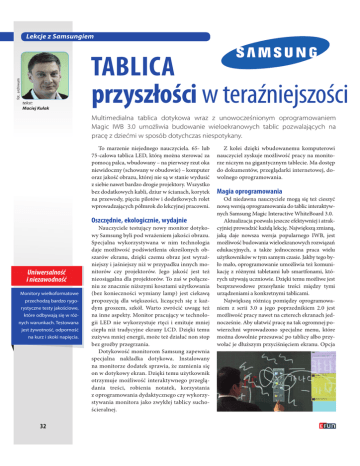 fot. archiwum Lekcje z Samsungiem tekst: Maciej Kułak TABLICA przyszłości w teraźniejszości Multimedialna tablica dotykowa wraz z unowocześnionym oprogramowaniem Magic IWB 3.0 umożliwia budowanie wieloekranowych tablic pozwalających na pracę z dziećmi w sposób dotychczas niespotykany. To marzenie niejednego nauczyciela. 65- lub 75-calowa tablica LED, którą można sterować za pomocą palca, wbudowany – na pierwszy rzut oka niewidoczny (schowany w obudowie) – komputer oraz jakość obrazu, której nie są w stanie wydusić z siebie nawet bardzo drogie projektory. Wszystko bez dodatkowych kabli, dziur w ścianach, korytek na przewody, pięciu pilotów i dodatkowych rolet wprowadzających półmrok do lekcyjnej pracowni. Oszczędnie, ekologicznie, wydajnie Uniwersalność i niezawodność Monitory wielkoformatowe przechodzą bardzo rygorystyczne testy jakościowe, które odbywają się w różnych warunkach. Testowana jest żywotność, odporność na kurz i skoki napięcia. 32 Nauczyciele testujący nowy monitor dotykowy Samsung byli pod wrażeniem jakości obrazu. Specjalna wykorzystywana w nim technologia daje możliwość podświetlenia określonych obszarów ekranu, dzięki czemu obraz jest wyraźniejszy i jaśniejszy niż w przypadku innych monitorów czy projektorów. Jego jakość jest też nieosiągalna dla projektorów. To zaś w połączeniu ze znacznie niższymi kosztami użytkowania (bez konieczności wymiany lamp) jest ciekawą propozycją dla większości, liczących się z każdym groszem, szkół. Warto zwrócić uwagę też na inne aspekty. Monitor pracujący w technologii LED nie wykorzystuje rtęci i emituje mniej ciepła niż tradycyjne ekrany LCD. Dzięki temu zużywa mniej energii, może też działać non stop bez groźby przegrzania. Dotykowość monitorom Samsung zapewnia specjalna nakładka dotykowa. Instalowany na monitorze dodatek sprawia, że zamienia się on w dotykowy ekran. Dzięki temu użytkownik otrzymuje możliwość interaktywnego przeglądania treści, robienia notatek, korzystania z oprogramowania dydaktycznego czy wykorzystywania monitora jako zwykłej tablicy suchościeralnej. Z kolei dzięki wbudowanemu komputerowi nauczyciel zyskuje możliwość pracy na monitorze niczym na gigantycznym tablecie. Ma dostęp do dokumentów, przeglądarki internetowej, dowolnego oprogramowania. Magia oprogramowania Od niedawna nauczyciele mogą się też cieszyć nową wersją oprogramowania do tablic interaktywnych Samsung Magic Interactive WhiteBoard 3.0. Aktualizacja pozwala jeszcze efektywniej i atrakcyjniej prowadzić każdą lekcję. Największą zmianą, jaką daje nowsza wersja popularnego IWB, jest możliwość budowania wieloekranowych rozwiązań edukacyjnych, a także jednoczesna praca wielu użytkowników w tym samym czasie. Jakby tego było mało, oprogramowanie umożliwia też komunikację z różnymi tabletami lub smartfonami, których używają uczniowie. Dzięki temu możliwe jest bezprzewodowe przesyłanie treści między tymi urządzeniami a konkretnymi tablicami. Największą różnicą pomiędzy oprogramowaniem z serii 3.0 a jego poprzednikiem 2.0 jest możliwość pracy nawet na czterech ekranach jednocześnie. Aby ułatwić pracę na tak ogromnej powierzchni wprowadzono specjalne menu, które można dowolnie przesuwać po tablicy albo przywołać je dłuższym przyciśnięciem ekranu. Opcja Promocja Multi-Screen pozwala ponadto na stworzenie wielkoformatowej, dostosowanej kształtem do indywidualnych potrzeb, tablicy obsługiwanej przez jedno wspólne menu. Specjalny tryb Multi-User z kolei umożliwia równoległą i niezależną pracę kilku osób na poszczególnych ekranach. Znacznym udogodnieniem wprowadzonym przez projektantów nowego oprogramowania jest możliwość sterowania tablicą interaktywną przy pomocy intuicyjnych dwupunktowych gestów, znanych np. użytkownikom smartfonów czy tabletów. Ciekawostek jest więcej. Poprzez wyrysowanie palcem okręgu w dowolnym miejscu ekranu można natychmiast zapisać w pamięci urządzenia widok całej tablicy. Narysowanie wirtualnego prostokąta zamieni otoczoną nim treść w notatkę, którą nauczyciel może przesłać wszystkim uczniom. Nowością i sporym ułatwieniem jest też możliwość precyzyjnego wycinania zapisanych na tablicy treści poprzez odręczne ich obrysowanie (zamiast zaznaczania ich klasycznym prostokątem). Zawarta w oprogramowaniu MagicIWB 3.0 przeglądarka dokumentów pozwala korzystać z plików PDF, Microsoft Office (Word, Excel, PowerPoint) a także obrazów oraz filmów wideo i dokonywać na nich odręcznych adnotacji – zarówno z poziomu tablicy interaktywnej, jak i urządzeń mobilnych uczniów. Pismo ręczne może ponadto być automatycznie konwertowane na tekst, który można wkleić do dokumentu. Praca w grupach z użyciem nowego IWB Dzięki nowemu oprogramowaniu praca metodą projektów – czy najzwyklejsza praca w grupach – jest niezwykłą gratką dla uczniów. Specjalne funkcje File Sharing i Document Sharing umożliwiają bowiem, jednoczesną pracę wielu osób nad tym samym plikiem zapisanym we współdzielonym folderze sieciowym. Zarządzanie przeglądanymi oraz stworzonymi podczas zajęć plikami odbywa się przy pomocy aplikacji File Manager, która pozwala nauczycielom uporządkować organizację pracy z uczniami. W porównaniu z poprzednimi edycjami oprogramowania IWB, w wersji 3.0 przeglądarkę internetową można ponadto otwierać jako jedno z wielu okien na ekranie, bez konieczności zamykania widoku tablicy. Wśród opcji dostępnych dla prowadzącego zajęcia dostępne są też zaawansowane narzędzia zarządzania klasą: tworzenie i edytowanie grup, udostępnianie widoku tablicy na urządzenia uczniów oraz odwrotnie – z tabletów na tablicę, blokowanie uczniom dostępu do aplikacji, internetu a nawet zdalnie wyłączanie ich urządzeń. Nauczyciel może w każdej chwili podejrzeć, który z uczniów jest zalogowany