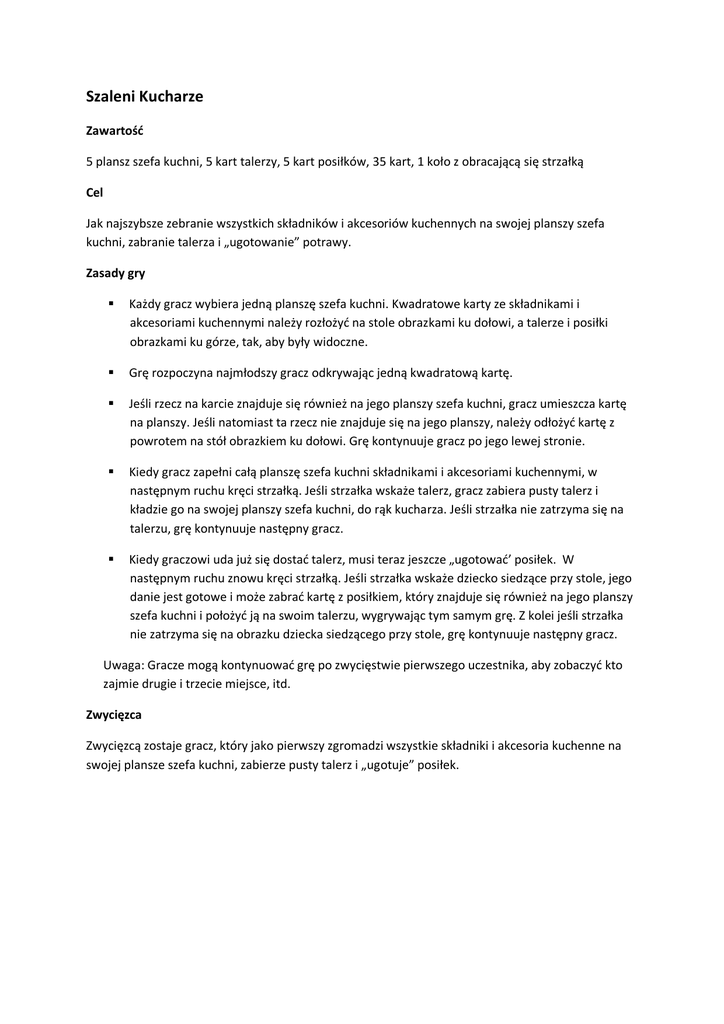 Szaleni Kucharze Zawartość 5 plansz szefa kuchni, 5 kart talerzy, 5 kart posiłków, 35 kart, 1 koło z obracającą się strzałką Cel Jak najszybsze zebranie wszystkich składników i akcesoriów kuchennych na swojej planszy szefa kuchni, zabranie talerza i „ugotowanie” potrawy. Zasady gry Każdy gracz wybiera jedną planszę szefa kuchni. Kwadratowe karty ze składnikami i akcesoriami kuchennymi należy rozłożyć na stole obrazkami ku dołowi, a talerze i posiłki obrazkami ku górze, tak, aby były widoczne. Grę rozpoczyna najmłodszy gracz odkrywając jedną kwadratową kartę. Jeśli rzecz na karcie znajduje się również na jego planszy szefa kuchni, gracz umieszcza kartę na planszy. Jeśli natomiast ta rzecz nie znajduje się na jego planszy, należy odłożyć kartę z powrotem na stół obrazkiem ku dołowi. Grę kontynuuje gracz po jego lewej stronie. Kiedy gracz zapełni całą planszę szefa kuchni składnikami i akcesoriami kuchennymi, w następnym ruchu kręci strzałką. Jeśli strzałka wskaże talerz, gracz zabiera pusty talerz i kładzie go na swojej planszy szefa kuchni, do rąk kucharza. Jeśli strzałka nie zatrzyma się na talerzu, grę kontynuuje następny gracz. Kiedy graczowi uda już się dostać talerz, musi teraz jeszcze „ugotować’ posiłek. W następnym ruchu znowu kręci strzałką. Jeśli strzałka wskaże dziecko siedzące przy stole, jego danie jest gotowe i może zabrać kartę z posiłkiem, który znajduje się również na jego planszy szefa kuchni i położyć ją na swoim talerzu, wygrywając tym samym grę. Z kolei jeśli strzałka nie zatrzyma się na obrazku dziecka siedzącego przy stole, grę kontynuuje następny gracz. Uwaga: Gracze mogą kontynuować grę po zwycięstwie pierwszego uczestnika, aby zobaczyć kto zajmie drugie i trzecie miejsce, itd. Zwycięzca Zwycięzcą zostaje gracz, który jako pierwszy zgromadzi wszystkie składniki i akcesoria kuchenne na swojej plansze szefa kuchni, zabierze pusty talerz i „ugotuje” posiłek.