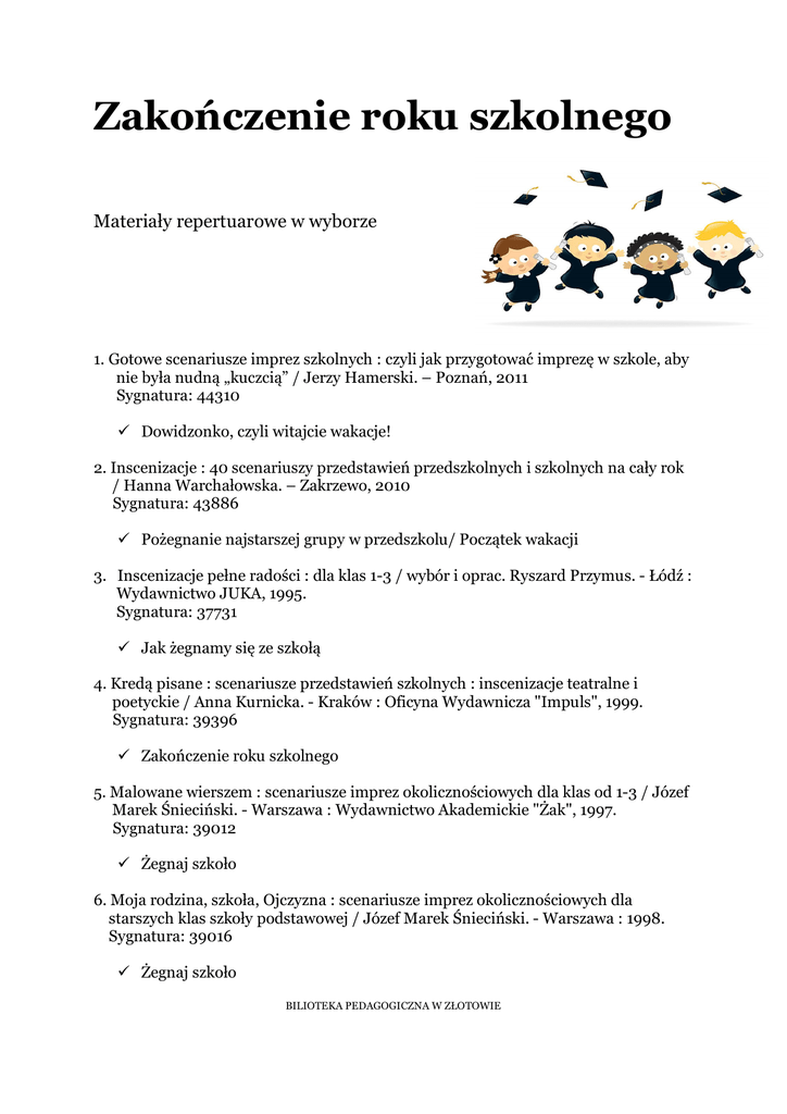 Zakończenie roku szkolnego Materiały repertuarowe w wyborze 1. Gotowe scenariusze imprez szkolnych : czyli jak przygotować imprezę w szkole, aby nie była nudną „kuczcią” / Jerzy Hamerski. – Poznań, 2011 Sygnatura: 44310 Dowidzonko, czyli witajcie wakacje! 2. Inscenizacje : 40 scenariuszy przedstawień przedszkolnych i szkolnych na cały rok / Hanna Warchałowska. – Zakrzewo, 2010 Sygnatura: 43886 Pożegnanie najstarszej grupy w przedszkolu/ Początek wakacji 3. Inscenizacje pełne radości : dla klas 1-3 / wybór i oprac. Ryszard Przymus. - Łódź : Wydawnictwo JUKA, 1995. Sygnatura: 37731 Jak żegnamy się ze szkołą 4. Kredą pisane : scenariusze przedstawień szkolnych : inscenizacje teatralne i poetyckie / Anna Kurnicka. - Kraków : Oficyna Wydawnicza "Impuls", 1999. Sygnatura: 39396 Zakończenie roku szkolnego 5. Malowane wierszem : scenariusze imprez okolicznościowych dla klas od 1-3 / Józef Marek Śnieciński. - Warszawa : Wydawnictwo Akademickie "Żak", 1997. Sygnatura: 39012 Żegnaj szkoło 6. Moja rodzina, szkoła, Ojczyzna : scenariusze imprez okolicznościowych dla starszych klas szkoły podstawowej / Józef Marek Śnieciński. - Warszawa : 1998. Sygnatura: 39016 Żegnaj szkoło BILIOTEKA PEDAGOGICZNA W ZŁOTOWIE 7. Na szkolnej scenie / Elżbieta Gałczyńska, Elżbieta Szczepańska, Urszula Wójcik. Płock : Korepetytor, 1997. Sygnatura: 39375 Hej, jak miło jest w wakacje Ostatnia lekcja 8. Przedstawienia i uroczystości : inscenizacje dla klas 0-3 / Elżbieta ŚnieżkowskaBielak. - Warszawa : Dr Josef Raabe. Spółka Wydawnicza, 2013 Sygnatura: 45997 Pożegnanie szkoły 9. Scenariusze przedstawień szkolnych / Ewa Bajon. - Sopot : 2011 Sygnatura: 44425 Pożegnanie szkoły Bohaterowie literaccy żegnają szóste klasy 10. Scenariusze szkolnych przedstawień teatralnych dla szkół podstawowych / Zofia Kaliska, Beata Jacewicz. - Białystok : Wydawnictwo Printex, 2010.\ Sygnatura: 43800 Na pożegnanie szkoły 11. Scenariusze uroczystości szkolnych dla klas 4-6 szkoły podstawowej / [tekst : Bożena Pierga]. - Poznań : Wydawnictwo IBIS, 2011. Sygnatura: 44322 Szczęśliwej drogi, już czas Wakacje czas zacząć! 12. Scenariusze uroczystości szkolnych : gimnazjum i szkoły ponadgimnazjalne. Cz. 2. - Kraków : Wydawnictwo Rubikon, 2005. Sygnatura: 41758, 45653 Egzamin 13. Słowa jak kwiaty : [scenariusze imprez] / Józef Marek Śnieciński. - Warszawa : Wydawnictwo "Żak", 1995. Sygnatura: 38012 Żegnaj szkoło 14. Święta, święta... : wybór konspektów / red. Dorota Grabowska. - Warszwa : Wydawnictwo Stowarzyszenia Bibliotekarzy Polskich, 2007. Sygnatura: 42537 Wyciągnij dłonie i chwyć marzenie BILIOTEKA PEDAGOGICZNA W ZŁOTOWIE 15. Wszystko gra : wybór materiałów repertuarowych „Biblioteki w Szkole” / red. Katarzyna Świderska-Nowicka. - Warszawa : Agencja SUKURS, 2007. Sygnatura: 42687 Niezwykła podróż. Scenariusz inscenizacji Kabaret starszych uczniów Artykuły z czasopism 1. BISKUP Alina. Niezwykła podróż: inscenizacja na pożegnanie roku szkolnego // Bibl. w Szk. - 2004 nr 4 s. 28-29 2. CHYLANKA Irena. Żegnaj szkoło // Nauczanie Początkowe - 1989/90 nr 6 s. 614622 3. CZYŻYK, Ewa . Kopciuszek XXI w. : scenariusz przedstawienia / Ewa Czyżyk // Biblioteka w Szkole. – 2012, nr 2, s. 20!22 4. DOBROWOLSKA Anna. Happening na zakończenie roku szkolnego w szkole podstawowej // Bibl. w Szk. - 2001 nr 4 s. 32 5. FERDYNUS, Urszula. Duchy szkoły : przedstawienie : pożegnanie absolwentów / Urszula Ferdynus // Biblioteka w Szkole. ! 2013, nr 4, s. 28!29 6. HAJDUGA-KWAPISZ Teresa, KONRAD Alfreda. Znów minął rok: scenariusz uroczystości na zakończenie roku szkolnego // Por. Bibl. - 2001 nr 5 s. 28-31 7. JACHIMCZAK Wanda Barbara. Po ten kwiat paproci: scenariusz słowno-muzyczny // Bibl. w Szk. - 2004 nr 4 s. 32-33 8. JACHIMCZAK Wanda Barbara. Modlitwa polskiego żołnierza : scenariusz z okazji Narodowego Święta Niepodległości // Biblioteka w Szkole. - 2012, [nr] 9, s. 24-26 9. JAKUBOWSKA Małgorzata. O czym każdy musi wiedzieć, kiedy na wakacje jedzie... // Życie Szk. - 2008 nr 6 s. 44-46 10. KOŁODZIEJ Irena. Lato, lato: inscenizacja zakończenia roku szkolnego // Wychowawca - 2005 nr 6 s. 25 11. KRZYŻANOWSKA Anna. Scenariusz pantomimy na zakończenie roku szkolnego w szkole ponadgimnazjalnej // Bibl. w Szk. - 2001 nr 4 s. 29-31 12. KUNCEWICZ-DYGAŁA Danuta. Między nami - uczniami a profesorami // Por. Bibl. - 1997 nr 5 s. 26-28 BILIOTEKA PEDAGOGICZNA W ZŁOTOWIE 13. KUPIEC Krystyna. Żegnamy rok szkolny na wesoło: [scenariusz dla szkoły podstawowej] // Por. Bibl. - 1998 nr 6 s. 30-32 14. LEKSOWSKA Lidia, SUPRONOWICZ Iwona. Witajcie wakacje. Inscenizacja na uroczyste zakończenie roku szkolnego: [dla młodszych dzieci] // Por. Bibl. - 1992 nr 4 s. 17-19 15. MENCEL-GWIZDAŁA Joanna. Kraina palaczy: [scenariusz przeznaczony na rozpoczęcie lub zakończenie roku szkolnego, Ogólnoświatowy Dzień Rzucania Palenia, realizację wychowania ekologicznego w szkole] // Bibl. w Szk. - 2001 nr 3 s. 15 16. OSIAK Elżbieta. Kabaret Starszych Uczniów: [program kabaretowy z parafrazami piosenek z Kabaretu Starszych Panów] // Bibl. w Szk. - 1999 nr 5 s. 9 17. RAFAŁOWICZ Wioletta. Most: scenariusz zakończenia roku szkolnego klas trzecich gimnazjum // Wychowawca. - 2011 nr 5 s. 28-29 18. ROSIEK, Danuta. Trzy lata minęły jak jeden dzień... (scenariusz uroczystości pożegnania maturzystów) / Danuta Rosiek // Wszystko dla Szkoły. – 2008, nr 7!8, s. 32!35 19. ROSIEK Danuta. Żegnaj szkoło! Witajcie wakacje! [scenariusz dla uczniów gimnazjum] // Wychowawca. - 2008 nr 6 s. 25-27 20. SKUPIN Janina. Uroczyste zakończenie akademią roku szkolnego. Spotkanie z rodzicami i dziećmi w klasie // Naucz. Pocz. - 1985/86 nr 5 s. 27-28 21. SŁOMKA, Katarzyna Piosenka jest dobra na wszystko : scenariusz inscenizacji : na zakończenie roku szkolnego klas maturalnych lub z okazji ukończenia gimnazjum / Katarzyna Słomka, Edyta Sosnówka, A