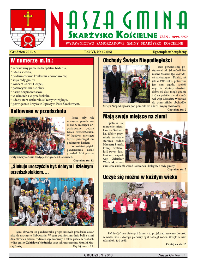ISSN - 1899-1769 WYDAWNICTWO SAMORZĄDOWE GMINY SKARŻYSKO KOŚCIELNE Grudzień 2013 r. Rok VI, Nr 12 (65) Egzemplarz bezpłatny W numerze m.in.: Obchody Święta Niepodległości * zapraszamy panie na bezpłatne badania, * udana kwesta, * podsumowanie konkursu krwiodawców, * sesja rady gminy, * koncert Chóru Gospel, * patriotyzm im nie obcy, * nasze bezpieczeństwo, * w szkołach i w przedszkolu, * udany start siatkarek, sukcesy w trójboju, * poświęcenie krzyża w Lipowym Polu Skarbowym. -Dziś powinniśmy postępować tak, jak mówił Stanisław Staszic: Być Narodowi użytecznym… Dzisiaj, tak jak w 1918 roku, potrzebna jest nam zgoda, spokój, mądrość, abyśmy odróżnili dobro od zła i mogli godnie żyć na polskiej ziemi – mówił wójt Zdzisław Woźniak do uczestników obchodów Święta Niepodległości pod pomnikiem ofiar II wojny światowej. Czytaj na str. 2 Halloween w przedszkolu Przez cały rok w naszym przedszkolu raz w miesiącu organizowany będzie Dzień Przedszkolaka. W każdym miesiącu będzie przebiegał on pod innym hasłem. W ostatni piątek października nasze przedszkolaki poznawały amerykańskie tradycje związane z Halloween. Czytaj na str. 12 „Ślubuję uroczyście być dobrym i dzielnym przedszkolakiem…. Tymi słowami 18 października grupa naszych przedszkolaków złożyła uroczyste ślubowanie. W tym podniosłym dniu byli z nimi dziadkowie i babcie, rodzice i wychowawcy, a także goście w osobach wójta gminy Zdzisława Woźniaka oraz sekretarz gminy Moniki Mączyńskiej. Czytaj na str. 15 Mają swoje miejsce na ziemi Spełniło się marzenie mieszkańców Świerczka. Efekty przyniosły trzyletnie starania radnej Marzeny Piętak, której wytrwałość swym działaniem wsparli wójt Zdzisław Woźniak, a zrozumienie znalazła wśród koleżanek i kolegów z rady gminy. Czytaj na str. 5 Uczyć się można w każdym wieku Polska Cyfrowa Równych Szans – to projekt adresowany do osób w wieku 50+ , którego pierwszy cykl dobiegł końca. Wzięło w nim udział ok. 130 osób. Czytaj na str. 13 g r u dz i e ń 2013 Nasza Gmina 1 W y da r z e n i a Obchody Święta Niepodległości -Dziś powinniśmy postępować tak, jak mówił Stanisław Staszic: Być Narodowi użytecznym… Dzisiaj, tak jak w 1918 roku, potrzebna jest nam zgoda, spokój, mądrość, abyśmy odróżnili dobro od zła i mogli godnie żyć na polskiej ziemi – mówił wójt Zdzisław Woźniak do uczestników obchodów Święta Niepodległości pod pomnikiem ofiar II wojny światowej. Wcześniej w kościele św. Trójcy w Skarżysku Kościelnym Mszę św. w intencji Ojczyzny oraz tych, którzy polegli w walce o nią, odprawił ks. proboszcz Marian Czajkowski. Powitał poczty sztandarowe, wójta gminy Zdzisława Woźniaka, radnych i pozostałych uczestników uroczystości. czący rady gminy Paweł Wiatr. Później delegacje władz samorządowych, rady powiatu, szkół, strażaków, organizacji działających w gminie oraz sołectw złożyły wiązanki kwiatów i zapalili znicze. Na koniec wójt podziękował uczestnikom za liczny udział i patriotyczną postawę. Po nabożeństwie kolumna marszowa zabezpieczona przez strażaków przeszła pod pomnik ofiar II wojny światowej koło Naftobazy, gdzie uroczystość prowadziła sekretarz gminy Monika Mączyńska. Po odegraniu Mazurka Dąbrowskiego na komendę Mariana Gładysia strażacy z Grzybowej Góry oddali trzykrotny salut armatni, po czym głos zabrali wójt gminy Zdzisław Woźniak oraz przewodni- Jacenty Kita 2 Nasza Gmina g r u dz i e ń 2013 A k t ua l n o ś c i „Krew darem życia” Listopadowa kwesta 2013 Stowarzyszenie Na Rzecz Odnowy Zabytków Parafii Św. Trójcy w Skarżysku Kościelnym w tym roku już po raz piąty podjęło się kwestowania na cmentarzu parafialnym w dniu Wszystkich Świętych. Członkowie Stowarzyszenia wsparci przez Rycerzy Kolumba przez 8 godzin starali się pozyskać datki od odwiedzających nasz cmentarz. W tym roku Stowarzyszenie za zebrane pieniądze chce odrestaurować nagrobek powstańca styczniowego Franciszka Starachowskiego znajdujący się na naszym cmentarzu. Mamy nadzieję, że kwota 4.666,91zł (ponad 500,00 zł więcej niż w ubiegłym roku) zebrana podczas kwesty wystarczy na wykonanie prac renowacyjnych. Dzięki środkom pozyskanym z poprzednich kwest udało się odrestaurować już 3 zabytkowe nagrobki. Zarząd Stowarzyszenia pragnie gorąco podziękować Rycerzom Kolumba i członkom Stowarzyszenia z rodzinami, którzy zechcieli włączyć się w kwestowanie. W sposób szczególny dziękujemy wszystkim ofiarodawcom, którym leży na sercu zachowanie naszego dziedzictwa kulturowego. Anastazja Górzyńska Podziękowanie Serdeczne podziękowania dla wszystkich, którzy w jakikolwiek sposób przyczynili się do powstania nowego Krzyża u św. Jana i uświetnienia uroczystości jego poświęcenia w dniu 27.X.2013. Podziękowania kierujemy do księży – proboszcza Parafii Bożego Miłosierdzia ks. Mirosława Maciąga i Matki Boskiej Częstochowskiej ks. Adama Skalskiego, wójta gminy Zdzisława Woźniaka, sekretarz gminy Moniki Mączyńskiej oraz wykonawców krzyża, porządkujących teren oraz organizatorów uroczystości: Zbigniewa Pietrasa, Zdzisława Kosa, Ludwika Niziołka, Piotra Stopińskiego, Pawła Sadzy, Romana Niziołka, Wiesława i Andrzeja Glijerów, Roberta Kowalika, Huberta Niziołka, Krzysztofa Sadzy, Radosława Stopińskiego, Alicji Dulęby, Zbigniewa Duklasa. Dziękujemy radnym: Renacie Kępa, Januszowi Ulewińskiemu, Januszowi Sieczce i Zdzisławowi Rymarczykowi oraz wszystkim uczestnikom uroczystości oraz tym, którzy udostępnili swe samochody do ich przewozu. Rada Sołecka Lipowego Pola Skarbowego Sołtys i radny Włodzimierz Foch Zakończyła się VI edycja wakacyjnego konkursu dla krwiodawców. W sumie w tym roku udało się zebrać 279,45 litrów krwi dzięki 711 osobom, które wzięły w nim udział. Z gminy Skarżysko Kościelne w akcję włączyło 