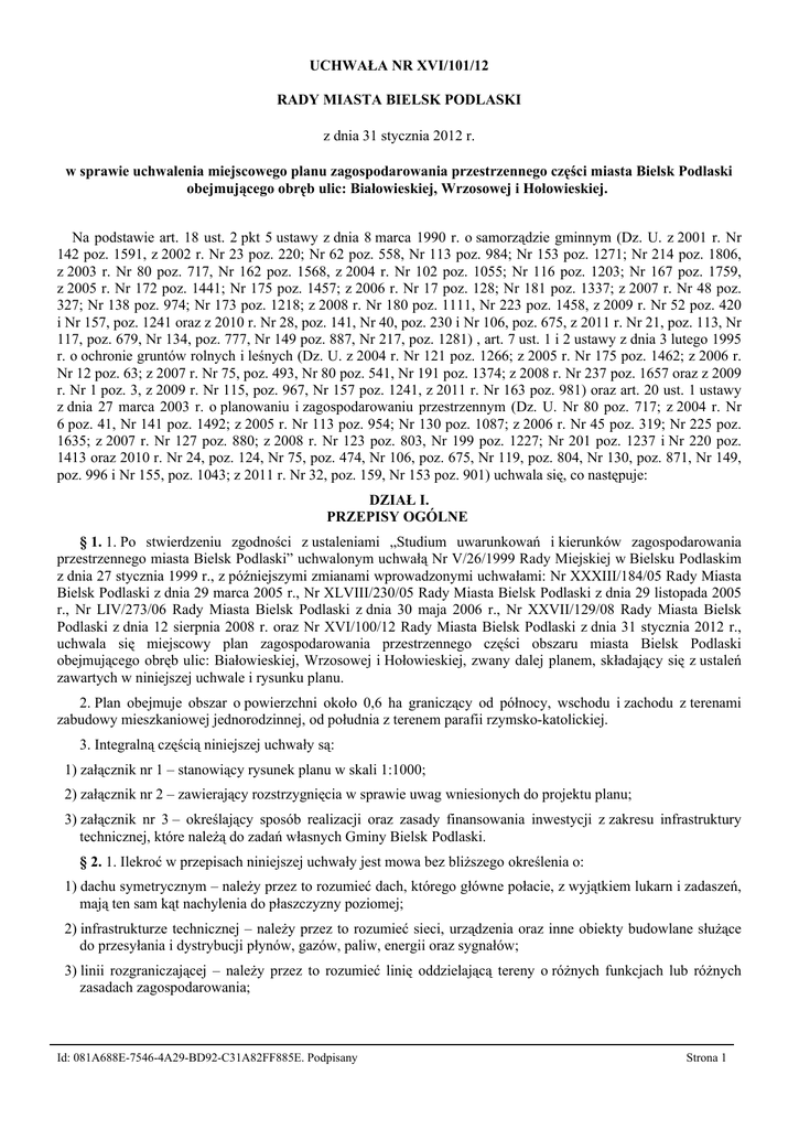 UCHWAŁA NR XVI/101/12 RADY MIASTA BIELSK PODLASKI z dnia 31 stycznia 2012 r. w sprawie uchwalenia miejscowego planu zagospodarowania przestrzennego części miasta Bielsk Podlaski obejmującego obręb ulic: Białowieskiej, Wrzosowej i Hołowieskiej. Na podstawie art. 18 ust. 2 pkt 5 ustawy z dnia 8 marca 1990 r. o samorządzie gminnym (Dz. U. z 2001 r. Nr 142 poz. 1591, z 2002 r. Nr 23 poz. 220; Nr 62 poz. 558, Nr 113 poz. 984; Nr 153 poz. 1271; Nr 214 poz. 1806, z 2003 r. Nr 80 poz. 717, Nr 162 poz. 1568, z 2004 r. Nr 102 poz. 1055; Nr 116 poz. 1203; Nr 167 poz. 1759, z 2005 r. Nr 172 poz. 1441; Nr 175 poz. 1457; z 2006 r. Nr 17 poz. 128; Nr 181 poz. 1337; z 2007 r. Nr 48 poz. 327; Nr 138 poz. 974; Nr 173 poz. 1218; z 2008 r. Nr 180 poz. 1111, Nr 223 poz. 1458, z 2009 r. Nr 52 poz. 420 i Nr 157, poz. 1241 oraz z 2010 r. Nr 28, poz. 141, Nr 40, poz. 230 i Nr 106, poz. 675, z 2011 r. Nr 21, poz. 113, Nr 117, poz. 679, Nr 134, poz. 777, Nr 149 poz. 887, Nr 217, poz. 1281) , art. 7 ust. 1 i 2 ustawy z dnia 3 lutego 1995 r. o ochronie gruntów rolnych i leśnych (Dz. U. z 2004 r. Nr 121 poz. 1266; z 2005 r. Nr 175 poz. 1462; z 2006 r. Nr 12 poz. 63; z 2007 r. Nr 75, poz. 493, Nr 80 poz. 541, Nr 191 poz. 1374; z 2008 r. Nr 237 poz. 1657 oraz z 2009 r. Nr 1 poz. 3, z 2009 r. Nr 115, poz. 967, Nr 157 poz. 1241, z 2011 r. Nr 163 poz. 981) oraz art. 20 ust. 1 ustawy z dnia 27 marca 2003 r. o planowaniu i zagospodarowaniu przestrzennym (Dz. U. Nr 80 poz. 717; z 2004 r. Nr 6 poz. 41, Nr 141 poz. 1492; z 2005 r. Nr 113 poz. 954; Nr 130 poz. 1087; z 2006 r. Nr 45 poz. 319; Nr 225 poz. 1635; z 2007 r. Nr 127 poz. 880; z 2008 r. Nr 123 poz. 803, Nr 199 poz. 1227; Nr 201 poz. 1237 i Nr 220 poz. 1413 oraz 2010 r. Nr 24, poz. 124, Nr 75, poz. 474, Nr 106, poz. 675, Nr 119, poz. 804, Nr 130, poz. 871, Nr 149, poz. 996 i Nr 155, poz. 1043; z 2011 r. Nr 32, poz. 159, Nr 153 poz. 901) uchwala się, co następuje: DZIAŁ I. PRZEPISY OGÓLNE § 1. 1. Po stwierdzeniu zgodności z ustaleniami „Studium uwarunkowań i kierunków zagospodarowania przestrzennego miasta Bielsk Podlaski” uchwalonym uchwałą Nr V/26/1999 Rady Miejskiej w Bielsku Podlaskim z dnia 27 stycznia 1999 r., z późniejszymi zmianami wprowadzonymi uchwałami: Nr XXXIII/184/05 Rady Miasta Bielsk Podlaski z dnia 29 marca 2005 r., Nr XLVIII/230/05 Rady Miasta Bielsk Podlaski z dnia 29 listopada 2005 r., Nr LIV/273/06 Rady Miasta Bielsk Podlaski z dnia 30 maja 2006 r., Nr XXVII/129/08 Rady Miasta Bielsk Podlaski z dnia 12 sierpnia 2008 r. oraz Nr XVI/100/12 Rady Miasta Bielsk Podlaski z dnia 31 stycznia 2012 r., uchwala się miejscowy plan zagospodarowania przestrzennego części obszaru miasta Bielsk Podlaski obejmującego obręb ulic: Białowieskiej, Wrzosowej i Hołowieskiej, zwany dalej planem, składający się z ustaleń zawartych w niniejszej uchwale i rysunku planu. 2. Plan obejmuje obszar o powierzchni około 0,6 ha graniczący od północy, wschodu i zachodu z terenami zabudowy mieszkaniowej jednorodzinnej, od południa z terenem parafii rzymsko-katolickiej. 3. Integralną częścią niniejszej uchwały są: 1) załącznik nr 1 – stanowiący rysunek planu w skali 1:1000; 2) załącznik nr 2 – zawierający rozstrzygnięcia w sprawie uwag wniesionych do projektu planu; 3) załącznik nr 3 – określający sposób realizacji oraz zasady finansowania inwestycji z zakresu infrastruktury technicznej, które należą do zadań własnych Gminy Bielsk Podlaski. § 2. 1. Ilekroć w przepisach niniejszej uchwały jest mowa bez bliższego określenia o: 1) dachu symetrycznym – należy przez to rozumieć dach, którego główne połacie, z wyjątkiem lukarn i zadaszeń, mają ten sam kąt nachylenia do płaszczyzny poziomej; 2) infrastrukturze technicznej – należy przez to rozumieć sieci, urządzenia oraz inne obiekty budowlane służące do przesyłania i dystrybucji płynów, gazów, paliw, energii oraz sygnałów; 3) linii rozgraniczającej – należy przez to rozumieć linię oddzielającą tereny o różnych funkcjach lub różnych zasadach zagospodarowania; Id: 081A688E-7546-4A29-BD92-C31A82FF885E. Podpisany Strona 1 4) linii zabudowy nieprzekraczalnej – należy przez to rozumieć linię, której nie może przekroczyć ściana zewnętrzna budynku w kierunku ulicy, sąsiedniego terenu lub sąsiedniej działki, z zastrzeżeniem § 3 ust. 1 pkt 4; 5) nośniku reklamy – należy przez to rozumieć urządzenie reklamowe przeznaczone do eksponowania reklamy, które nie jest znakiem w rozumieniu przepisów o znakach i sygnałach drogowych oraz tablicą informacyjną miejskiego systemu informacji; 6) powierzchni zabudowy – należy przez to rozumieć powierzchnię terenu zajętą przez budynek (budynki) w stanie wykończonym, wyznaczoną przez rzut pionowy zewnętrznych krawędzi budynku (budynków) na powierzchnię działki budowlanej, z wyłączeniem powierzchni: obiektów budowlanych lub ich części niewystających ponad powierzchnię terenu, schodów zewnętrznych, ramp zewnętrznych, pochylni, balkonów, daszków, markiz oraz występów dachowych; 7) terenie – należy przez to rozumieć obszar o określonym przeznaczeniu, wyznaczony na rysunku planu liniami rozgraniczającymi oraz oznaczony wyróżniającym go spośród pozostałych terenów symbolem; 8) terenie inwestycji – należy przez to rozumieć obszar objęty wnioskiem w sprawie pozwolenia na budowę lub inną formą administracyjną zgłoszenia budowy; 9) urządzeniach towarzyszących – należy przez to rozumieć urządzenia budowlane i obiekty małej architektury; 10) zabudowie – należy przez to rozumieć obiekty budowlane o przeznaczeniu określonym w ustaleniach planu, jak również ich budowę, przebudowę lub remonty. 2. W odniesieniu do innych określeń i pojęć użytych w uchwale, niewymienionych w ust. 1, należy stosować definicje zawarte w innych obowiązujących przepisach. § 3. 1. Następujące oznaczenia graficzne na rysunku planu są obowiąz