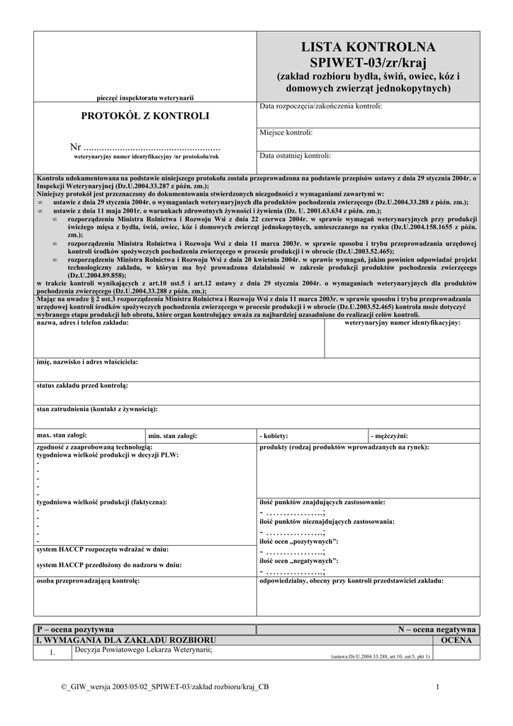 LISTA KONTROLNA SPIWET-03/zr/kraj (zakład rozbioru bydła, świń, owiec, kóz i domowych zwierząt jednokopytnych) pieczęć inspektoratu weterynarii PROTOKÓŁ Z KONTROLI Data rozpoczęcia/zakończenia kontroli: Miejsce kontroli: Nr ..................................................... weterynaryjny numer identyfikacyjny /nr protokołu/rok Data ostatniej kontroli: Kontrola udokumentowana na podstawie niniejszego protokołu została przeprowadzona na podstawie przepisów ustawy z dnia 29 stycznia 2004r. o Inspekcji Weterynaryjnej (Dz.U.2004.33.287 z późn. zm.); Niniejszy protokół jest przeznaczony do dokumentowania stwierdzonych niezgodności z wymaganiami zawartymi w: • ustawie z dnia 29 stycznia 2004r. o wymaganiach weterynaryjnych dla produktów pochodzenia zwierzęcego (Dz.U.2004.33.288 z późn. zm.); • ustawie z dnia 11 maja 2001r. o warunkach zdrowotnych żywności i żywienia (Dz. U. 2001.63.634 z późn. zm.); • rozporządzeniu Ministra Rolnictwa i Rozwoju Wsi z dnia 22 czerwca 2004r. w sprawie wymagań weterynaryjnych przy produkcji świeżego mięsa z bydła, świń, owiec, kóz i domowych zwierząt jednokopytnych, umieszczanego na rynku (Dz.U.2004.158.1655 z późn. zm.); • rozporządzeniu Ministra Rolnictwa i Rozwoju Wsi z dnia 11 marca 2003r. w sprawie sposobu i trybu przeprowadzania urzędowej kontroli środków spożywczych pochodzenia zwierzęcego w procesie produkcji i w obrocie (Dz.U.2003.52.465); • rozporządzeniu Ministra Rolnictwa i Rozwoju Wsi z dnia 20 kwietnia 2004r. w sprawie wymagań, jakim powinien odpowiadać projekt technologiczny zakładu, w którym ma być prowadzona działalność w zakresie produkcji produktów pochodzenia zwierzęcego (Dz.U.2004.89.858); w trakcie kontroli wynikających z art.10 ust.5 i art.12 ustawy z dnia 29 stycznia 2004r. o wymaganiach weterynaryjnych dla produktów pochodzenia zwierzęcego (Dz.U.2004.33.288 z późn. zm.); Mając na uwadze § 2 ust.3 rozporządzenia Ministra Rolnictwa i Rozwoju Wsi z dnia 11 marca 2003r. w sprawie sposobu i trybu przeprowadzania urzędowej kontroli środków spożywczych pochodzenia zwierzęcego w procesie produkcji i w obrocie (Dz.U.2003.52.465) kontrola może dotyczyć wybranego etapu produkcji lub obrotu, które organ kontrolujący uważa za najbardziej uzasadnione do realizacji celów kontroli. nazwa, adres i telefon zakładu: weterynaryjny numer identyfikacyjny: imię, nazwisko i adres właściciela: status zakładu przed kontrolą: stan zatrudnienia (kontakt z żywnością): max. stan załogi: min. stan załogi: zgodność z zaaprobowaną technologią: tygodniowa wielkość produkcji w decyzji PLW: tygodniowa wielkość produkcji (faktyczna): system HACCP rozpoczęto wdrażać w dniu: system HACCP przedłożony do nadzoru w dniu: osoba przeprowadzającą kontrolę: - kobiety: ilość punktów znajdujących zastosowanie: - ……………..; ilość punktów nieznajdujących zastosowania: - ……………..; ilość ocen „pozytywnych”: - ……………..; ilość ocen „negatywnych”: - ……………..; odpowiedzialny, obecny przy kontroli przedstawiciel zakładu: P – ocena pozytywna I. WYMAGANIA DLA ZAKŁADU ROZBIORU 1. - mężczyźni: produkty (rodzaj produktów wprowadzanych na rynek): N – ocena negatywna OCENA Decyzja Powiatowego Lekarza Weterynarii; (ustawa Dz.U.2004.33.288, art.10, ust.5, pkt 1) ©_GIW_wersja 2005/05/02_SPIWET-03/zakład rozbioru/kraj_CB 1 2. 3. Projekt technologiczny zakładu - część opisowa; (rozp.Dz.U.2004.89.858,§ 2, pkt 1) - część graficzna; (rozp.Dz.U.2004.89.858,§ 2, pkt 2) 4. - zmiany; (rozp.Dz.U.2004.89.858,§ 4) 5. Decyzja zatwierdzająca projekt technologiczny zakładu; 6. Stan sanitarno-higieniczny budynków oraz otoczenia zakładu; 7. Stan sanitarno-techniczny pomieszczeń, linii produkcyjnych, narzędzi i sprzętu; 8. Stan czystości i porządku w pomieszczeniach produkcyjnych zakładu; 9. Dokumentacja dot. aktualnego zakresu i rodzaju działalności prowadzonej w zakładzie; 10. Dokumentacja dot. zabezpieczenia zakładu przed owadami i gryzoniami; 11. Dokumentacja dot. zabezpieczenia produktów przed zanieczyszczeniami (odłamki szkła, drewna, metalu tworzyw sztucznych); 12. Dokumentacja dot. materiałów i wyrobów mających kontakt bezpośrednio z żywnością; 13. Dokumentacja dot. nadzoru nad urządzeniami pomiarowymi; 14. Dokumentacja dot. okresowego sprawdzania urządzeń, aparatów, sprzętu, narzędzi; 15. Wydruki z urządzeń automatycznie rejestrujących parametry procesów technologicznych (lub archiwizacja na nośnikach elektronicznych); 16. Czystość urządzeń, aparatury, sprzętu i narzędzi; 17. Dokumentacja dot. surowca i produktu (Handlowy Dokument Identyfikacyjny); 18. Regularne kontrole – Decyzja Komisji 2001/471/WE; 19. Program szkoleń (wymagania weterynaryjne i warunki produkcji; 20. Przestrzeganie zasady dot. małej zdolności produkcyjnej; 21. Podłogi (materiały, wykonanie i konstrukcja); 22. Urządzenia ściekowe (urządzenia zabezpieczające przed cofaniem); 23. Ściany (materiały, wykonanie, kolor, zmywalna warstwa); 24. Drzwi (materiały, wykonanie, pokrycie); 25. Materiały izolacyjne; 26. Wentylacja (skuteczność) i urządzenia do odprowadzania pary (jeżeli to niezbędne); 27. Oświetlenie (barwa oświetlanego obiektu); 28. Urządzenia do mycia i dezynfekcji rąk (bieżąca woda, środki do czyszczenia i odkażania rąk, ręczniki jednorazowego użytku i pojemniki na zużyte ręczniki, lokalizacja); 29. Urządzenia do mycia narzędzi; 30. Urządzenia do dezynfekcji narzędzi (woda o temp. powyżej 82 0C, lokalizacja); 31. Urządzenia i wyposażenie (materiały, konstrukcja, wykonanie); 32. Urządzenia i wyposażenie (niepowodujące zanieczyszczenia świeżego mięsa); 33. Urządzenia i wyposażenie (łatwość oczyszczania i dezynfekcji); 34. Zakaz używania drewna; 35. Urządzenia i sprzęt (zapewnienie higienicznej obróbki świeżego mięsa); 36. Urządzenia chłodnicze – te