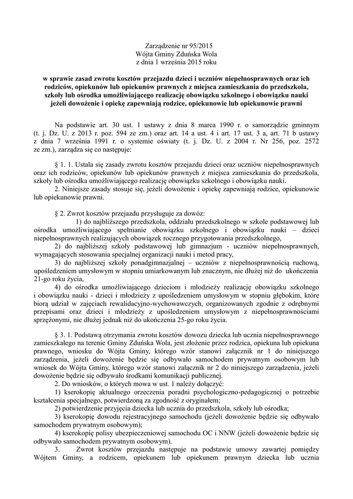 Zarządzenie nr 95/2015 Wójta Gminy Zduńska Wola z dnia 1 września 2015 roku w sprawie zasad zwrotu kosztów przejazdu dzieci i uczniów niepełnosprawnych oraz ich rodziców, opiekunów lub opiekunów prawnych z miejsca zamieszkania do przedszkola, szkoły lub ośrodka umożliwiającego realizację obowiązku szkolnego i obowiązku nauki jeżeli dowożenie i opiekę zapewniają rodzice, opiekunowie lub opiekunowie prawni Na podstawie art. 30 ust. 1 ustawy z dnia 8 marca 1990 r. o samorządzie gminnym (t. j. Dz. U. z 2013 r. poz. 594 ze zm.) oraz art. 14 a ust. 4 i art. 17 ust. 3 a, art. 71 b ustawy z dnia 7 września 1991 r. o systemie oświaty (t. j. Dz. U. z 2004 r. Nr 256, poz. 2572 ze zm.), zarządza się co następuje: § 1. 1. Ustala się zasady zwrotu kosztów przejazdu dzieci oraz uczniów niepełnosprawnych oraz ich rodziców, opiekunów lub opiekunów prawnych z miejsca zamieszkania do przedszkola, szkoły lub ośrodka umożliwiającego realizację obowiązku szkolnego i obowiązku nauki. 2. Niniejsze zasady stosuje się, jeżeli dowożenie i opiekę zapewniają rodzice, opiekunowie lub opiekunowie prawni. § 2. Zwrot kosztów przejazdu przysługuje za dowóz: 1) do najbliższego przedszkola, oddziału przedszkolnego w szkole podstawowej lub ośrodka umożliwiającego spełnianie obowiązku szkolnego i obowiązku nauki – dzieci niepełnosprawnych realizujących obowiązek rocznego przygotowania przedszkolnego, 2) do najbliższej szkoły podstawowej lub gimnazjum - uczniów niepełnosprawnych, wymagających stosowania specjalnej organizacji nauki i metod pracy, 3) do najbliższej szkoły ponadgimnazjalnej – uczniów z niepełnosprawnością ruchową, upośledzeniem umysłowym w stopniu umiarkowanym lub znacznym, nie dłużej niż do ukończenia 21-go roku życia, 4) do ośrodka umożliwiającego dzieciom i młodzieży realizację obowiązku szkolnego i obowiązku nauki - dzieci i młodzieży z upośledzeniem umysłowym w stopniu głębokim, które biorą udział w zajęciach rewalidacyjno-wychowawczych, organizowanych zgodnie z odrębnymi przepisami oraz dzieci i młodzieży z upośledzeniem umysłowym z niepełnosprawnościami sprzężonymi, nie dłużej jednak niż do ukończenia 25-go roku życia. § 3. 1. Podstawą otrzymania zwrotu kosztów dowozu dziecka lub ucznia niepełnosprawnego zamieszkałego na terenie Gminy Zduńska Wola, jest złożenie przez rodzica, opiekuna lub opiekuna prawnego, wniosku do Wójta Gminy, którego wzór stanowi załącznik nr 1 do niniejszego zarządzenia, jeżeli dowożenie będzie się odbywało samochodem prywatnym osobowym lub wniosek do Wójta Gminy, którego wzór stanowi załącznik nr 2 do niniejszego zarządzenia, jeżeli dowożenie będzie się odbywało środkami komunikacji publicznej. 2. Do wniosków, o których mowa w ust. 1 należy dołączyć: 1) kserokopię aktualnego orzeczenia poradni psychologiczno-pedagogicznej o potrzebie kształcenia specjalnego, potwierdzoną za zgodność z oryginałem; 2) potwierdzenie przyjęcia dziecka lub ucznia do przedszkola, szkoły lub ośrodka; 3) kserokopię dowodu rejestracyjnego samochodu (jeżeli dowożenie będzie się odbywało samochodem prywatnym osobowym); 4) kserokopię polisy ubezpieczeniowej samochodu OC i NNW (jeżeli dowożenie będzie się odbywało samochodem prywatnym osobowym). 3. Zwrot kosztów przejazdu następuje na podstawie umowy zawartej pomiędzy Wójtem Gminy, a rodzicem, opiekunem lub opiekunem prawnym dziecka lub ucznia niepełnosprawnego. Wzór umowy stanowi załącznik nr 3 do niniejszego zarządzenia, jeżeli dowożenie będzie się odbywało samochodem prywatnym osobowym lub umowy, której wzór stanowi załącznik nr 4 do niniejszego zarządzenia, jeżeli dowożenie będzie się odbywało środkami komunikacji publicznej. § 4. 1. Podstawę obliczenia kwoty zwrotu kosztów dowozu dziecka lub ucznia niepełnosprawnego stanowi: 1) w przypadku przejazdu dziecka lub ucznia i opiekuna środkami komunikacji publicznej, wysokość ceny biletu, po uwzględnieniu ulgi wynikającej z ustawy z dnia 20 czerwca 1992 r. o uprawnieniach ulgowych przejazdów środkami transportu zbiorowego (t. j. Dz. U. z 2012 r. poz. 1138 ze zm.); 2) w przypadku dowożenia dziecka lub ucznia prywatnym samochodem osobowym przez rodzica, opiekuna lub opiekuna prawnego, wysokość miesięcznej kwoty zwrotu kosztów dowozu jest obliczana jako iloczyn: podwójnej odległości z miejsca zamieszkania dziecka lub ucznia do właściwej placówki określonej § 2 zarządzenia i 80 % stawki za kilometr przebiegu określonej w § 2 rozporządzenia Ministra Infrastruktury z dnia 25 marca 2002 r. w sprawie warunków ustalania oraz sposobu dokonywania zwrotu kosztów używania do celów służbowych samochodów osobowych, motocykli i motorowerów niebędących własnością pracodawcy (Dz. U. z 2002 r. Nr 27, poz. 271 ze zm.), obowiązującej w dniu podpisania umowy oraz liczby dni obecności dziecka lub ucznia w przedszkolu, szkole lub ośrodku w miesiącu rozliczeniowym, przy czym odległość pomiędzy miejscem zamieszkania, a przedszkolem, szkołą lub ośrodkiem jest rozumiana jako długość najkrótszej trasy łączącej te dwa miejsca. 2. Liczba dni obecności dziecka lub ucznia w przedszkolu, szkole lub ośrodku w przypadku dowożenia dziecka prywatnym samochodem osobowym musi być poświadczona podpisem dyrektora przedszkola, szkoły lub ośrodka. 3. Za dni nieobecności dziecka lub ucznia w przedszkolu, szkole lub ośrodku w przypadku dowożenia dziecka prywatnym samochodem osobowym zwrot kosztów nie przysługuje. § 5. 1. Warunkiem zwrotu kosztów przejazdu w przypadku dowożenia dziecka prywatnym samochodem osobowym jest przedłożenie przez rodzica, opiekuna lub opiekuna prawnego, który podpisał umowę, rachunku, którego wzór stanowi załącznik nr 5 do niniejszego zarządzenia. 2. Warunkiem zwrotu kosztów przejazdu w przypadku dowożenia dziecka środkami komunikacji publicznej je