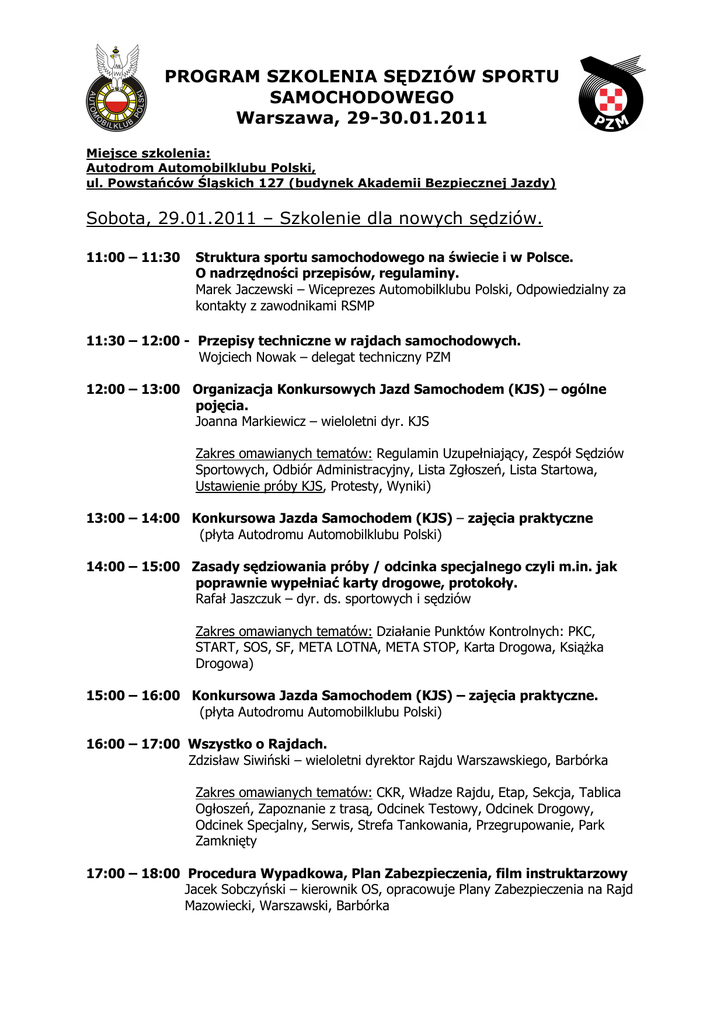 PROGRAM SZKOLENIA SĘDZIÓW SPORTU SAMOCHODOWEGO Warszawa, 29-30.01.2011 Miejsce szkolenia: Autodrom Automobilklubu Polski, ul. Powstańców Śląskich 127 (budynek Akademii Bezpiecznej Jazdy) Sobota, 29.01.2011 – Szkolenie dla nowych sędziów. 11:00 – 11:30 Struktura sportu samochodowego na świecie i w Polsce. O nadrzędności przepisów, regulaminy. Marek Jaczewski – Wiceprezes Automobilklubu Polski, Odpowiedzialny za kontakty z zawodnikami RSMP 11:30 – 12:00 - Przepisy techniczne w rajdach samochodowych. Wojciech Nowak – delegat techniczny PZM 12:00 – 13:00 Organizacja Konkursowych Jazd Samochodem (KJS) – ogólne pojęcia. Joanna Markiewicz – wieloletni dyr. KJS Zakres omawianych tematów: Regulamin Uzupełniający, Zespół Sędziów Sportowych, Odbiór Administracyjny, Lista Zgłoszeń, Lista Startowa, Ustawienie próby KJS, Protesty, Wyniki) 13:00 – 14:00 Konkursowa Jazda Samochodem (KJS) – zajęcia praktyczne (płyta Autodromu Automobilklubu Polski) 14:00 – 15:00 Zasady sędziowania próby / odcinka specjalnego czyli m.in. jak poprawnie wypełniać karty drogowe, protokoły. Rafał Jaszczuk – dyr. ds. sportowych i sędziów Zakres omawianych tematów: Działanie Punktów Kontrolnych: PKC, START, SOS, SF, META LOTNA, META STOP, Karta Drogowa, Książka Drogowa) 15:00 – 16:00 Konkursowa Jazda Samochodem (KJS) – zajęcia praktyczne. (płyta Autodromu Automobilklubu Polski) 16:00 – 17:00 Wszystko o Rajdach. Zdzisław Siwiński – wieloletni dyrektor Rajdu Warszawskiego, Barbórka Zakres omawianych tematów: CKR, Władze Rajdu, Etap, Sekcja, Tablica Ogłoszeń, Zapoznanie z trasą, Odcinek Testowy, Odcinek Drogowy, Odcinek Specjalny, Serwis, Strefa Tankowania, Przegrupowanie, Park Zamknięty 17:00 – 18:00 Procedura Wypadkowa, Plan Zabezpieczenia, film instruktarzowy Jacek Sobczyński – kierownik OS, opracowuje Plany Zabezpieczenia na Rajd Mazowiecki, Warszawski, Barbórka Miejsce doszkolenia: Autodrom Automobilklubu Polski, ul. Powstańców Śląskich 127 (budynek Akademii Bezpiecznej Jazdy) Niedziela, 30.01.2011 – Doszkolenie obecnych sędziów. Zapraszamy serdecznie również uczestników sobotniego szkolenia. 12:00 – 13:00 Zmiany w Regulaminach 2011 Anna Siwińska – dyr. ds. sędziów, wieloletni kierownik OS 13:00 – 14:30 Trudne sytuacje na KJSach / Rajdach z jakimi sędziowie mogą mieć problemy, interpretacja przepisów. Michał Ołdakowski – Wiceprzewodniczący OKSS, wieloletni dyr. KJS 14:30 – 16:00 Trudne pytania od sędziów. Szymon Lewandowski – członek ZSS, dyr. ds. trasy 16:00 – Spotkanie integracyjne – Ognisko Serdecznie zapraszamy!