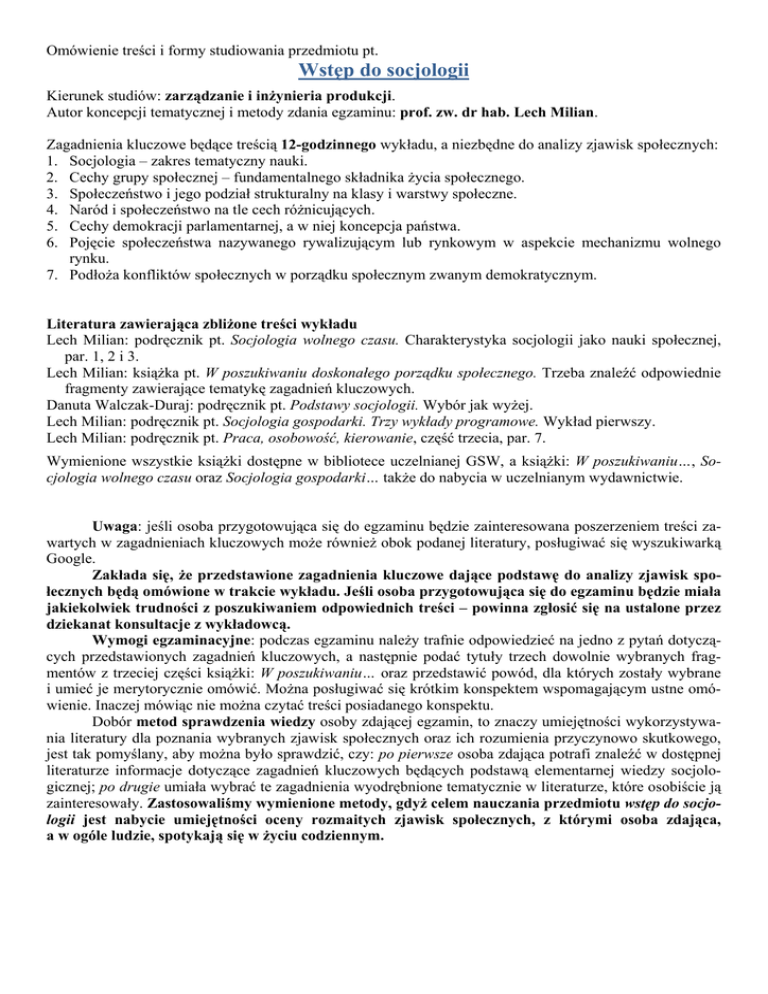 Omówienie treści i formy studiowania przedmiotu pt. Wstęp do socjologii Kierunek studiów: zarządzanie i inżynieria produkcji. Autor koncepcji tematycznej i metody zdania egzaminu: prof. zw. dr hab. Lech Milian. Zagadnienia kluczowe będące treścią 12-godzinnego wykładu, a niezbędne do analizy zjawisk społecznych: 1. Socjologia – zakres tematyczny nauki. 2. Cechy grupy społecznej – fundamentalnego składnika życia społecznego. 3. Społeczeństwo i jego podział strukturalny na klasy i warstwy społeczne. 4. Naród i społeczeństwo na tle cech różnicujących. 5. Cechy demokracji parlamentarnej, a w niej koncepcja państwa. 6. Pojęcie społeczeństwa nazywanego rywalizującym lub rynkowym w aspekcie mechanizmu wolnego rynku. 7. Podłoża konfliktów społecznych w porządku społecznym zwanym demokratycznym. Literatura zawierająca zbliżone treści wykładu Lech Milian: podręcznik pt. Socjologia wolnego czasu. Charakterystyka socjologii jako nauki społecznej, par. 1, 2 i 3. Lech Milian: książka pt. W poszukiwaniu doskonałego porządku społecznego. Trzeba znaleźć odpowiednie fragmenty zawierające tematykę zagadnień kluczowych. Danuta Walczak-Duraj: podręcznik pt. Podstawy socjologii. Wybór jak wyżej. Lech Milian: podręcznik pt. Socjologia gospodarki. Trzy wykłady programowe. Wykład pierwszy. Lech Milian: podręcznik pt. Praca, osobowość, kierowanie, część trzecia, par. 7. Wymienione wszystkie książki dostępne w bibliotece uczelnianej GSW, a książki: W poszukiwaniu…, Socjologia wolnego czasu oraz Socjologia gospodarki… także do nabycia w uczelnianym wydawnictwie. Uwaga: jeśli osoba przygotowująca się do egzaminu będzie zainteresowana poszerzeniem treści zawartych w zagadnieniach kluczowych może również obok podanej literatury, posługiwać się wyszukiwarką Google. Zakłada się, że przedstawione zagadnienia kluczowe dające podstawę do analizy zjawisk społecznych będą omówione w trakcie wykładu. Jeśli osoba przygotowująca się do egzaminu będzie miała jakiekolwiek trudności z poszukiwaniem odpowiednich treści – powinna zgłosić się na ustalone przez dziekanat konsultacje z wykładowcą. Wymogi egzaminacyjne: podczas egzaminu należy trafnie odpowiedzieć na jedno z pytań dotyczących przedstawionych zagadnień kluczowych, a następnie podać tytuły trzech dowolnie wybranych fragmentów z trzeciej części książki: W poszukiwaniu… oraz przedstawić powód, dla których zostały wybrane i umieć je merytorycznie omówić. Można posługiwać się krótkim konspektem wspomagającym ustne omówienie. Inaczej mówiąc nie można czytać treści posiadanego konspektu. Dobór metod sprawdzenia wiedzy osoby zdającej egzamin, to znaczy umiejętności wykorzystywania literatury dla poznania wybranych zjawisk społecznych oraz ich rozumienia przyczynowo skutkowego, jest tak pomyślany, aby można było sprawdzić, czy: po pierwsze osoba zdająca potrafi znaleźć w dostępnej literaturze informacje dotyczące zagadnień kluczowych będących podstawą elementarnej wiedzy socjologicznej; po drugie umiała wybrać te zagadnienia wyodrębnione tematycznie w literaturze, które osobiście ją zainteresowały. Zastosowaliśmy wymienione metody, gdyż celem nauczania przedmiotu wstęp do socjologii jest nabycie umiejętności oceny rozmaitych zjawisk społecznych, z którymi osoba zdająca, a w ogóle ludzie, spotykają się w życiu codziennym.