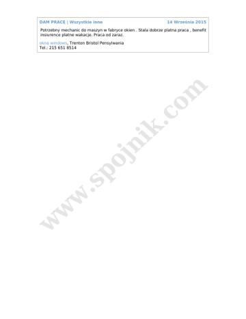 DAM PRACĘ | Wszystkie inne 14 Września 2015 Potrzebny mechanic do maszyn w fabryce okien . Stala dobrze platna praca , benefit insiurence platne wakacje. Praca od zaraz. w w w .s po jn ik .c o m okna windows, Trenton Bristol Pensylwania Tel.: 215 651 8514