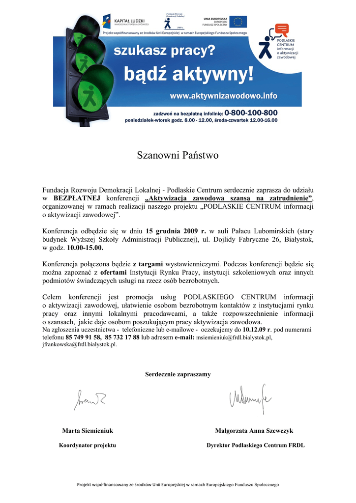 Szanowni Państwo Fundacja Rozwoju Demokracji Lokalnej - Podlaskie Centrum serdecznie zaprasza do udziału w BEZPŁATNEJ konferencji „Aktywizacja zawodowa szansą na zatrudnienie”, organizowanej w ramach realizacji naszego projektu „PODLASKIE CENTRUM informacji o aktywizacji zawodowej”. Konferencja odbędzie się w dniu 15 grudnia 2009 r. w auli Pałacu Lubomirskich (stary budynek Wyższej Szkoły Administracji Publicznej), ul. Dojlidy Fabryczne 26, Białystok, w godz. 10.00-15.00. Konferencja połączona będzie z targami wystawienniczymi. Podczas konferencji będzie się można zapoznać z ofertami Instytucji Rynku Pracy, instytucji szkoleniowych oraz innych podmiotów świadczących usługi na rzecz osób bezrobotnych. Celem konferencji jest promocja usług PODLASKIEGO CENTRUM informacji o aktywizacji zawodowej, ułatwienie osobom bezrobotnym kontaktów z instytucjami rynku pracy oraz innymi lokalnymi pracodawcami, a także rozpowszechnienie informacji o szansach, jakie daje osobom poszukującym pracy aktywizacja zawodowa. Na zgłoszenia uczestnictwa - telefoniczne lub e-mailowe - oczekujemy do 10.12.09 r. pod numerami telefonu 85 749 91 58, 85 732 17 88 lub adresem e-mail: [email protected], [email protected]. Serdecznie zapraszamy Marta Siemieniuk Małgorzata Anna Szewczyk Koordynator projektu Dyrektor Podlaskiego Centrum FRDL Projekt współfinansowany ze środków Unii Europejskiej w ramach Europejskiego Funduszu Społecznego Program konferencji „Aktywizacja zawodowa szansa na zatrudnienie” Białystok, 15 grudnia 2009 r. Aula Pałacu Lubomirskich (stary budynek Wyższej szkoły Administracji Publicznej) 9.45-10.00 - rejestracja uczestników 10.00- 10.15 - rozpoczęcie konferencji, Małgorzata Anna Szewczyk - Dyrektor Podlaskiego Centrum FRDL 10.15-10.30 - „ Usługi PODLASKIEGO CENTRUM informacji o aktywizacji zawodowej”Marta Siemieniuk- Koordynator projektu 10.30-10.50 - „Regionalna polityka rynku pracy (Regionalny Plan Działania, Podlaska Strategia Zatrudnienia” – przedstawiciel Wojewódzkiego Urząd Pracy w Białymstoku 10.50-11.10 - „Dynamika i potrzeby regionalnego rynku pracy” – wynika badawcze z projektu "Badanie potrzeb podlaskiego rynku pracy"- Maciej Muczyński - Wyższa Szkoła Ekonomiczna w Białymstoku 11.10-11.30 - „Rynek pracy oczami pracodawców” - Lech Jerzy Pilecki Prezes Zarządu Podlaskiego Klubu Biznesu 11.30-11.50 - „Sytuacja na podlaskim rynku pracy w 2009 r. „– Barbara Wacławska – Dyrektor Powiatowego Urzędu Pracy w Białymstoku 11.50-12.10 - przerwa kawowa i zwiedzanie targów wystawienniczych 12.10-12.30 - „Znaczenie kształcenia ustawicznego w procesie aktywizacji zawodowej” Bożena Barbara Krasnodębska- Dyrektor Centrum Kształcenia Ustawicznego w Białymstoku 12.30-12.50 - „OHP jako realizator usług rynku pracy” – Wieńczysław Andrzej Targ – Wojewódzki Komendant Podlaskiej Wojewódzkiej Komendy Ochotnicze Hufce Pracy 12.50-13.10 - „Usługi Biura Karier WSAP jako pomoc dla osób poszukujących pracy” – Iwona Zaborowska –Kierownik Biura Karier Wyższej Szkoły Administracji Publicznej im. Stanisława Staszica w Białymstoku 13.10-13.30 - „Młodzi przedsiębiorczy”- prezentacja projektu Regionalnego Centrum Szkoleniowego w Białymstoku, adresowanego do osób bezrobotnych. 13.30-14.00 - Podsumowanie, dyskusja 14.00 -15.00 - Lunch Projekt współfinansowany ze środków Unii Europejskiej w ramach Europejskiego Funduszu Społecznego