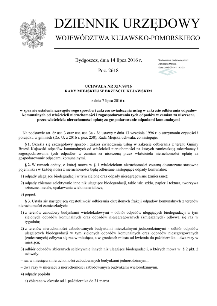 DZIENNIK URZĘDOWY WOJEWÓDZTWA KUJAWSKO-POMORSKIEGO Bydgoszcz, dnia 14 lipca 2016 r. Elektronicznie podpisany przez: Agnieszka Makara Poz. 2618 Data: 2016-07-14 11:43:33 UCHWAŁA NR XIV/98/16 RADY MIEJSKIEJ W BRZEŚCIU KUJAWSKIM z dnia 7 lipca 2016 r. w sprawie ustalenia szczegółowego sposobu i zakresu świadczenia usług w zakresie odbierania odpadów komunalnych od właścicieli nieruchomości i zagospodarowania tych odpadów w zamian za uiszczoną przez właściciela nieruchomości opłatę za gospodarowanie odpadami komunalnymi Na podstawie art. 6r ust. 3 oraz ust. ust. 3a - 3d ustawy z dnia 13 września 1996 r. o utrzymaniu czystości i porządku w gminach (Dz. U. z 2016 r. poz. 250), Rada Miejska uchwala, co następuje: § 1. Określa się szczegółowy sposób i zakres świadczenia usług w zakresie odbierania z terenu Gminy Brześć Kujawski odpadów komunalnych od właścicieli nieruchomości na których zamieszkują mieszkańcy i zagospodarowania tych odpadów w zamian za uiszczoną przez właściciela nieruchomości opłatę za gospodarowanie odpadami komunalnymi. § 2. W ramach opłaty, o której mowa w § 1 właścicielom nieruchomości zostaną dostarczone stosowne pojemniki i w każdej ilości z nieruchomości będą odbierane następujące odpady komunalne: 1) odpady ulegające biodegradacji w tym zielone oraz odpady niesegregowane (zmieszane); 2) odpady zbierane selektywnie inne niż ulegające biodegradacji, takie jak: szkło, papier i tektura, tworzywa sztuczne, metale, opakowania wielomateriałowe; 3) popiół. § 3. Ustala się następującą częstotliwość odbierania określonych frakcji odpadów komunalnych z terenów nieruchomości zamieszkałych: 1) z terenów zabudowy budynkami wielolokalowymi – odbiór odpadów ulegających biodegradacji w tym zielonych odpadów komunalnych oraz odpadów niesegregowanych (zmieszanych) odbywa się raz w tygodniu; 2) z terenów nieruchomości zabudowanych budynkami mieszkalnymi jednorodzinnymi - odbiór odpadów ulegających biodegradacji w tym zielonych odpadów komunalnych oraz odpadów niesegregowanych (zmieszanych) odbywa się raz w miesiącu, a w granicach miasta od kwietnia do października – dwa razy w miesiącu; 3) odbiór odpadów zbieranych selektywnie innych niż ulegające biodegradacji, o których mowa w § 2 pkt. 2 uchwały: – raz w miesiącu z nieruchomości zabudowanych budynkami jednorodzinnymi; – dwa razy w miesiącu z nieruchomości zabudowanych budynkami wielorodzinnymi. 4) odpady popiołu a) zbierane w okresie od 1 października do 31 marca Dziennik Urzędowy Województwa Kujawsko-Pomorskiego –2– Poz. 2618 – raz na dwa miesiące w zabudowie jednorodzinnej, – raz w miesiącu w zabudowie wielolokalowej. b) zbierane w okresie od 1 kwietnia do 30 września – raz na pół roku zarówno w zabudowie jednorodzinnej jak i wielolokalowej. 4) opróżnianie koszy ulicznych w miejscach publicznych – minimum raz w miesiącu; § 4. W zamian za uiszczoną przez właścicieli nieruchomości opłatę za gospodarowanie odpadami komunalnymi określa się sposób postępowania z selektywnie zbieranymi w gospodarstwach domowych odpadami komunalnymi: 1) odpady z papieru i tektury, metali, tworzyw sztucznych, opakowań wielomateriałowych, szkła, odpady komunalne ulegające biodegradacji oraz odpady zielone mogą być również przekazywane przez mieszkańców bezpośrednio do punktu selektywnego zbierania odpadów komunalnych; 2) przeterminowane leki można: a) umieszczać w odpowiednio oznaczonych pojemnikach zlokalizowanych w aptekach, b) przekazywać bezpośrednio do punktu selektywnego zbierania odpadów komunalnych; 3) zostające w gospodarstwach domowych chemikalia codziennej użyteczności należy przekazywać bezpośrednio do punktu selektywnego zbierania odpadów komunalnych; 4) zużyte opony, pochodzące od prywatnych, samochodowych pojazdów osobowych w ilości nie większej niż 4 szt. na rok należy przekazywać bezpośrednio do punktu selektywnego zbierania odpadów komunalnych; 5) zużyte baterie i akumulatory używane w gospodarstwach domowych można przekazywać: a) podmiotom zbierającym te odpady, b) bezpośrednio do punktu selektywnego zbierania odpadów komunalnych; 6) zużyty sprzęt elektryczny i elektroniczny gospodarstw domowych należy przekazywać bezpośrednio do punktu selektywnego zbierania odpadów komunalnych; 7) meble i inne odpady wielkogabarytowe należy przekazywać bezpośrednio do punktu selektywnego zbierania odpadów komunalnych; 8) odpady budowlane i rozbiórkowe (z wyłączeniem papy, eternitu i materiałów termoizolacyjnych) gospodarstw domowych należy dostarczyć do punktu selektywnego zbierania odpadów komunalnych w ilości nie większej niż 200 kg na rok. § 5. Odpady wymienione w § 4 z wyjątkiem pkt. 4 i 8 będą przyjmowane bez ograniczeń w punktach selektywnego zbierania odpadów komunalnych. § 6. 1. Punkty selektywnego odbierania odpadów przyjmują odpady w wyznaczonych godzinach pracy. 2. Burmistrz Brześcia Kujawskiego podaje do publicznej wiadomości sołectwom oraz na stronie internetowej Gminy lokalizację punktów selektywnej zbiórki odpadów, terminy i godziny przyjmowania odpadów oraz wykaz odbieranych tam frakcji odpadów. § 7. W ramach gminnego systemu gospodarki odpadami odpady komunalne odebrane od właścicieli nieruchomości przekazywane są uprawnionym podmiotom w celu poddania procesom odzysku lub unieszkodliwiania. § 8. Przypadki niewykonania lub nienależytego wykonania usługi przez przedsiębiorcę odbierającego odpady komunalne od właścicieli nieruchomości lub przez podmiot prowadzący punkty selektywnego zbierania odpadów komunalnych należy zgłaszać do Urzędu Miejskiego w Brześciu Kujawskim pisemnie, telefonicznie, w formie elektronicznej lub osobiście w pokoju nr 5 w terminie 7 dni od daty zaistnienia zdarzenia. § 9. Traci moc uchwała Nr XXIII/181/2013 Rady Miejskiej z dnia 22 marca 2013 r. w sprawie szczegó