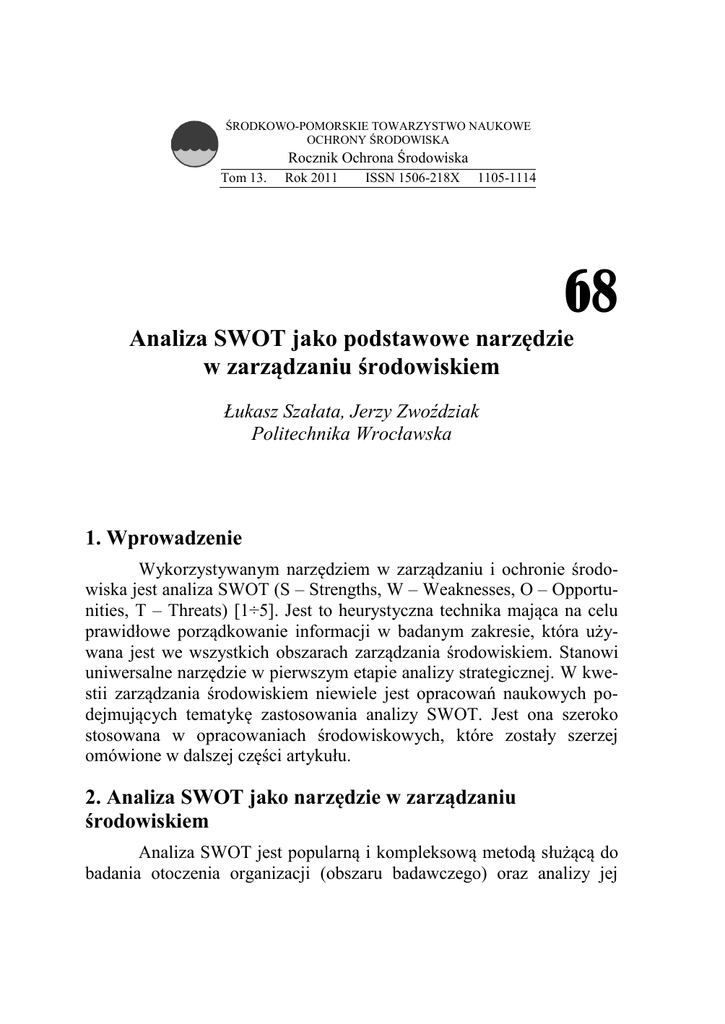 ŚRODKOWO-POMORSKIE TOWARZYSTWO NAUKOWE OCHRONY ŚRODOWISKA Rocznik Ochrona Środowiska Tom 13. Rok 2011 ISSN 1506-218X 1105-1114 68 Analiza SWOT jako podstawowe narzędzie w zarządzaniu środowiskiem Łukasz Szałata, Jerzy Zwoździak Politechnika Wrocławska 1. Wprowadzenie Wykorzystywanym narzędziem w zarządzaniu i ochronie środowiska jest analiza SWOT (S – Strengths, W – Weaknesses, O – Opportunities, T – Threats) [1÷5]. Jest to heurystyczna technika mająca na celu prawidłowe porządkowanie informacji w badanym zakresie, która używana jest we wszystkich obszarach zarządzania środowiskiem. Stanowi uniwersalne narzędzie w pierwszym etapie analizy strategicznej. W kwestii zarządzania środowiskiem niewiele jest opracowań naukowych podejmujących tematykę zastosowania analizy SWOT. Jest ona szeroko stosowana w opracowaniach środowiskowych, które zostały szerzej omówione w dalszej części artykułu. 2. Analiza SWOT jako narzędzie w zarządzaniu środowiskiem Analiza SWOT jest popularną i kompleksową metodą służącą do badania otoczenia organizacji (obszaru badawczego) oraz analizy jej 1106 Łukasz Szałata, Jerzy Zwoździak wnętrza. Analiza wewnętrzna ma na celu określenie i ocenę zarówno materialnych i niematerialnych czynników sprzyjających rozwojowi danej organizacji lub utrudniających jego funkcjonowanie w czasie teraźniejszym, jak również w przyszłości. SWOT jest algorytmem procesu analizy strategicznej, propozycją systematycznej i wszechstronnej oceny zewnętrznych i wewnętrznych czynników określających kondycję bieżącą i potencjał rozwojowy danej organizacji, firmy czy programu. Zakres rodzajowy czynników, które mają wpływ na przedmiot analizy SWOT jest bardzo szeroki. Z jednej strony są to czynniki zewnętrzne i wewnętrzne dotyczące zarządzania środowiskiem, a z drugiej czynniki pozytywne i negatywne. Podstawą analizy SWOT jest prawidłowa identyfikacja następujących kategorii czynników SWOT [6]: Zewnętrzne pozytywne (szanse) – należy znaleźć w otoczeniu kluczowe czynniki, które pozwalają na utrzymanie pozycji lub jej ekspansję, a jednocześnie zagrożenia. Zewnętrzne negatywne (zagrożenia) – należy zidentyfikować w otoczeniu kluczowe czynniki, które stanowią przeszkodę dla utrzymania pozycji, rozwoju lub ekspansji. Zagrożenia mają negatywny wpływ przede wszystkim na utrzymanie pozycji, jak również na perspektywy rozwoju. Skuteczna ich identyfikacja jest podstawą opracowania prawidłowej strategii. Wewnętrzne pozytywne (mocne strony) – identyfikacja mocnych stron wynika ze znajomości przedmiotu analizy. Im ta znajomość jest głębsza, tym wynik analizy jest bardziej efektywny. Mocne strony uzależnione są od rodzaju przedmiotu analizy. Praktycznie w każdym przypadku mocne strony stanowią wynik wszelkiego rodzaju zasobów i kwalifikacji przedmiotu analizy. Wewnętrzne negatywne (słabe strony) – identyfikacja słabych stron przebiega podobnie jak identyfikacja mocnych stron przedmiotu analizy i jest wynikiem znajomości tego przedmiotu. Praktycznie w każdym przypadku słabe strony stanowią wynik wszelkiego rodzaju braku zasobów i braku kwalifikacji przedmiotu analizy. Rozpatrzono te czynniki zgodnie z informacją strategiczną sklasyfikowaną według opisanych powyżej kryteriów i opracowano analizę Analiza SWOT jako podstawowe narzędzie w zarządzaniu środowiskiem 1107 SWOT współpracy międzynarodowej w zakresie gospodarowania wodami w Unii Europejskiej na przykładzie dorzecza Odry i Łaby. Analiza SWOT jest punktem wyjścia do opracowania dwóch macierzy TOWS. Pierwszy wariant obejmuje analizę „z zewnątrz do wewnątrz”, drugi obejmuje analizę „od wewnątrz na zewnątrz”. Oba podejścia wzajemnie się uzupełniają, co umożliwia optymalizację strategii współpracy międzynarodowej ze szczególnym uwzględnieniem organizacji i zarządzania. Na podstawie przeprowadzonej analizy SWOT uzyskano m. in. następujące rezultaty: Prowadzona współpraca międzynarodowa ma niewielką przewagę mocnych stron nad słabymi stronami, Współpraca ma za zadanie wykorzystać istniejące i pojawiające się szanse, takie jak m.in.: Opracowanie modelu operacyjnego w ramach współpracy międzynarodowej w zakresie gospodarowania wodami mającego na celu racjonalne gospodarowanie zasobami wodnymi zgodnie z zasadą zrównoważonego rozwoju i korzystania z wód w celu osiągnięcia dobrego stanu wód do 2015 roku, Obniżenie kosztów prowadzonej współpracy międzynarodowej poprzez efektywne i skorelowane podejmowanie wspólnych działań, Racjonalne planowanie i podział nakładów rzeczowych i finansowych jest uzależnione od tempa wdrożenia modelu, co w rezultacie doprowadzi do znacznego obniżenia kosztów, Skoordynowanie prac związanych z wdrażaniem Ramowej Dyrektywy Wodnej oraz ustalenie ładu instytucjonalnego, Rozgraniczenie zadań i kompetencji pomiędzy Komisjami, Budowa hierarchicznego systemu decyzyjnego i nadanie stosownych uprawnień. Uzyskane dane pozwoliły na podjęcie decyzji co do najlepszej strategii działania i opracowania modelu operacyjnego współpracy międzynarodowej i wymiany informacji w zakresie efektywnego gospodarowania wodami w Unii Europejskiej dla dorzecza Odry i Łaby. Całościowa analiza współpracy międzynarodowej oraz określenie kluczowych czynników było podstawą do opracowania modelu, który zawiera funkcję dynamiczną w skali czasu (tzn. w okresie do 2015 roku 1108 Łukasz Szałata, Jerzy Zwoździak z uwzględnieniem derogacji co 6 lat tzn. rok 2021 i 2027) oraz uwzględnia rozpatrywane parametry: czasowe, finansowe, technologiczne, decyzyjne, przestrzenne oraz prawne, w powiązaniu ze złożonymi procesami decyzyjnymi zmierzającymi do poprawy stanu jakości wód oraz zapobiegania skutkom susz i powodzi w ramach gospodarowania wodami w Unii Europejskiej, z uwagą zwróconą na odpowiednio prowadzoną współpracę między