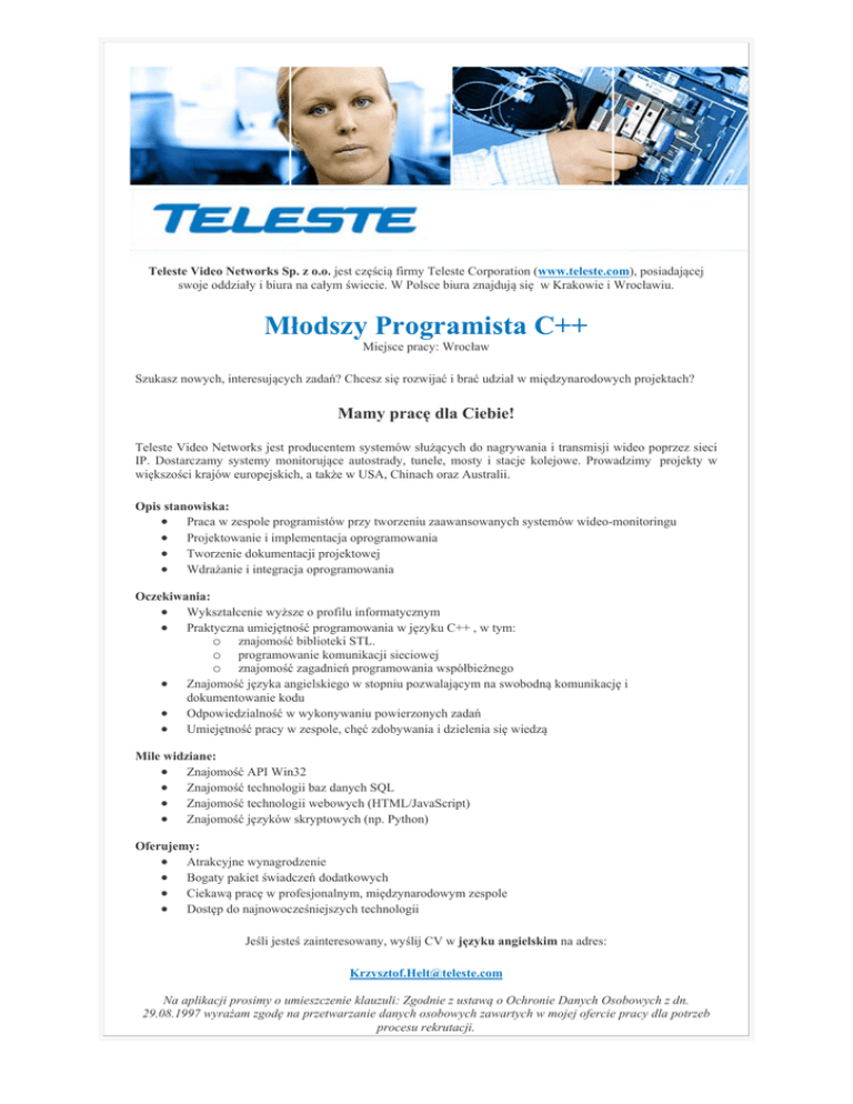 Teleste Video Networks Sp. z o.o. jest częścią firmy Teleste Corporation (www.teleste.com), posiadającej swoje oddziały i biura na całym świecie. W Polsce biura znajdują się w Krakowie i Wrocławiu. Młodszy Programista C++ Miejsce pracy: Wrocław Szukasz nowych, interesujących zadań? Chcesz się rozwijać i brać udział w międzynarodowych projektach? Mamy pracę dla Ciebie! Teleste Video Networks jest producentem systemów służących do nagrywania i transmisji wideo poprzez sieci IP. Dostarczamy systemy monitorujące autostrady, tunele, mosty i stacje kolejowe. Prowadzimy projekty w większości krajów europejskich, a także w USA, Chinach oraz Australii. Opis stanowiska: Praca w zespole programistów przy tworzeniu zaawansowanych systemów wideo-monitoringu Projektowanie i implementacja oprogramowania Tworzenie dokumentacji projektowej Wdrażanie i integracja oprogramowania Oczekiwania: Wykształcenie wyższe o profilu informatycznym Praktyczna umiejętność programowania w języku C++ , w tym: o znajomość biblioteki STL. o programowanie komunikacji sieciowej o znajomość zagadnień programowania współbieżnego Znajomość języka angielskiego w stopniu pozwalającym na swobodną komunikację i dokumentowanie kodu Odpowiedzialność w wykonywaniu powierzonych zadań Umiejętność pracy w zespole, chęć zdobywania i dzielenia się wiedzą Mile widziane: Znajomość API Win32 Znajomość technologii baz danych SQL Znajomość technologii webowych (HTML/JavaScript) Znajomość języków skryptowych (np. Python) Oferujemy: Atrakcyjne wynagrodzenie Bogaty pakiet świadczeń dodatkowych Ciekawą pracę w profesjonalnym, międzynarodowym zespole Dostęp do najnowocześniejszych technologii Jeśli jesteś zainteresowany, wyślij CV w języku angielskim na adres: [email protected] Na aplikacji prosimy o umieszczenie klauzuli: Zgodnie z ustawą o Ochronie Danych Osobowych z dn. 29.08.1997 wyrażam zgodę na przetwarzanie danych osobowych zawartych w mojej ofercie pracy dla potrzeb procesu rekrutacji.