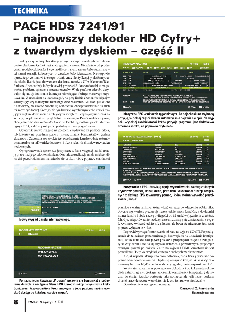 TECHNIKA PACE HDS 7241/91 – najnowszy dekoder HD Cyfry+ z twardym dyskiem – część II Jedn¹ z najbardziej charakterystycznych i rozpoznawalnych cech dekoderów platformy Cyfra+ jest szata graficzna menu. Niezale¿nie od producenta, modelu odbiornika i jego mo¿liwoœci, menu zawsze by³o utrzymane w tej samej tonacji, kolorystyce, w zasadzie by³o identyczne. Niew¹tpliwie oprócz tego, ¿e stanowi to swego rodzaju znak identyfikacyjny platformy, takie ujednolicenie jest u³atwieniem dla konsultantów z CTA (Centrum Telefoniczne Abonentów), których ³atwiej przeszkoliæ i którym ³atwiej zareagowaæ na problemy zg³aszane przez abonentów. Wiele platform tak robi, decyduj¹c siê na ujednolicenie interfejsu u³atwiaj¹ce obs³ugê masowego u¿ytkownika. Z naciskiem na „masowego”, bo przy liczbie abonentów id¹cej w setki tysiêcy, czy miliony ma to niebagatelne znaczenie. Ale to co jest dobre dla nadawcy, nie zawsze podoba siê odbiorcom (choæ paradoksalnie dla nich te¿ mo¿e byæ dobre). Szczególnie tym bardziej wyrobionym technicznie i maj¹cym wiêksze doœwiadczenia z tego typu sprzêtem. I chyba przyszed³ czas na zmiany, bo jak widaæ na przyk³adzie najnowszego Pace’a nadchodz¹ one, choæ jeszcze bardzo nieœmia³o. Na razie facelifting dotkn¹³ pasek informacyjny i EPG, w dalszej kolejnoœci podobny styl ma przyj¹æ menu. Odbiornik ¿wawo reaguje na polecenia wydawane za pomoc¹ pilota, lub klawiszy na przednim panelu (menu, zmiany komunikatów, grafika ekranowa). Zadowalaj¹co szybkie jest prze³¹czanie kana³ów, dwie sekundy w przypadku kana³ów niekodowanych i oko³o sekundy d³u¿ej, w przypadku kodowanych. Oprogramowanie systemowe jest jeszcze w fazie wstêpnej i nadal trwaj¹ prace nad jego udoskonalaniem. Ostatnia aktualizacja mia³a miejsce kilka dni przed oddaniem materia³ów do druku i obok poprawy stabilnoœci Klasyczne EPG w układzie tygodniowym. Po najechaniu na wybraną pozycję, w dolnej części ekranu automatycznie pojawia się opis. Na wyjściu wysokiej rozdzielczości każda pozycja programu jest dodatkowo otoczona ramką, co poprawia czytelność. Korzystanie z EPG ułatwiają opcje wyszukiwania według zadanych kryteriów: gatunek, kanał, dzień, pora dnia. Większości funkcji związanych z obsługą EPG towarzyszy pomoc,, którą można wywołać przyciskiem „Twoje”. Nowy wygląd panelu informacyjnego. Po naciśnięciu klawisza „Program” pojawia się komunikat o pobieraniu danych, a następnie Menu EPG. Oprócz funkcji związanych z Elektronicznym Przewodnikiem Programowym, z jego poziomu można uzyskać dostęp do katalogu swoich nagrań. 8 TV-Sat Magazyn • 03.10 przynios³a wa¿n¹ zmianê, któr¹ widaæ od razu po w³¹czeniu odbiornika: obecnie wyœwietlacz prezentuje nazwy odbieranych kana³ów, a dok³adniej numer kana³u i obok nazwê o d³ugoœci do 12 znaków (³¹cznie 16 znaków). Choæ ju¿ nieporównanie rzadziej, czasem zdarzaj¹ siê zawieszenia, z regu³y wystarczy wy³¹czyæ odbiornik pilotem, ale bywa, ¿e niezbêdny jest reset poprzez wy³¹czenie z sieci. Poprawki wymaga formatowanie obrazu na wyjœciu SCART. Po pod³¹czeniu do telewizora panoramicznego, bez wzglêdu na ustawienia konfiguracji, obraz kana³ów nadaj¹cych przekaz o proporcjach 4:3 jest rozci¹gniêty na ca³y ekran i nie da siê uzyskaæ ustawienia prawid³owych proporcji z czarnymi pasami po bokach. Za to na wyjœciu HDMI formatowanie jest prawid³owe. To tylko przyk³ad jednego z drobnych mankamentów. Ale jak wspomnia³em jest to nowy odbiornik, nadal trwaj¹ prace nad poprawieniem oprogramowania i bêd¹ siê ukazywaæ kolejne aktualizacje Zauwa¿onych dzisiaj b³êdów, za kilka dni czy tygodni, mo¿e po prostu nie byæ. Wentylator rusza zaraz po w³¹czeniu dekodera i po kilkunastu sekundach zatrzymuje siê, czekaj¹c a¿ czujnik kontroluj¹cy temperaturê da sygna³ do startu. Rzadko wystêpuje taka potrzeba, ale jeœli nawet podczas d³ugiej pracy dekodera wentylator siê krêci, jest prawie nies³yszalny. Dokoñczenie w nastêpnym numerze. Opracowa³ Z. Marchewka Ilustracje autora