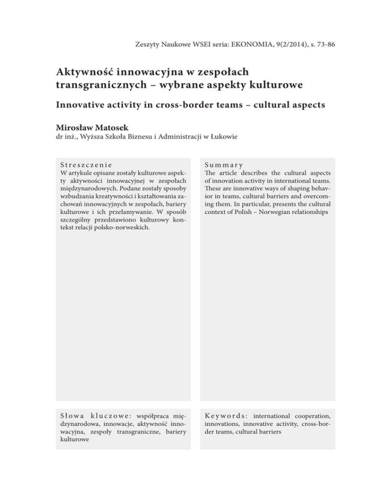 Zeszyty Naukowe WSEI seria: EKONOMIA, 9(2/2014), s. 73-86 Aktywność innowacyjna w zespołach transgranicznych – wybrane aspekty kulturowe Innovative activity in cross-border teams – cultural aspects Mirosław Matosek dr inż., Wyższa Szkoła Biznesu i Administracji w Łukowie Streszczenie Summar y S ł o w a k l u c z o w e : współpraca mię- K e y w o r d s : international cooperation, W artykule opisane zostały kulturowe aspekty aktywności innowacyjnej w zespołach międzynarodowych. Podane zostały sposoby wzbudzania kreatywności i kształtowania zachowań innowacyjnych w zespołach, bariery kulturowe i ich przełamywanie. W sposób szczególny przedstawiono kulturowy kontekst relacji polsko-norweskich. dzynarodowa, innowacje, aktywność innowacyjna, zespoły transgraniczne, bariery kulturowe The article describes the cultural aspects of innovation activity in international teams. These are innovative ways of shaping behavior in teams, cultural barriers and overcoming them. In particular, presents the cultural context of Polish – Norwegian relationships innovations, innovative activity, cross-border teams, cultural barriers Zeszyty Naukowe WSEI seria: EKONOMIA, 9(2/2014) 74 WSEI Scientific Journal series: ECONOMICS, 9(2/2014) Wstęp Tworzenie śmiałych, innowacyjnych rozwiązań w zespołach badawczych i projektowych wymaga różnorodności, a tę w największym stopniu zapewnia wielokulturowość. W międzynarodowym zespole zwiększa się szansa na sukces i równocześnie wzrasta prawdopodobieństwo porażki. W artykule przedstawiono kulturowe aspekty aktywności innowacyjnej w zespołach transgranicznych. Opisano sposoby kształtowania zachowań innowacyjnych, zalety i wady zespołów wirtualnych, bariery kulturowe i ich przełamywanie. W sposób szczególny przedstawiony został kulturowy kontekst aktywności innowacyjnej z udziałem Norwegów i Polaków. 1 .Kre at y w noś ć i i nnow a c j a w ku ltu r z e organizac y jnej z esp o łu Kluczowym elementem spójnej strategii działania zespołów badawczych i projektowych są: kreatywność i innowacyjność, będące częśćią natury ludzkiej, bo wszyscy na swój sposób uczestniczymy w rozwiązywaniu problemów. Kreatywność, jak twierdzi C.M. Ford 1jest: t subiektywną oceną wartości i oryginalności działania jednostki lub grupyumieszczona w specyficznym kontekście- w którym oferuje się nowe idee, produkty, sposoby postępowania. Kreatywność przejawia się w wielu formach w kontekście zespołów badawczych i projektowych i na potrzeby artykułu można przyjąć za T. Sztuckim2, że jest to zdolność do: t twórczego myślenia, t łączenia różnych pomysłów w oryginalny i unikalny sposób, t przyjmowania nowych założeń – widzenia rzeczy z nowej perspektywy, t wysuwania pomysłów, t robienia czegoś nowego lub tego samego, lecz w lepszy sposób, t jest to również niezwykłe kojarzenie różnych myśli i poglądów. Innowacja natomiast to świadome wprowadzanie nowych pomysłów do praktyki życia społecznego, techniki i gospodarki. Autorzy „Podręcznego słownika menedżera”, T. Janusz i L. Lewandowska3 wyróżniają innowacje w sensie czynnościowym i rzeczowym. Zmiany w sensie czynnościowym polegają m. in. na: t procesie budowania od podstaw nowej (całej lub fragmentu) organizacji, 1 2 3 C. M. Ford, D.A. Giona, Creative Action in Organization, [w:] M. A. West, Rozwijanie kreatywności wewnątrz organizacji, Wydawnictwo Naukowe PWN, Warszawa 2000, s. 12-14 T. Sztucki, Encyklopedia marketingu, Agencja Wydawnicza „Placet”, Warszawa 1998, s. 142 T. Janusz, L. Lewandowska, Podręczny słownik menedżera, Wyd. RES POLONA Sp. z o. o., Łódź 1993, s. 74 Mirosław Matosek Aktywność innowacyjna w zespołach transgranicznych – wybrane aspekty kulturowe 75 t usprawnianiu organizacji, t reorganizacji czyli zmiany o zasadniczym charakterze. W wielu definicjach różnych autorów zakres pojęcia innowacje jest dość szeroki i dość swobodnie interpretowany. Różnice wynikają z odmiennej perspektywy widzenia na zakres wprowadzanych nowości, obszar zmian i ich oddziaływanie na organizację i otoczenie. Na potrzeby artykułu przyjęto za R.A. Webberem, że „innowacje są to twórcze zmiany w systemie społecznym, w strukturze gospodarczej, w technice oraz w przyrodzie”.4 Zmiany w sensie rzeczowym to innowacje naukowo-techniczne, które polegają m. in. na: t wprowadzaniu do produkcji nowych wynalazków technicznych, t stworzeniu lepszej technologii t wprowadzeniu usprawnień, które umożliwią ilościowy i jakościowy wzrost inwestycji. Inne powiązania pomiędzy kreatywnością a aktywnością innowacyjną to:5 t kreatywność interesariuszy zaangażowany w proces innowacyjny (zapoczątkowany twórczym myśleniem) ma znaczenie w każdym jego etapie, t innowacyjność w miękkich obszarach częściej wymaga kreatywności niż umiejętności technicznych, t coraz większego znaczenia w procesach innowacyjnych nabiera kreatywność zespołowa, t na innowacyjność organizacji mają również wpływ osoby niezaangażowane w proces innowacyjny; opór tych osób i niska kreatywność osób zaangażowanych wpływają na obniżenie innowacyjności. Proces innowacyjny według R. L. Dafta przebiega w następujących etapach:6 t pojawienie się potrzeby ( brak satysfakcji z istniejących rozwiązań), t wygenerowanie pomysłów – zbioru możliwych potencjalnych rozwiązań), t projekt – zbiorowy proces twórczy polegający na ukształatowaniu pomysłu ( zbioru pomysłów ) w formie pozwalającej na jego praktyczne wykorzystanie, t decyzja o wdrożeniu lub odrzuceniu projektu poprzedzona analizą techniczną i ekonomiczną, t wprowadzenie opracowanego rozwiązania w życie. Zespoły naukowo-badawcze i projektowe chcąc realizować innowacyjne, śmiałe rozwiązania wymagają różnorodności, a tę w największym stopniu zapewnia wielokulturowość. Zderzenie różnych doświadczeń,