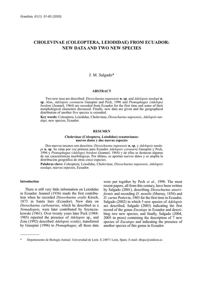 Graellsia, 61(1): 51-60 (2005) CHOLEVINAE (COLEOPTERA, LEIODIDAE) FROM ECUADOR: NEW DATA AND TWO NEW SPECIES J. M. Salgado* ABSTRACT Two new taxa are described: Dissochaetus napoensis n. sp. and Adelopsis tandapi n. sp. Also, Adelopsis coronaria Gnaspini and Peck, 1996 and Ptomaphagus (Adelops) bordoni (Jeannel, 1964) are recorded from Ecuador for the first time and some of their morphological characters discussed. Finally, new data are given and the geographical distribution of another five species is extended. Key words: Coleoptera, Leiodidae, Cholevinae, Dissochaetus napoensis, Adelopsis tandapi, new species, Ecuador. RESUMEN Cholevinae (Coleoptera, Leiodidae) ecuatorianos: nuevos datos y dos nuevas especies Dos nuevos taxones son descritos: Dissochaetus napoensis n. sp. y Adelopsis tandapi n. sp. Se citan por vez primera para Ecuador Adelopsis coronaria Gnaspini y Peck, 1996 y Ptomaphagus (Adelops) bordoni (Jeannel, 1964) y de ellas se destacan algunas de sus características morfológicas. Por último, se aportan nuevos datos y se amplía la distribución geográfica de otras cinco especies. Palabras clave: Coleoptera, Leiodidae, Cholevinae, Dissochaetus napoensis, Adelopsis tandapi, nuevas especies, Ecuador. Introduction There is still very little information on Leiodidae in Ecuador. Jeannel (1936) made the first contribution when he recorded Dissochaetus ovalis Kirsch, 1873 in Santa Inés (Ecuador). New data on Dissochaetus carbonarius, which he described as a Nemadiopsis, were later contributed by Szymczakowski (1961). Over twenty years later Peck (19841985) reported the presence of Adelopsis sp., and Zoia (1992) described Adelopsis sciakyi, transferred by Gnaspini (1996) to Ptomaphagus; all these data * were put together by Peck et al., 1998. The most recent papers, all from this century, have been written by Salgado (2001), describing Dissochaetus anseriformis and recording D. monilis (Murray, 1856) and D. curtus Portevin, 1903 for the first time in Ecuador; Salgado (2002) in which 5 new species of Adelopsis are described; Salgado (2003) indicating the first record of the genus Eucatops in Ecuador and describing two new species; and finally, Salgado (2004, 2005–in press) containing the description of 7 new species of Eucatops and indicating the presence of another species of this genus in Ecuador. Departamento de Biología Animal. Universidad de León. E-24071 León, Spain. E-mail: [email protected] 52 SALGADO This paper contributes to the knowledge of various species of Leiodidae with new information on four genera, including: Adelopsis, with the description of a new species, the first record of and new data on the distribution of another two; Eucatops with new data on another four species; Dissochaetus with the description of a new species and Ptomaphagus with the first record of a species from Ecuador. Material studied The material used for this paper belongs to Dr. S. B. Peck’s collection at the University of Carleton, Ottawa, Ontario (Canada), which will be deposited in the collection of the Canadian Museum of Nature (CMN), Aylmer, Quebec (Canada); and that of the Museo de la Pontificia Universidad de Quito, Ecuador (QCAZ-Museum). Results and discussion Tribe Anemadini Hatch, 1928 Dissochaetus napoensis n. sp. m TYPICAL SERIE: Holotype : Ecuador, Napo province, 15 km NW Baeza, 2200 m, 2-6/III/1976, carrion-baited pitfall trap, S. Peck leg. Colection Canadian Museum of Nature (CMN), Aylmer, Quebec (Canada); Paratypes: 1 y 1 . Ecuador, Napo province, 15 km NW Baeza, 2200 m, 2-6/III/1976, carrion-baited pitfall traps, S. Peck leg. CMN, Aylmer, Quebec (Canadá), 1 , and Salgado Collection, Animal Biology Department, León University, 1 . m f f m DIAGNOSIS: 7th segment of antennae strongly robust and 8th asymmetrical. Aedeagus with robust parameres, longer than median lobe, curved inwards in slightly narrow apical region. Apical region of internal sac with two well-sclerotized symmetrical pieces; basal region with a small kidney-shaped piece at the bottom. Spermathecal lobes large and strongly sclerotized, long membranous joining duct. DESCRIPTION OF THE HOLOTYPE. Length: 3.60 mm (length of paratypes: 3.70-3.80 mm). Generally elongate oval-shaped body (Fig. 1). Color uniform dark brown. Pubescence very fine, yellowish short and laid back, thicker on head than on pronotum and elytra. Numerous strong punctures on the head, with slightly uneven points, the separation between them being less than their diameter. Eyes highly developed, as are the metathoracic wings. Fig. 1.— Habitus of Dissochaetus napoensis n. sp. (scale bar = 1 mm). Fig. 1.— Habitus de Dissochaetus napoensis n. sp. (barra de escala = 1 mm). Antennae long, twice the length of the pronotum (Fig. 2), the 7th, 9th and 10th segments of which are slightly asymmetrical, the 8th being clearly asymmetrical; 2nd and 3rd segments equal, 6th segment shorter than 5th; finally, 6th to 10th segments transverse, the 7th being the most robust. Antennal club highly developed. Using the length of the 9th segment as a basis, relative length of each segment from 1st to 11th: 1.67, 1.37, 1.37, 0.93, 0.86, 0.70, 1.10, 0.40, 1.00, 1.04, 1.76; ratios of length to width of each segment, respectively: 2.50, 2.20, 2.15, 1.44, 1.04, 0.70, 0.75, 0.50, 0.76, 0.80, 1.50. CHOLEVINAE FROM ECUADOR: NEW DATA AND NEW SPECIES Figs. 2-5.— Dissochaetus napoensis n. sp. 2) antenna; 3) genital segment; 4) aedeagus, dorsal view; 5) aedeagus, ventral view. (scale bar = 0.25 mm). Figs. 2-5.— Dissochaetus napoensis n. sp. 2) antena; 3) segmento genital; 4) edeago, vista dorsal; 5) edeago, vista ventral. (barra de escala = 0.25 mm). 53 54 Pronotum narrower than elytra, 1.80 times wider than long; sides uniformly arched, maximum width at basal two thirds; posterior angles weakly acute and weakly protruding; punctures strongly granulose. Elytra weakly convex, with uniformly rounded sides, and 1.40 times longer than wide; transverse striolae well mark
