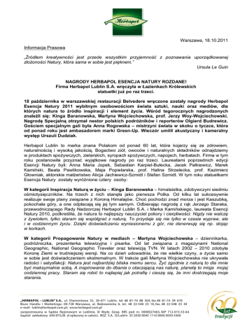 Warszawa, 18.10.2011 Informacja Prasowa „Źródłem kreatywności jest przede wszystkim przyjemność z poznawania uporządkowanej złożoności Natury, która sama w sobie jest pięknem.” Ursula Le Guin NAGRODY HERBAPOL ESENCJA NATURY ROZDANE! Firma Herbapol Lublin S.A. wręczyła w Łazienkach Królewskich statuetki już po raz trzeci. 18 października w warszawskiej restauracji Belvedere wręczone zostały nagrody Herbapol Esencja Natury 2011 wybitnym osobowościom świata sztuki, nauki oraz mediów, dla których natura to źródło inspiracji i element życia. Wśród tegorocznych nagrodzonych znaleźli się: Kinga Baranowska, Martyna Wojciechowska, prof. Jerzy Woy-Wojciechowski. Nagrodę Specjalną otrzymał nestor polskich podróżników i reporterów Olgierd Budrewicz. Gościem specjalnym gali była Anna Rogowska – mistrzyni świata w skoku o tyczce, która od ponad roku jest ambasadorem marki Green-Up. Wieczór umilił akustyczny i kameralny występ Urszuli Dudziak. Herbapol Lublin to marka znana Polakom od ponad 60 lat, która kojarzy się ze zdrowiem, naturalnością i wysoką jakością. Bogactwo ziół, owoców i naturalnych składników odnajdziemy w produktach spożywczych, zielarskich, syropach spożywczych, napojach, herbatach. Firma w tym roku postanowiła przyznać wyjątkowe nagrody po raz trzeci. Laureatami poprzednich edycji Esencji Natury byli: Anna Maria Jopek, Sebastian Karpiel-Bułecka, Jacek Pałkiewicz, Marek Kamiński, Beata Pawlikowska, Maja Popielarska, prof. Halina Strzelecka, prof. Kazimierz Głowniak, aktorskie małżeństwo Alicja Jachiewicz-Szmidt i Stefan Szmidt. W tym roku statuetkami Esencja Natury zostały wyróżnione cztery osoby: W kategorii Inspiracja Naturą w życiu – Kinga Baranowska – himalaistka, zdobywczyni siedmiu ośmiotysięczników. Na trzech z nich stanęła jako pierwsza Polka. Od kilku lat sukcesywnie realizuje swoje plany związane z Koroną Himalajów. Choć pochodzi znad morza i jest Kaszubką, pokochała góry, a one odpłacają się jej tym samym. Odbierając nagrodę z rąk Jerzego Staraka, przewodniczącego Rady Nadzorczej Herbapol Lublin S.A. i Marka Kamińskiego, laureata Esencji Natury 2010, podkreśliła, że natura to najlepszy nauczyciel pokory i cierpliwości: Nigdy nie walczę z żywiołem, tylko staram się współgrać z naturą. To przydaje się nie tylko w czasie wypraw, ale i w codziennym życiu. Dzięki doświadczeniu wyniesionemu z gór, nie denerwuję się np. stojąc w korkach. W kategorii Propagowanie Natury w mediach – Martyna Wojciechowska – dziennikarka, podróżniczka, prezenterka telewizyjna i pisarka. Od lat związana z magazynami National Geographic, National Geographic Traveler oraz telewizją TVN. W latach 2002 – 2010 zdobyła Koronę Ziemi w trudniejszej wersji. Na co dzień udowadnia, że nie wielkie czyny, a życie samo w sobie jest doświadczeniem ekstremalnym. W trakcie gali Martyna Wojciechowska nie ukrywała radości i satysfakcji: Natura jest najbardziej bliska memu sercu. Żyć zgodnie z naturą to dla mnie być maksymalnie sobą. A inspirowanie do dbania o otaczającą nas naturę, planetę to misja mojej codziennej pracy. Staram się robić to najlepiej jak potrafię i cieszę się, że inni dostrzegają moje starania. W kategorii Inspiracja i obecność Natury w pracach naukowych – Prof. Jerzy WoyWojciechowski – lekarz, pasjonat leków ziołowych, orędownik stworzenia Sekcji Fitoterapii Polskiego Towarzystwa Lekarskiego, wieloletni prezes PTL, specjalista w zakresie ortopedii, chirurgii urazowej, medycyny nuklearnej, popularyzator medycyny. Pianista i kompozytor pokaźnej liczby utworów. Twórca m.in. przebojów „Goniąc Kormorany” Piotra Szczepanika, „Tylko nie pal” Maryli Rodowicz (do słów Agnieszki Osieckiej). Profesor został doceniony za wkład w reaktywację Sekcji Fitoterapii PTL, które m.in. promuje racjonalną fitoterapię w praktyce lekarskiej, wspiera badania naukowe w dziedzinie farmakologii doświadczalnej i klinicznej leku roślinnego oraz gromadzi doświadczalną wiedzę lekarską związaną ze stosowaniem preparatów roślinnych w profilaktyce i terapii. Laureatem Nagrody Specjalnej został w tym roku Olgierd Budrewicz – dziennikarz, podróżnik, felietonista, pisarz, varsavianista. Jako dziennikarz podróżował po całym świecie, objechał Europę, obydwie Ameryki, Australię i Oceanię. Jest autorem ponad 100 książek na temat Warszawy, Polski, oraz różnych odległych zakątków świata. Statuetkę wręczył mu Prezes firmy Herbapol – Roman Górny m.in. za odkrywanie dla nas bliskich i odległych zakątków, pozostających do dzisiaj w swej niezmienności, za dawanie świadectwa podbojom i ujarzmianiu pierwotnej dzikości. Za malowanie słowami klimatu żywej, niebezpiecznej dżungli, za rozmiłowanie w przyrodzie i w historii, za nieustanne bycie „zawsze z Polską w sercu”, za świadomość „bycia wszędzie”, za utrwalenie piękna polskiego krajobrazu w obliczu stałego postępu cywilizacyjnego i podróże śladami przeszłości. Laureat z dystansem odniósł się do swojego wieku i kondycji, której niejeden mógłby mu pozazdrościć: Podpieram się laską, ale to nie jest zwykła laska. To symbol. Statuetka Esencja Natury, którą właśnie otrzymałem i moja laska dowodzą, że jeszcze wiele w życiu mogę osiągnąć. Wyróżnienia laureatom Esencja Natury 2011 gratulowali m.in.: Edyta Herbuś, Anna Samusionek, Kasia Skrzynecka z mężem Marcinem Łopuckim, Andrzej Pągowski, Mariola Bojarska-Ferenc, Hanna Bakuła, najlepsza polska tyczkarka Anna Rogowska i laureaci Esencja Natury 2010: Marek Kamiński oraz aktorskie małżeństwo Alicja Jachiewicz-Szmidt i Stefan Szmidt. Galę poprowadził jak zwykle pogodny Bartłomiej Jędrzejak. Więcej informacji: BCMFD media communications Martyna Lewicka tel. 507 027 035 e-mail: [email protected]