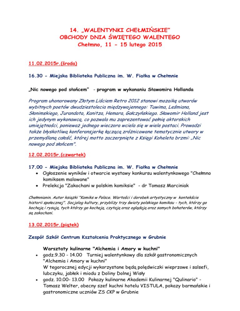 14. „WALENTYNKI CHEŁMIŃSKIE” OBCHODY DNIA ŚWIĘTEGO WALENTEGO Chełmno, 11 - 15 lutego 2015 11.02.2015r.(środa) 16.30 - Miejska Biblioteka Publiczna im. W. Fiałka w Chełmnie „Nic nowego pod słońcem” - program w wykonaniu Sławomira Hollanda Program uhonorowany Złotym Liściem Retro 2012 stanowi mozaikę utworów wybitnych poetów dwudziestolecia międzywojennego: Tuwima, Leśmiana, Słonimskiego, Jurandota, Kanitza, Hemara, Gałczyńskiego. Sławomir Holland jest ich jedynym wykonawcą, co pozwala mu zaprezentować pełnię aktorskich umiejętności, ponieważ jednego wieczora wciela się w wiele postaci. Prowadzi także błyskotliwą konferansjerkę łączącą zróżnicowane tematycznie utwory w przemyślaną całość, której motto zaczerpnięte z Księgi Koheleta brzmi: „Nic nowego pod słońcem". 12.02.2015r.(czwartek) 17.00 - Miejska Biblioteka Publiczna im. W. Fiałka w Chełmnie  Ogłoszenie wyników i otwarcie wystawy konkursu walentynkowego "Chełmno komiksem malowane"  Prelekcja "Zakochani w polskim komiksie" - dr Tomasz Marciniak Chełmnianin. Autor książki "Komiks w Polsce. Wartości i dorobek artystyczny w kontekście historii społecznej". Socjolog kultury, przybliży trzy światy polskiego komiksu - tych, którzy go kochają i rysują, tych którzy go kochają, czytają oraz oglądają oraz samych bohaterów, którzy są zakochani. 13.02.2015r.(piątek) Zespół Szkół Centrum Kształcenia Praktycznego w Grubnie   Warsztaty kulinarne "Alchemia i Amory w kuchni" godz.9.30 - 14.00 Turniej walentynkowy dla szkół gastronomicznych "Alchemia i Amory w kuchni" W tegorocznej edycji wykorzystane będą polędwiczki wieprzowe i salsefi, lubczyku, jabłek i miodu z Doliny Dolnej Wisły godz. 10.00- 13.00 Pokazy kulinarne Akademii Kulinarnej "Qulinario" Tomasz Welter, obecny szef kuchni hotelu VISTULA, pokazy barmańskie i gastronomiczne uczniów ZS CKP w Grubnie 16.00 i 18.30 - Sala koncertowa Państwowej Szkoły Muzycznej w Chełmnie Koncert OPERUS ARTE "Operetka PrzeBoye i jej czułe słówka" Bukiet muzyczno-teatralny, łączący najpiękniejsze hity operetkowe i te mniej znane w spójną całość, którego podstawą jest miłość z jej wszystkimi odcieniami. Jest to splot różnych emocji począwszy od młodzieńczych uniesień, przez flirt, zdradę do gorących namiętności. Artyści zdecydowanie większy nacisk kładą na zabawne perypetie damsko-męskie, śmieszne dialogi i scenki teatralne niż w poprzednim projekcie Operetka. Zaśpiewajmy o miłości.., tworząc pełne ognia, temperamentu i humoru operetkowe widowisko! Warto zaznaczyć, iż grupa artystyczna Operus Arte swoją działalność koncertową rozpoczęła od września 2010 roku i od tego czasu wystąpili już w ponad 150 miastach (m.in. Toruń, Poznań, Grudziądz, Olsztyn, Konin, Suwałki, Ełk, Wałcz, Ostrów Wlkp.,) Skład Zespołu: Dorota Makulec -sopran, doktorantka Akademii Muzycznej w Łodzi Paweł Wytrążek -tenor, doktorant Akademii Muzycznej w Łodzi dr Piotr Żukowski -pianista, wykładowca Katedry Fortepianu Akademii Muzycznej Poznań Piotr Stanisław -konferansjer Operus Arte UWAGA: zaproszenia na koncert w cenie 10 zł do nabycia w Chełmińskim Domu Kultury / sekretariat / od dnia 3 lutego 2015 roku. 14.02.2014r.(sobota) od 10.00 do 14.00 możliwość zwiedzania zabytkowych kościołów Chełmna    Kościół św. Ducha – z Chorągwią Ziemi Chełmińskiej Kościół pw. św. Jakuba Starszego i św. Mikołaja - z Chełmińskim Bractwem Kurkowym Kościół pw. św. Jana Chrzciciela i św. Jana Ewangelisty /Zespół klasztorny/ - z Zastępem Rycerskim z Chełmna Adresy dostępne na stronie: www.chelmno.pl Kościół farny pw. Wniebowzięcia NMP  spotkania przy relikwii św. Walentego (od godz. 12.00-16.00 możliwość bezpłatnego zwiedzania kościoła z przewodnikiem)  wystawa prac z X Ogólnopolskiego Konkursu Plastycznego - Literackiego „Na Świętego Walentego - różne oblicza miłości  17.00 - msza św. w intencji małżonków i jubilatów z udziałem chóru Chorus Culmensis 16.00 Gimnazjum nr 1 w Chełmnie  Walentynkowy Charytatywny Maraton Zumby w Chełmnie! Całkowity dochód z imprezy zostanie przekazany na leczenie i rehabilitację Claudii Wesołowskiej! 9 letnia Claudia urodziła się z wadą mózgu, która nie pozwala Jej się prawidłowo rozwijać, Claudia ma bardzo dużo siły na walkę z chorobą, lecz leczenie jest bardzo kosztowne. Za zebrane pieniążki będzie mogła być rehabilitowana przez dobrych specjalistów, by w przyszłości uczyć się, bawić, biegać jak inne zdrowe dzieci. POKAŻMY JAK WIELKIE POTRAFIĄ BYĆ NASZE ZUMBOWE SERCA !!! MARATON POPROWADZĄ: Paweł Paczyński oraz Karolina Karzycka Zabieramy: DOBRY HUMOR, a oprócz tego ręcznik, dużo wody, gdyż będziemy spalać tysiące kalorii, obuwie sportowe i wygodny strój aby nie krępował ruchów, bo będzie ich mnóstwo :) Zapisy i informacje: e-mail: [email protected] oraz pod nr.tel. 508-160-163 WSTĘP: Cegiełka 20zł/ os Rynek miejski w Chełmnie  9.00 - Jarmark św. Walentego / informacje na stronie www.chelmno.pl oraz www.chdk.pl /  9.00 - Walentynkowy "Pit Stop!" - otwarta akcja bezpłatnego sprawdzenia podstawowego stanu technicznego samochodów  12.00 Happening "Walentynkowa ikona" Studia KreaTYwy Oferta dla turystów oraz mieszkańców Chełmna. Razem stworzymy niepowtarzalną ikonę w kształcie serca! Jak możesz stać się jej częścią? - To proste, wystarczy, że zostawisz ślad swojej dłoni na naszym sercu.  14.00 Muzeum Ziemi Chełmińskiej - „Chełmno - miasto zabytków i zakochanych”. Otwarcie wystawy z X Ogólnopolskich Warsztatów Plenerowych Studentów Architektury  14.30 Bramka Grudziądzka - Rynek "MIŁOŚĆ HISTORIĄ PISANA" Inscenizacja wielkiej miłości Oleńki i Kmicica na tle barwnej parady Rycerstwa, Braci Kurkowych, Stajni "Zagończyk" , motocyklistów z Klubu Motocyklowego FENIX, gości i mieszkańców. Od 15.00 RYNEK - scena główna  Ur