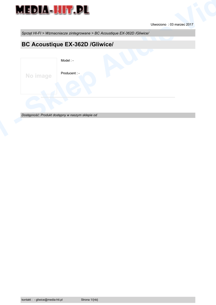 o i d d i V Utworzono : 03 marzec 2017 Sprzęt HI-FI > Wzmacniacze zintegrowane > BC Acoustique EX-362D /Gliwice/ BC Acoustique EX-362D /Gliwice/ Model : - No image l p p le Producent : - k S Dostępność: Produkt dostępny w naszym sklepie od kontakt : - [email protected] Strona 1/{nb} u A