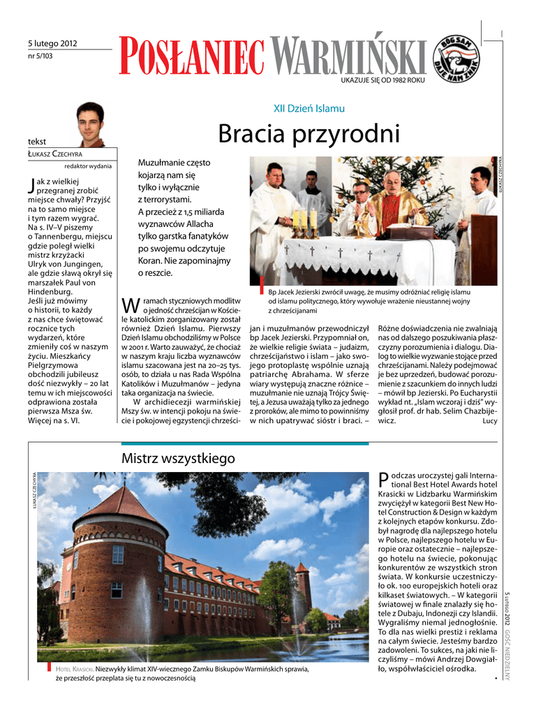 I 5 lutego 2012 nr 5/103 UKAZUJE SIĘ OD 1982 ROKU XII Dzień Islamu redaktor wydania J ak z wielkiej przegranej zrobić miejsce chwały? Przyjść na to samo miejsce i tym razem wygrać. Na s. IV–V piszemy o Tannenbergu, miejscu gdzie poległ wielki mistrz krzyżacki Ulryk von Jungingen, ale gdzie sławą okrył się marszałek Paul von Hindenburg. Jeśli już mówimy o historii, to każdy z nas chce świętować rocznice tych wydarzeń, które zmieniły coś w naszym życiu. Mieszkańcy Pielgrzymowa obchodzili jubileusz dość niezwykły – 20 lat temu w ich miejscowości odprawiona została pierwsza Msza św. Więcej na s. VI. Bracia przyrodni Łukasz Czechyra tekst Łukasz Czechyra Muzułmanie często kojarzą nam się tylko i wyłącznie z terrorystami. A przecież z 1,5 miliarda wyznawców Allacha tylko garstka fanatyków po swojemu odczytuje Koran. Nie zapominajmy o reszcie. W ramach styczniowych modlitw o jedność chrześcijan w Kościele katolickim zorganizowany został również Dzień Islamu. Pierwszy Dzień Islamu obchodziliśmy w Polsce w 2001 r. Warto zauważyć, że chociaż w naszym kraju liczba wyznawców islamu szacowana jest na 20–25 tys. osób, to działa u nas Rada Wspólna Katolików i Muzułmanów – jedyna taka organizacja na świecie. W archidiecezji warmińskiej Mszy św. w intencji pokoju na świecie i pokojowej egzystencji chrześci- Bp Jacek Jezierski zwrócił uwagę, że musimy odróżniać religię islamu od islamu politycznego, który wywołuje wrażenie nieustannej wojny z chrześcijanami jan i muzułmanów przewodniczył bp Jacek Jezierski. Przypomniał on, że wielkie religie świata – judaizm, chrześcijaństwo i islam – jako swojego protoplastę wspólnie uznają patriarchę Abrahama. W sferze wiary występują znaczne różnice – muzułmanie nie uznają Trójcy Świętej, a Jezusa uważają tylko za jednego z proroków, ale mimo to powinniśmy w nich upatrywać sióstr i braci. – Łukasz Czechyra Mistrz wszystkiego P odczas uroczystej gali International Best Hotel Awards hotel Krasicki w Lidzbarku Warmińskim zwyciężył w kategorii Best New Hotel Construction & Design w każdym z kolejnych etapów konkursu. Zdobył nagrodę dla najlepszego hotelu w Polsce, najlepszego hotelu w Europie oraz ostatecznie – najlepszego hotelu na świecie, pokonując konkurentów ze wszystkich stron świata. W konkursie uczestniczyło ok. 100 europejskich hoteli oraz kilkaset światowych. – W kategorii światowej w finale znalazły się hotele z Dubaju, Indonezji czy Islandii. Wygraliśmy niemal jednogłośnie. To dla nas wielki prestiż i reklama na całym świecie. Jesteśmy bardzo zadowoleni. To sukces, na jaki nie liczyliśmy – mówi Andrzej Dowgiałło, współwłaściciel ośrodka. • 5 lutego 2012 Gość Niedzielny Hotel Krasicki. Niezwykły klimat XIV-wiecznego Zamku Biskupów Warmińskich sprawia, że przeszłość przeplata się tu z nowoczesnością Różne doświadczenia nie zwalniają nas od dalszego poszukiwania płaszczyzny porozumienia i dialogu. Dialog to wielkie wyzwanie stojące przed chrześcijanami. Należy podejmować je bez uprzedzeń, budować porozumienie z szacunkiem do innych ludzi – mówił bp Jezierski. Po Eucharystii wykład nt. „Islam wczoraj i dziś” wygłosił prof. dr hab. Selim Chazbijewicz. Lucy posłaniec warmiński dziękuję wszystkim, którym nieobojętny był los dializowanych – mówi dr Teresa Rydzyńska, prezes sieci Fresenius. Dyrektor stacji, dr Krzysztof Bednarski, twierdzi, że od lutego stacja będzie mogła dializować dwudziestu pacjentów, a od marca już trzydziestu. Wyposażona w najnowszej generacji aparaturę medyczną stacja umożliwia przeprowadzanie dializy wysokoprzepływowej zamiast tradycyjnie stosowanej hemodializy. Ryzyko zakażeń eliminuje stosowanie wyłącznie jednorazowych filtrów dializacyjnych oraz podział na 2 sale dializacyjne. krom Łukasz Czechyra Ostróda. Po trzech latach oczekiwania wreszcie ruszyła w Ostródzie stacja dializ zarządzana przez spółkę Fresenius Medical Care. Stacja powstała już w 2009 roku, ale stała pusta z uwagi na brak kontraktu z Narodowym Funduszem Zdrowia. Dotychczas pacjenci z powiatu ostródzkiego musieli dojeżdżać na zabiegi do sąsiednich powiatów, teraz mogą z nich skorzystać na miejscu. – Otwarcie dla pacjentów stacji w Ostródzie to wielkie wydarzenie w naszej firmie. Placówka stała pusta, a pacjenci tracili zdrowie i czas na uciążliwych dojazdach. Zapraszam pacjentów i jeszcze raz Zmarł ks. Marian Ejsmont Prawo dla wszystkich Archidiecezja. Dnia 22 stycznia, w wieku 74 lat, został powołany do wieczności kapłan archidiecezji warmińskiej ks. dr Marian Ejsmont. Ks. Ejsmont urodził się w roku 1939, ukończył Wyższe Seminarium Duchowne Metropolii Warmińskiej „Hosianum” i przyjął święcenia kapłańskie w roku 1964. W latach 1986–1990 był proboszczem parafii św. Marcina w Ełdytach Wielkich. Archidiecezja warmińska pożegnała go Mszą św. w kościele parafialnym Najświętszego Serca Pana Jezusa w Olsztynie. Mszę św. pogrzebową odprawiono w kościele katedralnym Wniebowzięcia NMP w Białymstoku. Ciało zmarłego kapłana zostało złożone w grobowcu rodzinnym. aw W oj e wó dz t wo . W ramach programu „Pytasz – nie błądzisz. Ośrodki poradnictwa prawnego i obywatelskiego w województwie warmińsko-mazurskim” realizowanego przez Warmińsko-Mazurski Sejmik Osób Niepełnosprawnych w Olsztynie, Elblągu i Ełku rozpoczęły działalność Regionalne Ośrodki Poradnictwa Prawnego i Obywatelskiego. Poradnictwo obejmuje udzielenie porady prawnej lub informacji o obowiązującym stanie prawnym regulującym daną sprawę, ze wskazaniem wynikających z niego praw i obowiązków oraz o trybie, podmiocie lub organizacji właściwych do jej załatwienia. Poradę może uzyskać każdy dorosły mieszkaniec województwa war- najodpowiedniejsze i najbardziej efektywne. Samorządowcy przedstawili 