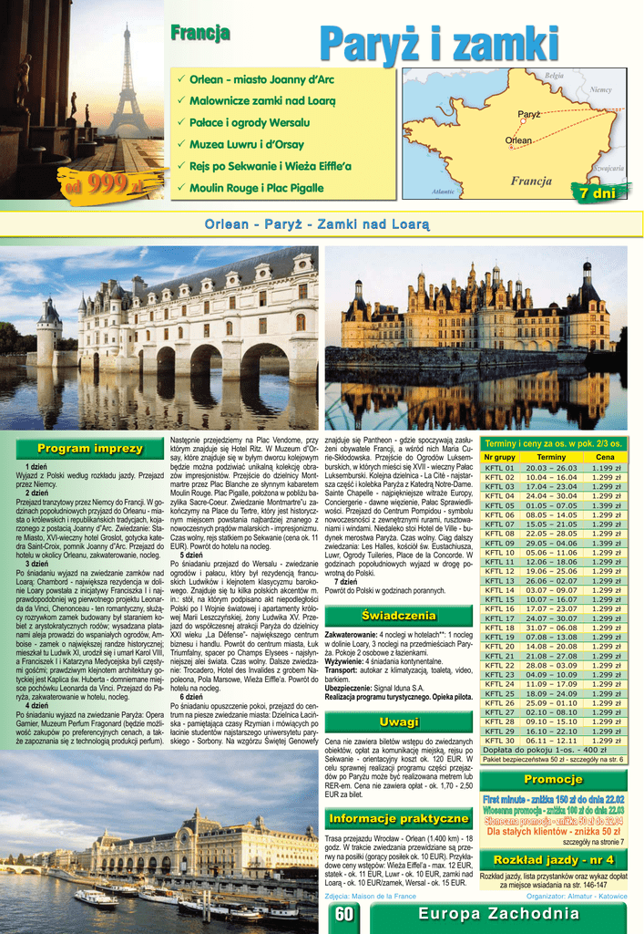 Francja Paryä i zamki Belgia 3 Orlean - miasto Joanny d’Arc Niemcy 3 Malownicze zamki nad Loarð Paryż 3 Paãace i ogrody Wersalu Orlean 3 Muzea Luwru i d’Orsay 3 Rejs po Sekwanie i Wieēa Eiffle’a od 999 zá Szwajcaria Francja 3 Moulin Rouge i Plac Pigalle 7 dni Atlantic O Orlean - ParyĪ - Zamki nad Loarą Program imprezy 1 dzieĕ Wyjazd z Polski wedáug rozkáadu jazdy. Przejazd przez Niemcy. 2 dzieĕ Przejazd tranzytowy przez Niemcy do Francji. W godzinach popoáudniowych przyjazd do Orleanu - miasta o królewskich i republikaĔskich tradycjach, kojarzonego z postacią Joanny d”Arc. Zwiedzanie: Stare Miasto, XVI-wieczny hotel Groslot, gotycka katedra Saint-Croix, pomnik Joanny d”Arc. Przejazd do hotelu w okolicy Orleanu, zakwaterowanie, nocleg. 3 dzieĕ Po Ğniadaniu wyjazd na zwiedzanie zamków nad Loarą: Chambord - najwiĊksza rezydencja w dolinie Loary powstaáa z inicjatywy Franciszka I i najprawdopodobniej wg pierwotnego projektu Leonarda da Vinci, Chenonceau - ten romantyczny, sáuĪący rozrywkom zamek budowany byá staraniem kobiet z arystokratycznych rodów; wysadzana platanami aleja prowadzi do wspaniaáych ogrodów, Amboise - zamek o najwiĊkszej randze historycznej; mieszkaá tu Ludwik XI, urodziá siĊ i umará Karol VIII, a Franciszek I i Katarzyna Medycejska byli czĊstymi goĞümi; prawdziwym klejnotem architektury gotyckiej jest Kaplica Ğw. Huberta - domniemane miejsce pochówku Leonarda da Vinci. Przejazd do ParyĪa, zakwaterowanie w hotelu, nocleg. 4 dzieĕ Po Ğniadaniu wyjazd na zwiedzanie ParyĪa: Opera Garnier, Muzeum Perfum Fragonard (bĊdzie moĪliwoĞü zakupów po preferencyjnych cenach, a takĪe zapoznania siĊ z technologią produkcji perfum). NastĊpnie przejedziemy na Plac Vendome, przy którym znajduje siĊ Hotel Ritz. W Muzeum d”Orsay, które znajduje siĊ w byáym dworcu kolejowym bĊdzie moĪna podziwiaü unikalną kolekcjĊ obrazów impresjonistów. PrzejĞcie do dzielnicy Montmartre przez Plac Blanche ze sáynnym kabaretem Moulin Rouge. Plac Pigalle, poáoĪona w pobliĪu bazylika Sacre-Coeur. Zwiedzanie Montmartre”u zakoĔczymy na Place du Tertre, który jest historycznym miejscem powstania najbardziej znanego z nowoczesnych prądów malarskich - impresjonizmu. Czas wolny, rejs statkiem po Sekwanie (cena ok. 11 EUR). Powrót do hotelu na nocleg. 5 dzieĕ Po Ğniadaniu przejazd do Wersalu - zwiedzanie ogrodów i paáacu, który byá rezydencją francuskich Ludwików i klejnotem klasycyzmu barokowego. Znajduje siĊ tu kilka polskich akcentów m. in.: stóá, na którym podpisano akt niepodlegáoĞci Polski po I Wojnie Ğwiatowej i apartamenty królowej Marii LeszczyĔskiej, Īony Ludwika XV. Przejazd do wspóáczesnej atrakcji ParyĪa do dzielnicy XXI wieku „La Défense”- najwiĊkszego centrum biznesu i handlu. Powrót do centrum miasta, àuk Triumfalny, spacer po Champs Elysees - najsáynniejszej alei Ğwiata. Czas wolny. Dalsze zwiedzanie: Trocadero, Hotel des Invalides z grobem Napoleona, Pola Marsowe, WieĪa EifÀe’a. Powrót do hotelu na nocleg. 6 dzieĕ Po Ğniadaniu opuszczenie pokoi, przejazd do centrum na piesze zwiedzanie miasta: Dzielnica àaciĔska - pamiĊtająca czasy Rzymian i mówiących po áacinie studentów najstarszego uniwersytetu paryskiego - Sorbony. Na wzgórzu ĝwiĊtej Genowefy znajduje siĊ Pantheon - gdzie spoczywają zasáuĪeni obywatele Francji, a wĞród nich Maria Curie-Skáodowska. PrzejĞcie do Ogrodów Luksemburskich, w których mieĞci siĊ XVII - wieczny Paáac Luksemburski. Kolejna dzielnica - La Cité - najstarsza czĊĞü i kolebka ParyĪa z Katedrą Notre-Dame. Sainte Chapelle - najpiĊkniejsze witraĪe Europy, Conciergerie - dawne wiĊzienie, Paáac SprawiedliwoĞci. Przejazd do Centrum Pompidou - symbolu nowoczesnoĞci z zewnĊtrznymi rurami, rusztowaniami i windami. Niedaleko stoi Hotel de Ville - budynek merostwa ParyĪa. Czas wolny. Ciąg dalszy zwiedzania: Les Halles, koĞcióá Ğw. Eustachiusza, Luwr, Ogrody Tuileries, Place de la Concorde. W godzinach popoáudniowych wyjazd w drogĊ powrotną do Polski. 7 dzieĕ Powrót do Polski w godzinach porannych. ģwiadczenia Zakwaterowanie: 4 noclegi w hotelach**: 1 nocleg w dolinie Loary, 3 noclegi na przedmieĞciach ParyĪa. Pokoje 2 osobowe z áazienkami. Wyīywienie: 4 Ğniadania kontynentalne. Transport: autokar z klimatyzacją, toaletą, video, barkiem. Ubezpieczenie: Signal Iduna S.A. Realizacja programu turystycznego. Opieka pilota. Uwagi Cena nie zawiera biletów wstĊpu do zwiedzanych obiektów, opáat za komunikacjĊ miejską, rejsu po Sekwanie - orientacyjny koszt ok. 120 EUR. W celu sprawnej realizacji programu czĊĞci przejazdów po ParyĪu moĪe byü realizowana metrem lub RER-em. Cena nie zawiera opáat - ok. 1,70 - 2,50 EUR za bilet. Informacje praktyczne Terminy i ceny za os. w pok. 2/3 os. Nr grupy KFTL KFTL KFTL KFTL KFTL KFTL KFTL KFTL KFTL KFTL KFTL KFTL KFTL KFTL KFTL KFTL KFTL KFTL KFTL KFTL KFTL KFTL KFTL KFTL KFTL KFTL KFTL KFTL KFTL KFTL 01 02 03 04 05 06 07 08 09 10 11 12 13 14 15 16 17 18 19 20 21 22 23 24 25 26 27 28 29 30 Terminy 20.03 10.04 17.04 24.04 01.05 08.05 15.05 22.05 29.05 05.06 12.06 19.06 26.06 03.07 10.07 17.07 24.07 31.07 07.08 14.08 21.08 28.08 04.09 11.09 18.09 25.09 02.10 09.10 16.10 06.11 – – – – – – – – – – – – – – – – – – – – – – – – – – – – – – 26.03 16.04 23.04 30.04 07.05 14.05 21.05 28.05 04.06 11.06 18.06 25.06 02.07 09.07 16.07 23.07 30.07 06.08 13.08 20.08 27.08 03.09 10.09 17.09 24.09 01.10 08.10 15.10 22.10 12.11 Cena 1.199 1.299 1.299 1.299 1.399 1.299 1.299 1.299 1.399 1.299 1.299 1.299 1.299 1.299 1.299 1.299 1.299 1.299 1.299 1.299 1.299 1.299 1.299 1.299 1.299 1.299 1.299 1.299 1.299 1.299 zá zá zá zá zá zá zá zá zá zá zá zá zá zá zá zá zá zá zá zá zá zá zá zá zá zá zá zá zá zá Dopáata do pokoju 1-os. - 400 zá Pakiet bezpieczeĔstwa 50 zá - szczegóáy na str. 6 Promocje First m