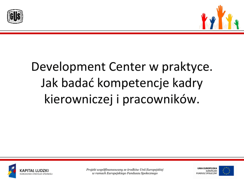 Development Center w praktyce. Jak badać kompetencje kadry kierowniczej i pracowników. Projekt współfinansowany ze środków Unii Europejskiej w ramach Europejskiego Funduszu Społecznego O projekcie • 16 marca 2012 r. – rozpoczęcie projektu Etap I – Analiza stanu obecnego Etap II – Diagnozowanie luk kompetencyjnych (Development Center) Etap III – Podsumowanie realizacji komponentu • 15 czerwca 2012 r. – zakończenie projektu Projekt współfinansowany ze środków Unii Europejskiej w ramach Europejskiego Funduszu Społecznego Rezultaty • Wyodrębnienie 29 kompetencji • Stworzenie 20 profili kompetencyjnych dla całego urzędu • Organizacja sesji rozwoju DC dla pracowników • Opracowanie narzędzi wspierających, m.in. poradnika dla osób dokonujących bilansu kompetencji, szablonów, formularzy do oceny kompetencji i wywiadu kompetencyjnego DC w praktyce Cel: stworzenie pilotażowego programu rozwoju zawodowego dla pracowników uczestniczących w DC Metoda umożliwia dokonanie: • Oceny potencjału pracowników • Diagnozy luk kompetencyjnych lub wskazanie nadwyżek kompetencyjnych Uczestnicy: 39 pracowników GUS, w tym: • grupa osób na stanowiskach kierowniczych • grupa osób na stanowiskach niekierowniczych Sesje DC – metodologia • Metoda DC polega na obserwowaniu pracownika pod kątem kompetencji, które podlegają badaniu • Organizacja sesji: • 1 dzień – 8 godzin • 10 pracowników – 5 Asesorów • Zadania - rodzaje: • Grupowe (dyskusja grupowa) • Indywidualne (prezentacja, testy psychologiczne, wywiad kompetencyjny) Badane kompetencje Grupa Kierownicza Grupa Niekierownicza Kierowanie pracownikami Koordynowanie Decyzyjność Inicjatywa Rozwiązywanie problemów Kreatywność Zarządzanie strategiczne Otwartość na zmiany Komunikacja interpersonalna Orientacja na cele Współpraca w zespole Myślenie analityczne Myślenie syntetyczne Radzenie sobie w trudnych sytuacjach interpersonalnych Oczekiwania GUS • Rozwój pracowników w oparciu o zdiagnozowane obszary do rozwoju i wykazany podczas sesji potencjał pracowników • Przeprowadzenie pilotażu metody, która będzie mogła być zaimplementowana w GUS • Uczestnicy sesji DC będą w organizacji „liderami zmiany” związanej z wdrażanym modelem • Realizacja celów strategicznych GUS Wyniki DC • Opracowanie 39 raportów indywidualnych (udostępnionych za zgodą pracownika przełożonym) • Informacja zwrotna na temat rezultatów dla każdego pracownika • Raport końcowy na temat potencjału organizacji • Rekomendacje na przyszłość Zalety metody DC • Obiektywność oceny • Wysoka trafność oceny • Określenie potencjału pracownika • Informacja zwrotna na temat słabych i mocnych stron pracownika • Diagnoza luk kompetencyjnych • Podstawa do tworzenia planów rozwojowych i ścieżek rozwoju kariery • Określenie potrzeb szkoleniowych Wady metody DC • Wysoki koszt • Czasochłonna • Obawa pracowników przed zwolnieniem • Wymaga kompetentnych osób do jej przeprowadzenia Zastosowanie metody DC • Rekrutacja wewnętrzna, zewnętrzna, np. wybrane zadania • Plan szkoleń (badanie potrzeb szkoleniowych pracowników) • Planowanie ścieżek kariery zawodowej •Ocena potencjału pracowników w kontekście ich rozwoju zawodowego oraz planów rozwojowych organizacji Plany GUS na przyszłość • Opracowanie Programu Zarządzania Zasobami Ludzkimi w GUS w oparciu o model zarządzania kompetencjami • Opracowanie Indywidualnych Programów Rozwoju Zawodowego w oparciu o model zarządzania kompetencjami • Usprawnienie procesów rekrutacji oraz dokonywania ocen okresowych pracowników • Opracowanie systemu umożliwiającego planowanie kariery i ścieżek rozwoju pracowników Dziękuję za uwagę Twój rozwój w dobrych rękach
