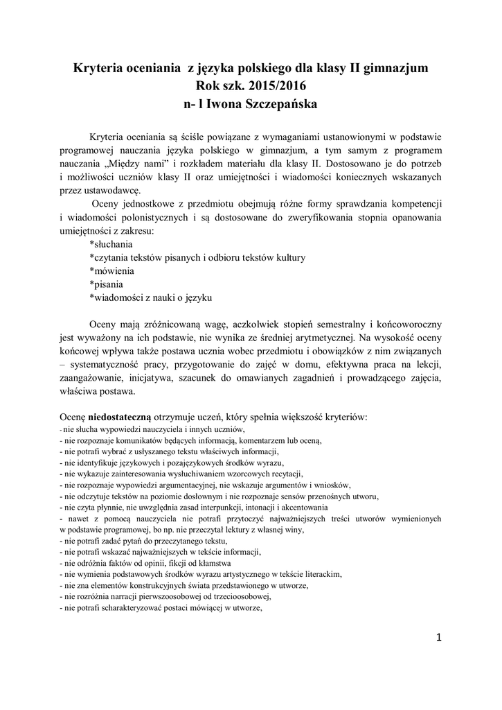 Kryteria oceniania z języka polskiego dla klasy II gimnazjum Rok szk. 2015/2016 n- l Iwona Szczepańska Kryteria oceniania są ściśle powiązane z wymaganiami ustanowionymi w podstawie programowej nauczania języka polskiego w gimnazjum, a tym samym z programem nauczania „Między nami” i rozkładem materiału dla klasy II. Dostosowano je do potrzeb i możliwości uczniów klasy II oraz umiejętności i wiadomości koniecznych wskazanych przez ustawodawcę. Oceny jednostkowe z przedmiotu obejmują różne formy sprawdzania kompetencji i wiadomości polonistycznych i są dostosowane do zweryfikowania stopnia opanowania umiejętności z zakresu: *słuchania *czytania tekstów pisanych i odbioru tekstów kultury *mówienia *pisania *wiadomości z nauki o języku Oceny mają zróżnicowaną wagę, aczkolwiek stopień semestralny i końcoworoczny jest wyważony na ich podstawie, nie wynika ze średniej arytmetycznej. Na wysokość oceny końcowej wpływa także postawa ucznia wobec przedmiotu i obowiązków z nim związanych – systematyczność pracy, przygotowanie do zajęć w domu, efektywna praca na lekcji, zaangażowanie, inicjatywa, szacunek do omawianych zagadnień i prowadzącego zajęcia, właściwa postawa. Ocenę niedostateczną otrzymuje uczeń, który spełnia większość kryteriów: - nie słucha wypowiedzi nauczyciela i innych uczniów, - nie rozpoznaje komunikatów będących informacją, komentarzem lub oceną, - nie potrafi wybrać z usłyszanego tekstu właściwych informacji, - nie identyfikuje językowych i pozajęzykowych środków wyrazu, - nie wykazuje zainteresowania wysłuchiwaniem wzorcowych recytacji, - nie rozpoznaje wypowiedzi argumentacyjnej, nie wskazuje argumentów i wniosków, - nie odczytuje tekstów na poziomie dosłownym i nie rozpoznaje sensów przenośnych utworu, - nie czyta płynnie, nie uwzględnia zasad interpunkcji, intonacji i akcentowania - nawet z pomocą nauczyciela nie potrafi przytoczyć najważniejszych treści utworów wymienionych w podstawie programowej, bo np. nie przeczytał lektury z własnej winy, - nie potrafi zadać pytań do przeczytanego tekstu, - nie potrafi wskazać najważniejszych w tekście informacji, - nie odróżnia faktów od opinii, fikcji od kłamstwa - nie wymienia podstawowych środków wyrazu artystycznego w tekście literackim, - nie zna elementów konstrukcyjnych świata przedstawionego w utworze, - nie rozróżnia narracji pierwszoosobowej od trzecioosobowej, - nie potrafi scharakteryzować postaci mówiącej w utworze, 1 - nie zna terminów: wiersz stroficzny, ciągły, bezrymowy, wolny, legenda, podanie, mit, przypowieść, dziennik, pamiętnik, nowela, powieść, opowiadanie, baśń, bajka, fraszka, dramat, komedia, - nie rozróżnia charakterystyki bezpośredniej i pośredniej, - nie wymienia cech rodzajowych epiki, liryki i dramatu, - nie potrafi wskazać elementów dramatu tj. scena, akt, tekst główny, tekst poboczny, monolog, dialog - odwołując się do własnego doświadczenia, nie potrafi podać motywów postępowania bohatera, - z pomocą nauczyciela nie potrafi skorzystać ze słowników, - nie dostrzega związku między tytułem a treścią dzieła, - nie zna językowych i pozajęzykowych środków perswazji w reklamie, ulotce, - nie dostrzega różnic między filmem dokumentalnym a fabularnym, - nie potrafi świadomie wybrać programów telewizyjnych i gier komputerowych, - nie potrafi wypowiedzieć się na dany temat, - nie dostrzega zależności między modulacją głosu a sensem wypowiedzi, - nie potrafi z pomocą nauczyciela sformułować argumentów do tezy, - nie potrafi wypowiedzieć swojego zdania w dyskusji, - nie potrafi opisać postaci, przedmiotów, krajobrazu, nie podejmuje próby opisu sytuacji, - nie potrafi streścić tekstu publicystycznego, -nie umie zgromadzić słownictwa oceniającego postać, - nie zadaje własnych pytań w wywiadzie, - nie potrafi mówić o własnych odczuciach, - nie wygłasza z pamięci tekstów prozatorskich i lirycznych, - nie potrafi stworzyć planu wypowiedzi, - nie potrafi zredagować tekstu zgodnego z tematem, - nie zna podstawowych zasad poprawności ortograficznej, interpunkcyjnej i językowej, - nie uwzględnia treści symbolicznych w opisie dzieła sztuki, - nie potrafi zredagować opowiadania twórczego, - nie podejmuje prób charakteryzowania postaci literackiej, nie mówi o przeżyciach postaci, -z pomocą nauczyciela nie potrafi zredagować wypowiedzi z logiczną argumentacją, - nie potrafi redagować opisów: postaci, przeżyć, sytuacji, kartki z pamiętnika, dziennika, form użytkowych typu podanie, cv, życiorys, list motywacyjny, - pisząc e – maile lub sms -y nie przestrzega etyki mowy, - nie potrafi w piśmie wypowiedzieć się na temat książki, filmu, przedstawienia, - nie potrafi streścić tekstu literackiego, - nie posiada wiedzy językowej i nie stosuje jej – w zakresie: fonetyki – poprawna wymowa, mechanizmy upodobnień, słowotwórstwa i słownictwa – rodzaje formantów, rozpoznawanie podstawy słowotwórczej w wyrazach złożonych, dobieranie antonimów, posługiwanie się związkami frazeologicznymi, rozpoznawanie wyrazów wieloznacznych, fleksji – znajomość pojęć temat końcówka fleksyjna, wskazywanie części mowy, sposoby tworzenia imiesłowów, składni-- rozpoznawanie orzeczenia i podmiotu, dopełnienia, okolicznika i przydawki, rozpoznawanie zdania pojedynczego i złożonego, równoważnika zdań, zdania bezpodmiotowego, rozpoznanie mowy zależnej i niezależnej, rozpoznawanie wyrazów zapożyczonych, neologizmów i wulgaryzmów. Ocenę dopuszczającą otrzymuje uczeń, który: - uważnie słucha wypowiedzi nauczyciela i innych uczniów, - rozpoznaje komunikaty będące informacją, komentarzem lub oceną, - potrafi wybrać z usłyszanego tekstu właściwe informacje, - identyfikuje językowe i pozajęzykowe środki wyrazu, - wykazuje zainteresowanie wysłuchiwaniem wzorcowych recytacji, - rozpozn