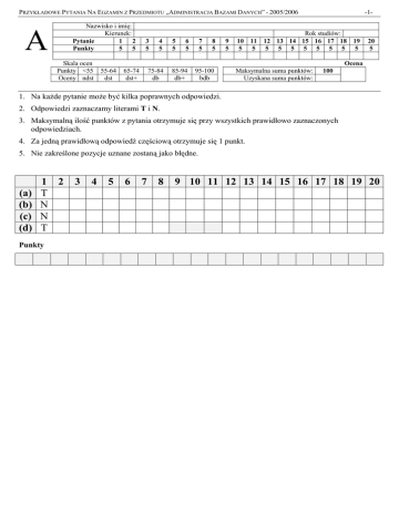 PRZYKŁADOWE PYTANIA NA EGZAMIN Z PRZEDMIOTU „ADMINISTRACJA BAZAMI DANYCH” - 2005/2006 Nazwisko i imię: Kierunek: Pytanie 1 2 Punkty 5 5 A Skala ocen Punkty <55 Oceny ndst 3 5 4 5 5 5 6 5 7 5 8 5 9 5 -1- Rok studiów: 10 11 12 13 14 15 16 17 18 19 5 5 5 5 5 5 5 5 5 5 20 5 Ocena 55-64 dst 65-74 dst+ 75-84 db 85-94 db+ 95-100 bdb Maksymalna suma punktów: Uzyskana suma punktów: 100 1. Na każde pytanie może być kilka poprawnych odpowiedzi. 2. Odpowiedzi zaznaczamy literami T i N. 3. Maksymalną ilość punktów z pytania otrzymuje się przy wszystkich prawidłowo zaznaczonych odpowiedziach. 4. Za jedną prawidłową odpowiedź częściową otrzymuje się 1 punkt. 5. Nie zakreślone pozycje uznane zostaną jako błędne. (a) (b) (c) (d) 1 2 T N N T Punkty 3 4 5 6 7 8 9 10 11 12 13 14 15 16 17 18 19 20 PRZYKŁADOWE PYTANIA NA EGZAMIN Z PRZEDMIOTU „ADMINISTRACJA BAZAMI DANYCH” - 2005/2006 Pytania 1. 2. 3. 4. 5. 6. 7. 8. 9. 10. 11. 12. 13. 14. 15. 16. 17. 18. 19. 20. -2- PRZYKŁADOWE PYTANIA NA EGZAMIN Z PRZEDMIOTU „ADMINISTRACJA BAZAMI DANYCH” - 2005/2006 Przykładowe pytania z „Administracja bazami danych” - 2005/2006 1. 2. Na instancję bazy danych Oracle składają się: (a) Procesy drugoplanowe. (c) Procesy użytkowników. (b) Pamięć SGA. (d) Pliki danych. Bufor danych w SGA (System Globar Area) służy do: (a) przechowywania danych odczytanych z dysku; (b) przechowywania informacji o zmianach wprowadzonych do bazy danych; (c) obsługi poleceń SQL i PL/SQL; (d) przechowywania pewnych informacji ze słownika danych; 3. Bufor dziennika powtórzeń w SGA (System Globar Area) służy do: (a) przechowywania danych odczytanych z dysku; (b) przechowywania informacji o zmianach wprowadzonych do bazy danych; (c) obsługi poleceń SQL i PL/SQL; (d) przechowywania pewnych informacji ze słownika danych; 4. Obszar współdzielony w SGA (System Globar Area) służy do: (a) przechowywania danych odczytanych z dysku; (b) przechowywania informacji o zmianach wprowadzonych do bazy danych; (c) obsługi poleceń SQL i PL/SQL; (d) przechowywania pewnych informacji ze słownika danych; 5. Pliki kontrolne (control files) zawierają informacje o: (a) położeniu plików danych; (b) położeniu plików dziennika powtórzeń; (c) użytkownikach bazy danych; (d) zmianach dokonanych w danych; (e) Informacje o wszystkich grupach dziennika powtórzeń; (f) Bieżącą grupę dziennika powtórzeń; (g) Informacje o plikach danych (włączony, wyłączony, …); (h) Informacje dotyczące punktów kontrolnych; 6. 7. 8. Które pliki zawierają parametry konfiguracyjne sieci? (a) tnsnames.ora; (c) init<SID>.ora; (b) listener.ora; (d) spfile<SID>.ora; Które pliki zawierają parametry konfiguracyjne bazy danych? (a) tnsnames.ora; (c) init<SID>.ora; (b) listener.ora; (d) spfile<SID>.ora; Użytkownik chcący połączyć się z bazą danych korzysta bezpośrednio z: (a) pliku tnsnames.ora; (d) pliku spfile<SID>.ora; (b) procesu nasłuchowego Listener; (e) pliku init<SID>.ora; (c) pliku listener.ora; 9. Które procesy drugoplanowe biorą udział przy zapisie zmian dokonanych w SGA? (a) DBWR (b) LGWR (c) CKPT (d) ARCH 10. Przy pomocy programu ORADIM.EXE można: (a) Uruchomić serwis instancji; (c) Utworzyć serwis instancji; (b) Uruchomić instancję; (d) Zatrzymać serwis instancji. -3- PRZYKŁADOWE PYTANIA NA EGZAMIN Z PRZEDMIOTU „ADMINISTRACJA BAZAMI DANYCH” - 2005/2006 -4- 11. Wykonanie których z wymienionych czynności (w środowisku Windows) jest wymagane aby zwykły użytkownik (bez uprawnień DBA) mógł połączyć się z bazą danych? (a) e:\oracle\ora92\bin\LSNRCTL.EXE LSNRCTL> start (b) e:\ORADIM -STARTUP -SID test -USRPWD test -STARTTYPE srvc,inst (c) e:\ORADIM -STARTUP -SID test -USRPWD test -STARTTYPE srvc (d) e:\ORADIM -SHUTDOWN -SID test -USRPWD test -SHUTTYPE srvc,inst 12. Wykonanie których z wymienionych czynności (w środowisku Windows) jest wymagane aby zwykły użytkownik (bez uprawnień DBA) mógł połączyć się z bazą danych? (a) e:\NET START nazwa_serwisu_listenera (b) e:\ORADIM -STARTUP -SID test -USRPWD test -STARTTYPE srvc,inst (c) e:\ORADIM -STARTUP -SID test -USRPWD test -STARTTYPE srvc (d) e:\ORADIM -SHUTDOWN -SID test -USRPWD test -SHUTTYPE srvc 13. Wykonanie których z wymienionych czynności (w środowisku Windows) jest wymagane aby zwykły użytkownik (bez uprawnień DBA) mógł połączyć się z bazą danych? (a) e:\NET START nazwa_serwisu_listenera (b) e:\SQLPLUS /NOLOG SQL> CONNECT SYS/password@nazwa_instancji AS SYSDBA SQL> STARTUP OPEN (c) e:\ORADIM -STARTUP -SID test -USRPWD test -STARTTYPE srvc (d) e:\ORADIM -SHUTDOWN -SID test -USRPWD test -SHUTTYPE srvc 14. W którym trybie zamknięcia instancji dokończone zostaną wszystkie transakcje? (a) SHUTDOWN NORMAL (c) SHUTDOWN IMMEDIATE (b) SHUTDOWN TRANSACTIONAL (d) SHUTDOWN ABORT 15. Które z poniższych poleceń doprowadzi do natychmiastowego zamknięcia instancji w przypadku, gdy trwa transakcja? (a) SHUTDOWN NORMAL (c) SHUTDOWN IMMEDIATE (b) SHUTDOWN TRANSACTIONAL (d) SHUTDOWN ABORT 16. Zaznacz poprawne stwierdzenia dotyczące parametru PCTUSED. (a) Musi mieć taką samą wartość dla każdej tabeli. (b) Może przyjąć wartość domyślną. (c) Określa w procentach ilość wolnej przestrzeni pozostawionej w blokach na przyszłe modyfikacje. (d) Określa procent wypełnienia bloku, poniżej którego blok traktowany jest za dostępny. 17. Zaznacz poprawne stwierdzenia dotyczące parametru PCTFREE określanego przy tworzeniu tabel. (a) jest opcjonalny (c) określa w procentach ilość wolnej przestrzeni pozostawionej (b) przyjmuje wartość domyślną w blokach na przyszłe modyfikacje (d) określa procent wypełnienia bloku poniżej którego blok traktowany jest za dostępny 18. Niski współczynnik PCTFREE: (a) Powoduje rezerwowanie małej ilości miejsca na aktualizację wierszy, (b) Zapewnia lepsze wypełnienie bloku, (c) Może powodować wysoki koszt przetwarzania. (d) Może zmniejszyć koszt przet