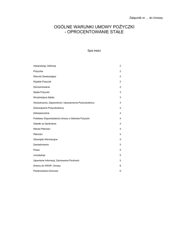 Załącznik nr … do Umowy OGÓLNE WARUNKI UMOWY POŻYCZKI - OPROCENTOWANIE STAŁE Spis treści Interpretacja, Definicje 2 Pożyczka 2 Warunki Zawieszające 2 Wypłata Pożyczki 2 Oprocentowanie 2 Spłata Pożyczki 3 Wcześniejsza Spłata 3 Oświadczenia, Zapewnienia i Upoważnienia Pożyczkobiorcy 3 Zobowiązania Pożyczkobiorcy 4 Zabezpieczenia 4 Podstawy Wypowiedzenia Umowy w Zakresie Pożyczki 4 Odsetki za Opóźnienie 4 Waluta Płatności 4 Płatności 4 Obowiązki Informacyjne 5 Zawiadomienia 5 Prawo 5 Jurysdykcja 5 Ujawnianie Informacji, Zachowanie Poufności 5 Zmiany do OWUP, Umowy 6 Postanowienia Końcowe 6 Ogólne Warunki Umowy Pożyczki określają warunki na jakich Wykonawca i Pożyczkobiorca będą wykonywać swoje prawa i obowiązki w przedmiocie zawiązanego między nimi stosunku prawnego dotyczącego Pożyczki. 1. Interpretacja, Definicje 1.1. Poniższe definicje odnoszą się do odpowiednich wyrażeń używanych w Ogólnych Warunkach Umowy Pożyczki i mają następujące znaczenie: „Data Wymagalności” oznacza dzień, w którym dana należność, wynikająca z faktury VAT lub zawiadomienia Pożyczkobiorcy przez Wykonawcę o płatności należności jest wymagalna i płatna; „Dokumenty Zabezpieczenia” oznacza umowy i dokumenty będące podstawą ustanowienia zabezpieczeń spłaty Pożyczki zgodnie z Umową lub pkt. 10 OWUP; „Dzień Roboczy” oznacza każdy dzień (inny niż sobota lub niedziela), w którym Wykonawca jest otwarty dla prowadzenia działalności gospodarczej; „Kwota Spłaty, Kwota do Spłaty” oznacza niespłaconą kwotę Pożyczki; „Ogólne Warunki, OWUP” oznacza niniejsze Ogólne Warunki Umowy Pożyczki – Oprocentowanie Stałe; „Okres Odsetkowy” oznacza każdy z okresów, o których mowa w pkt. 5 OWUP podzielony na następujące po sobie okresy, z których każdy oprócz pierwszego okresu będzie zaczynał się pierwszego dnia miesiąca kalendarzowego a kończył ostatniego dnia tego samego miesiąca kalendarzowego. Pierwszy Okres Odsetkowy rozpoczyna się w dniu wypłaty Pożyczki i kończy się ostatniego dnia następnego miesiąca po miesiącu, w którym została wypłacona Pożyczka; „Oprocentowanie” oznacza stałą stopę procentową określoną w pkt 5.1.2; „Podstawa Wypowiedzenia Umowy w Zakresie Pożyczki” oznacza którykolwiek z przypadków wymienionych w pkt. 11 OWUP; „Pożyczka” oznacza kwotę określoną w Umowie jako Wartość Pożyczki; „Pożyczkobiorca” oznacza Zamawiającego; „Umowa” oznacza umowę nr ………………… w sprawie zamówienia publicznego na podstawie, której Wykonawca jako Pożyczkodawcą udzielił Pożyczkobiorcy pożyczki w rozumieniu art. 720 i nast. Kodeksu cywilnego; „Wniosek o Wypłatę” oznacza wniosek Pożyczkobiorcy o wypłatę Pożyczki, którego wzór stanowi Załącznik nr 1 do OWUP; „Pożyczkodawca” oznacza Wykonawcę; „Dzień Płatności Odsetek” oznacza, począwszy od następnego kalendarzowego miesiąca po miesiącu, w którym nastąpiła wypłata Pożyczki ostatni dzień każdego ze 120 następujących po sobie miesięcy kalendarzowych, z zastrzeżeniem, że jeżeli którykolwiek z tych dni nie przypada w Dniu Roboczym, Dniem Płatności Odsetek będzie następny Dzień Roboczy; „Dzień Spłaty” oznacza, począwszy od następnego kalendarzowego miesiąca po miesiącu, w którym nastąpiła wypłata Pożyczki ostatni dzień każdego ze 120 następujących po sobie miesięcy kalendarzowych, w których płacona jest Kwota Spłaty z zastrzeżeniem, że jeżeli którykolwiek z tych dni nie przypada w Dniu Roboczym, Dniem Spłaty będzie następny Dzień Roboczy Jeżeli z kontekstu nie wynika inaczej, wyrażenia pisane w Ogólnych Warunkach lub Umowie w liczbie pojedynczej odnoszą się również do liczby mnogiej i odwrotnie. 1.2. Symbole walut: PLN – oznacza złoty, prawny środek płatniczy w Rzeczypospolitej Polskiej. 2. Pożyczka Wykonawca udziela Pożyczkobiorcy pożyczki pieniężnej („Pożyczka”), na warunkach określonych w OWUP. 3. Warunki Zawieszające Wraz ze złożeniem przez Pożyczkobiorcę Wniosku o Wypłatę Wykonawca otrzyma: (i) poprawnie wystawiony przez Pożyczkobiorcę weksel in blanco wraz z podpisanym i zaakceptowanym uprzednio przez Wykonawcę porozumieniem wekslowym; (ii) protokół odbioru końcowego, o którym mowa w § 13 ust. 8 Umowy; (iii) kopię faktury wystawioną przez Wykonawcę o której mowa w § 21 ust. 12 pkt 2 Umowy; (iv) oświadczenie Pożyczkobiorcy, że ten potwierdza spełnienie się przesłanek uprawniających Wykonawcę do wystawienia faktury o której mowa w § 21 ust. 12 pkt 2 Umowy i że kwota ujęta w fakturze jest bezsporna i należna Wykonawcy. 4. Wypłata Pożyczki Pożyczka będzie wypłacona Pożyczkobiorcy w jednym ciągnieniu, jeżeli: (i) nie później, niż do godziny 11 czasu warszawskiego na 2 Dni Robocze przed proponowanym dniem wypłaty Pożyczki Pożyczkobiorca złoży Wniosek o Wypłatę. Proponowanym dniem wypłaty Pożyczki będzie Dzień Roboczy; (ii) w proponowanym dniu wypłaty Pożyczki nie będzie występowała Podstawa Wypowiedzenia Umowy w Zakresie Pożyczki, jak również wypłata Pożyczki nie spowoduje wystąpienia Podstawy Wypowiedzenia Umowy w Zakresie Pożyczki. 2 5. Oprocentowanie 5.1. Kwota do Spłaty będzie oprocentowana według następujących zasad: 5.1.1. Okres od dnia wypłaty do dnia całkowitej spłaty Pożyczki będzie podzielony na Okresy Odsetkowe. 5.1.2. Odsetki będą naliczane według Oprocentowania, które wynosi …………. 5.1.3. Odsetki od Kwoty do Spłaty Pożyczkobiorca będzie płacił w Dniach Płatności Odsetek. 5.1.4. Odsetki od Kwoty do Spłaty będą naliczane za każdy dzień i będą obliczane przy założeniu, że rok trwa 360 dni oraz na podstawie ilości dni, jakie faktycznie upłynęły. 6. Spłata Pożyczki 6.1. Pożyczkobiorca zobowiązuje się do spłaty Kwoty do Spłaty w Dniach Spłaty zgodnie z Harmonogramem Spłat w termin