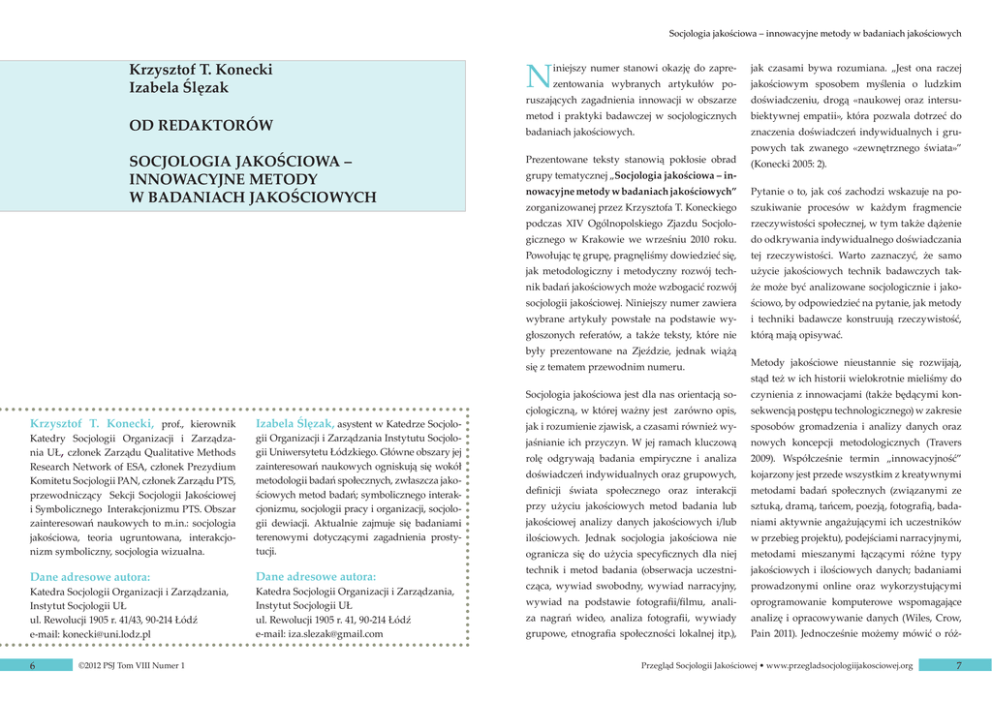 Socjologia jakościowa – innowacyjne metody w badaniach jakościowych Krzysztof T. Konecki Izabela Ślęzak OD REDAKTORÓW SOCJOLOGIA JAKOŚCIOWA – INNOWACYJNE METODY W BADANIACH JAKOŚCIOWYCH N iniejszy numer stanowi okazję do zapre- jak czasami bywa rozumiana. „Jest ona raczej zentowania wybranych artykułów po- jakościowym sposobem myślenia o ludzkim ruszających zagadnienia innowacji w obszarze doświadczeniu, drogą «naukowej oraz intersu- metod i praktyki badawczej w socjologicznych biektywnej empatii», która pozwala dotrzeć do badaniach jakościowych. znaczenia doświadczeń indywidualnych i gru- Prezentowane teksty stanowią pokłosie obrad grupy tematycznej „Socjologia jakościowa – in- Izabela Ślęzak, asystent w Katedrze Socjolo- Katedry Socjologii Organizacji i Zarządzania UŁ, członek Zarządu Qualitative Methods Research Network of ESA, członek Prezydium Komitetu Socjologii PAN, członek Zarządu PTS, przewodniczący Sekcji Socjologii Jakościowej i Symbolicznego Interakcjonizmu PTS. Obszar zainteresowań naukowych to m.in.: socjologia jakościowa, teoria ugruntowana, interakcjonizm symboliczny, socjologia wizualna. gii Organizacji i Zarządzania Instytutu Socjologii Uniwersytetu Łódzkiego. Główne obszary jej zainteresowań naukowych ogniskują się wokół metodologii badań społecznych, zwłaszcza jakościowych metod badań; symbolicznego interakcjonizmu, socjologii pracy i organizacji, socjologii dewiacji. Aktualnie zajmuje się badaniami terenowymi dotyczącymi zagadnienia prostytucji. Dane adresowe autora: Dane adresowe autora: Katedra Socjologii Organizacji i Zarządzania, Instytut Socjologii UŁ ul. Rewolucji 1905 r. 41/43, 90-214 Łódź e-mail: [email protected] 6 ©2012 PSJ Tom VIII Numer 1 Katedra Socjologii Organizacji i Zarządzania, Instytut Socjologii UŁ ul. Rewolucji 1905 r. 41, 90-214 Łódź e-mail: [email protected] (Konecki 2005: 2). nowacyjne metody w badaniach jakościowych” Pytanie o to, jak coś zachodzi wskazuje na po- zorganizowanej przez Krzysztofa T. Koneckiego szukiwanie procesów w każdym fragmencie podczas XIV Ogólnopolskiego Zjazdu Socjolo- rzeczywistości społecznej, w tym także dążenie gicznego w Krakowie we wrześniu 2010 roku. do odkrywania indywidualnego doświadczania Powołując tę grupę, pragnęliśmy dowiedzieć się, tej rzeczywistości. Warto zaznaczyć, że samo jak metodologiczny i metodyczny rozwój tech- użycie jakościowych technik badawczych tak- nik badań jakościowych może wzbogacić rozwój że może być analizowane socjologicznie i jako- socjologii jakościowej. Niniejszy numer zawiera ściowo, by odpowiedzieć na pytanie, jak metody wybrane artykuły powstałe na podstawie wy- i techniki badawcze konstruują rzeczywistość, głoszonych referatów, a także teksty, które nie którą mają opisywać. były prezentowane na Zjeździe, jednak wiążą Krzysztof T. Konecki, prof., kierownik powych tak zwanego «zewnętrznego świata»” się z tematem przewodnim numeru. Metody jakościowe nieustannie się rozwijają, Socjologia jakościowa jest dla nas orientacją so- czynienia z innowacjami (także będącymi kon- cjologiczną, w której ważny jest zarówno opis, sekwencją postępu technologicznego) w zakresie jak i rozumienie zjawisk, a czasami również wy- sposobów gromadzenia i analizy danych oraz jaśnianie ich przyczyn. W jej ramach kluczową nowych koncepcji metodologicznych (Travers rolę odgrywają badania empiryczne i analiza 2009). Współcześnie termin „innowacyjność” doświadczeń indywidualnych oraz grupowych, kojarzony jest przede wszystkim z kreatywnymi definicji świata społecznego oraz interakcji metodami badań społecznych (związanymi ze przy użyciu jakościowych metod badania lub sztuką, dramą, tańcem, poezją, fotografią, bada- jakościowej analizy danych jakościowych i/lub niami aktywnie angażującymi ich uczestników ilościowych. Jednak socjologia jakościowa nie w przebieg projektu), podejściami narracyjnymi, ogranicza się do użycia specyficznych dla niej metodami mieszanymi łączącymi różne typy technik i metod badania (obserwacja uczestni- jakościowych i ilościowych danych; badaniami cząca, wywiad swobodny, wywiad narracyjny, prowadzonymi online oraz wykorzystującymi wywiad na podstawie fotografii/filmu, anali- oprogramowanie komputerowe wspomagające za nagrań wideo, analiza fotografii, wywiady analizę i opracowywanie danych (Wiles, Crow, grupowe, etnografia społeczności lokalnej itp.), Pain 2011). Jednocześnie możemy mówić o róż- stąd też w ich historii wielokrotnie mieliśmy do Przegląd Socjologii Jakościowej • www.przegladsocjologiijakosciowej.org 7 Krzysztof T. Konecki, Izabela Ślęzak Socjologia jakościowa – innowacyjne metody w badaniach jakościowych nych poziomach innowacji (Wiles i in. 2011). Naj- czy sposobów prezentacji wyników. Ideą leżącą Kolejny artykuł także porusza kwestie związane Kolejne dwa artykuły przybliżają zagadnienie niższym jest przyjęcie (adoption) bez większych u podstaw powstania numeru była prezentacja z coraz bardziej popularną socjologią wizualną, niezbyt często poruszane w polskiej literaturze, zmian istniejącej już metody lub techniki i zasto- nowych metod i metodologii, które wchodząc koncentruje się jednak na innym jej wątku. Ma- dotyczące oprogramowania CAQDAS (Compu- sowanie jej w innej dyscyplinie lub odmiennym do repertuaru narzędziowego badaczy jakościo- ciej Frąckowiak w tekście Jak obejrzeć tysiąc zdjęć ter Assisted/Aided Qualitative Data Analysis), czyli wych, mogą wzbogacić socjologię jakościową. na raz? O narzędziach kategoryzacji obrazów fotogra- narzędzi służących komputerowemu wspoma- Co ważne, autorzy rozważają tak zalety i możli- ficznych w projekcie „Niewidzialne Miasto” porusza ganiu analizy danych jakościowych. Oba teksty wości zastosowania prezentowanych rozwiązań, zagadnienie klucza kategoryz