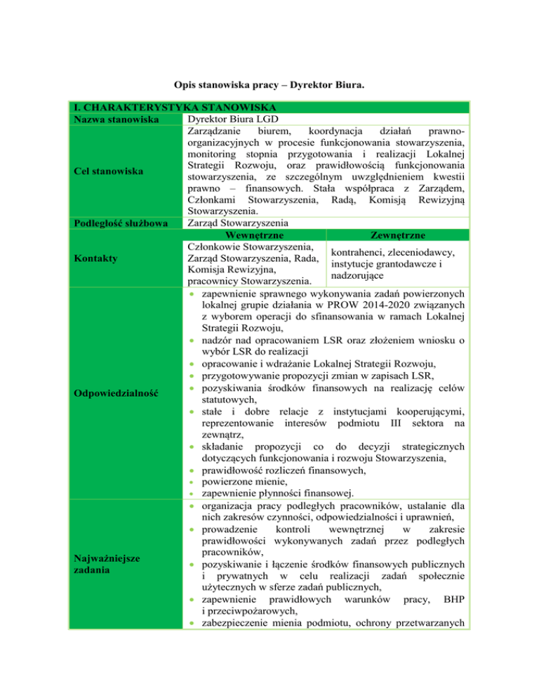 Opis stanowiska pracy – Dyrektor Biura. I. CHARAKTERYSTYKA STANOWISKA Dyrektor Biura LGD Nazwa stanowiska Zarządzanie biurem, koordynacja działań prawnoorganizacyjnych w procesie funkcjonowania stowarzyszenia, monitoring stopnia przygotowania i realizacji Lokalnej Strategii Rozwoju, oraz prawidłowością funkcjonowania Cel stanowiska stowarzyszenia, ze szczególnym uwzględnieniem kwestii prawno – finansowych. Stała współpraca z Zarządem, Członkami Stowarzyszenia, Radą, Komisją Rewizyjną Stowarzyszenia. Zarząd Stowarzyszenia Podległość służbowa Wewnętrzne Zewnętrzne Członkowie Stowarzyszenia, kontrahenci, zleceniodawcy, Kontakty Zarząd Stowarzyszenia, Rada, instytucje grantodawcze i Komisja Rewizyjna, nadzorujące pracownicy Stowarzyszenia. zapewnienie sprawnego wykonywania zadań powierzonych lokalnej grupie działania w PROW 2014-2020 związanych z wyborem operacji do sfinansowania w ramach Lokalnej Strategii Rozwoju, nadzór nad opracowaniem LSR oraz złożeniem wniosku o wybór LSR do realizacji opracowanie i wdrażanie Lokalnej Strategii Rozwoju, przygotowywanie propozycji zmian w zapisach LSR, pozyskiwania środków finansowych na realizację celów Odpowiedzialność statutowych, stałe i dobre relacje z instytucjami kooperującymi, reprezentowanie interesów podmiotu III sektora na zewnątrz, składanie propozycji co do decyzji strategicznych dotyczących funkcjonowania i rozwoju Stowarzyszenia, prawidłowość rozliczeń finansowych, powierzone mienie, zapewnienie płynności finansowej. organizacja pracy podległych pracowników, ustalanie dla nich zakresów czynności, odpowiedzialności i uprawnień, prowadzenie kontroli wewnętrznej w zakresie prawidłowości wykonywanych zadań przez podległych pracowników, Najważniejsze pozyskiwanie i łączenie środków finansowych publicznych zadania i prywatnych w celu realizacji zadań społecznie użytecznych w sferze zadań publicznych, zapewnienie prawidłowych warunków pracy, BHP i przeciwpożarowych, zabezpieczenie mienia podmiotu, ochrony przetwarzanych danych osobowych, dokumentacji i pieczęci, wykonywanie innych obowiązków wynikających z przepisów prawa (w tym ze statutu danego podmiotu). II WYMAGANE KWALIFIKACJE I UMIEJETNOŚCI wyższe (preferowane ekonomiczne, administracyjne lub Wykształcenie prawne) Elementy niezbędne Elementy pożądane znajomość zasad funkcjonowania i prowadzenia stowarzyszeń oraz działalności statutowej odpłatnej i nieodpłatnej w ramach podmiotów III sektora, znajomość PROW 2014 wiedza ogólna z zakresu: 2020 zarządzania Wiedza przedsiębiorstwem, znajomość odpowiednich projektami i zmianą; przepisów prawa (np.: finansów oraz ekonomii ustawy o fundacjach, stowarzyszeniach, pożytku publicznym i wolontariacie, rozporządzeń właściwego ministra ds. rolnictwa dotyczących PROW 20142020). Elementy niezbędne Elementy pożądane rok pracy: na stanowisku kierowniczym, specjalisty, w administracji samorządowej 3 lata udokumentowanego udziału w realizacji lub zarządzaniu projektami w mile widziany udział Doświadczenie tym w szczególności tzw. w przedsięwzięciach miękkimi, finansowanymi z o charakterze zbliżonym do funduszy europejskich, podejścia Leader. w realizowaniu projektów dotyczących rozwoju obszarów wiejskich. Udokumentowana działalność w dowolnej organizacji pozarządowej Motywacja Elementy niezbędne Elementy pożądane Osobowość Umiejętności wewnętrzna; gotowość do ponoszenia odpowiedzialności za wyniki pracy podległego zespołu; nastawienie prospołeczne. Elementy niezbędne rozwinięte kompetencje interpersonalne, odporność na stres, asertywność, kreatywność, otwartość na zmiany, wytrwałość i odpowiedzialność, inteligencja emocjonalna. Kierownicze przywódcze, podejmowania decyzji kierowniczych i rozwiązywania problemów, rozwiązywania konfliktów i podziału zadań, zarządzania w sytuacji zmian i kryzysów, działania pod wpływem stresu i pod presją. ukierunkowanie do współpracy z ludźmi oraz na realizację zadań i misji Stowarzyszenia, nastawienie na ludzi oraz na realizację zadań. Elementy pożądane sumienność - terminowość Specjalistyczne strategicznego myślenia i działania, zdolność analizowania sytuacji, dostrzegania relacji, porównywania danych i wyciągania wniosków, współpracy w zespole, negocjacyjne, wpływania na innych, efektywnego organizowania pracy własnej, pożądana dobra znajomość języka jednego z krajów UE, bardzo dobra znajomość obsługi komputera.