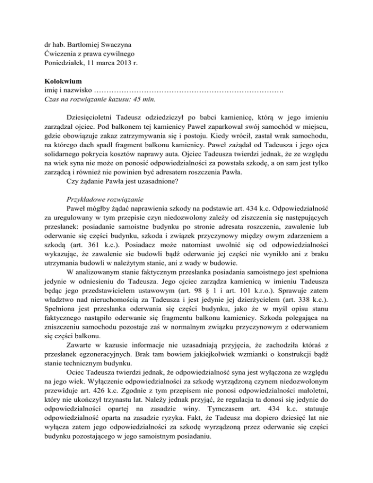 dr hab. Bartłomiej Swaczyna Ćwiczenia z prawa cywilnego Poniedziałek, 11 marca 2013 r. Kolokwium imię i nazwisko …………………………………………………………………. Czas na rozwiązanie kazusu: 45 min. Dziesięcioletni Tadeusz odziedziczył po babci kamienicę, którą w jego imieniu zarządzał ojciec. Pod balkonem tej kamienicy Paweł zaparkował swój samochód w miejscu, gdzie obowiązuje zakaz zatrzymywania się i postoju. Kiedy wrócił, zastał wrak samochodu, na którego dach spadł fragment balkonu kamienicy. Paweł zażądał od Tadeusza i jego ojca solidarnego pokrycia kosztów naprawy auta. Ojciec Tadeusza twierdzi jednak, że ze względu na wiek syna nie może on ponosić odpowiedzialności za powstała szkodę, a on sam jest tylko zarządcą i również nie powinien być adresatem roszczenia Pawła. Czy żądanie Pawła jest uzasadnione? Przykładowe rozwiązanie Paweł mógłby żądać naprawienia szkody na podstawie art. 434 k.c. Odpowiedzialność za uregulowany w tym przepisie czyn niedozwolony zależy od ziszczenia się następujących przesłanek: posiadanie samoistne budynku po stronie adresata roszczenia, zawalenie lub oderwanie się części budynku, szkoda i związek przyczynowy między owym zdarzeniem a szkodą (art. 361 k.c.). Posiadacz może natomiast uwolnić się od odpowiedzialności wykazując, że zawalenie sie budowli bądź oderwanie jej części nie wynikło ani z braku utrzymania budowli w należytym stanie, ani z wady w budowie. W analizowanym stanie faktycznym przesłanka posiadania samoistnego jest spełniona jedynie w odniesieniu do Tadeusza. Jego ojciec zarządza kamienicą w imieniu Tadeusza będąc jego przedstawicielem ustawowym (art. 98 § 1 i art. 101 k.r.o.). Sprawuje zatem władztwo nad nieruchomością za Tadeusza i jest jedynie jej dzierżycielem (art. 338 k.c.). Spełniona jest przesłanka oderwania się części budynku, jako że w myśl opisu stanu faktycznego nastąpiło oderwanie się fragmentu balkonu kamienicy. Szkoda polegająca na zniszczeniu samochodu pozostaje zaś w normalnym związku przyczynowym z oderwaniem się części balkonu. Zawarte w kazusie informacje nie uzasadniają przyjęcia, że zachodziła któraś z przesłanek egzoneracyjnych. Brak tam bowiem jakiejkolwiek wzmianki o konstrukcji bądź stanie technicznym budynku. Ociec Tadeusza twierdzi jednak, że odpowiedzialność syna jest wyłączona ze względu na jego wiek. Wyłączenie odpowiedzialności za szkodę wyrządzoną czynem niedozwolonym przewiduje art. 426 k.c. Zgodnie z tym przepisem nie ponosi odpowiedzialności małoletni, który nie ukończył trzynastu lat. Należy jednak przyjąć, że regulacja ta donosi się jedynie do odpowiedzialności opartej na zasadzie winy. Tymczasem art. 434 k.c. statuuje odpowiedzialność oparta na zasadzie ryzyka. Fakt, że Tadeusz ma dopiero dziesięć lat nie wyłącza zatem jego odpowiedzialności za szkodę wyrządzoną przez oderwanie się części budynku pozostającego w jego samoistnym posiadaniu. Rozważenia wymaga także możliwość zmniejszenia odszkodowania ze względu na przyczynienie się poszkodowanego (art. 362 k.c.), który zaparkował swój samochód w miejscu, w którym było to niedozwolone. Przyczynienie się poszkodowanego może być różnie ujmowane i jest zagadnieniem spornym w doktrynie i orzecznictwie. W każdym z prezentowanych ujęć tej problematyki niezbędne jest jednak występowanie powiązania kauzalnego między zachowaniem się poszkodowanego a szkodą. Przyjmuje się także, że powinno to być powiązanie mające znamię adekwatności w rozumieniu art. 361 § 1 k.c. Bez względu zatem na to, którą koncepcję przyczynienia się przyjmie, szkoda powinna stanowić normalne następstwo zachowania się poszkodowanego. Występowanie tego powiązania należy zbadać dwuetapowo. W pierwszej kolejności za pomocą testu warunku sine qua non, który polega na sprawdzeniu czy bez zachowania się poszkodowanego także doszłoby do powstania szkody. Jeżeli ten test wypadnie pozytywnie, należy przeprowadzić badanie adekwatności związku przyczynowego. Adekwatność zachodzi wówczas, gdy określone zachowanie się poszkodowanego każdorazowo zwiększa prawdopodobieństwo powstania szkody. Gdyby Paweł nie zaparkował w miejscu, gdzie obowiązuje zakaz zatrzymywania się i postoju, to oderwana od kamienicy część balkonu nie uszkodziłaby jego samochodu. Test warunku sine qua non został zatem spełniony. Nie można natomiast przyjąć, że zaparkowanie samochodu w miejscu, gdzie jest to niedozwolone, każdorazowo zwiększa prawdopodobieństwo jego uszkodzenia przez oderwaną część budynku. W analizowanym stanie faktycznym brak zatem było normalnego związku przyczynowego między zachowaniem się Pawła a szkodą, co wyklucza obniżenie odszkodowania ze względu na przyczynienie się poszkodowanego. Odpowiedź: Paweł może żądać naprawienia szkody od Tadeusza, nie może natomiast domagać sie tego od jego ojca.