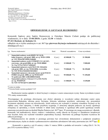 Komornik Sądowy przy Sądzie Rejonowym w Ostrołęce Marcin Cichoń Kancelaria Komornicza w Ostrołęce 07-410 Ostrołęka ul. Kilińskiego 5 tel. (29) 691 71 55, 601 789 602 e-mail: [email protected] fax: 29 691 19 92, www.ostroleka-komornik.pl Km 1174/14 Ostrołęka, dnia 09-03-2015 OBWIESZCZENIE O LICYTACJI RUCHOMOŚCI Komornik Sądowy przy Sądzie Rejonowym w Ostrołęce Marcin Cichoń podaje do publicznej wiadomości, że w dniu 13-04-2015r. o godz. 12:30 w lokalu: 07-411 Rzekuń, ul. Kolonia 2A odbędzie się w trybie ustalonym w art. 867 kpc pierwsza licytacja ruchomości należących do dłużnika i składających się z: ____________________________________________________________________________________________________ Lp. Nazwa ruchomości Ilość Wartość szacunkowa Cena wywołania _____________________________________________________________________________________________________ 1. Samochód osobowy m-ki BMW X5 3.0 D, kolor brązowy, rok prod. 2005, nr rj. WOS 13950 1 [szt.] 42 000,00 **) 31 500,00 nr VIN WBAFB71095LX40404 2. Samochód osobowy m-ki CITROEN C4 1,6l 16V, czerwony, rok prod.2006, nr rej. WOS 00860 1 [szt.] 12 000,00 **) 9 000,00 Nr Vin VF7LCNFUC74502625 3. Samochód ciężarowy m-ki MAN FE 310A6X4 rok prod. 2001, nr rej. WOS12856, wywrotka 1 [szt.] 75 000,00 **) 56 250,00 Nr VIN WMAT4SZZZ1M323813 4. Samochód ciężarowy skrzynia żuraw m-ki IVECO FORD rok prod. 2000, nr rej WOS14197 1 [szt.] 95 000,00 **) 71 250,00 Nr podwozia SBCA1RGH002316646 5. Samochód osobowy Citroen C3 1,4 SX PACK nr rej. WOS9N35 1 [szt.] 11 000,00 **) 8 250,00 Nr VIN VF7FCKFVC28519023 _______________________________________________________________________________________________________________________ *) cena za sztukę **) kwota brutto zawiera podatek VAT Ruchomości można oglądać w dzień licytacji w miejscu i czasie oznaczonym wyżej. Suma wywołania wynosi 75% sumy oszacowania. Przystępujący do przetargu obowiązany jest złożyć rękojmię w wysokości jednej dziesiątej części sumy oszacowania. Rękojmię złożoną przez licytanta, któremu udzielono przybicia, zatrzymuje się; pozostałym licytantom rękojmię zwraca się niezwłocznie. Jeżeli nabywca nie wykonał w terminie warunków licytacji co do zapłaty ceny, traci rękojmię, a skutki przybicia wygasają. Z utraconej rękojmi pokrywa się koszty egzekucji związanej ze sprzedażą, a reszta wchodzi w skład sumy uzyskanej w egzekucji albo jeżeli egzekucja została umorzona jest przelewana na dochód Skarbu Państwa (art. 8671 kpc). W przetargu nie mogą uczestniczyć: dłużnik, komornik, ich małżonkowie, dzieci, rodzice i rodzeństwo, osoby obecne na licytacji w charakterze urzędowym oraz licytant, który nie wykonał warunków poprzedniej licytacji. Stawienie się jednego licytanta wystarcza do odbycia przetargu. Pełnomocnictwo do udziału w przetargu powinno być stwierdzone dokumentem z podpisem urzędowo poświadczonym, chyba że chodzi o pełnomocnictwo udzielone adwokatowi lub radcy prawnemu (art. 8672 kpc) Komornik w oparciu o art.18 ustawy z dnia 11 marca 2004r o podatku od towarów i usług (Dz.U. Nr 54, poz.535) wystawia faktury VAT. 1 UWAGA: Licytacja może się nie odbyć bez podania przyczyny. Jeżeli drzwi będą zamknięte, będą otwierane na koszt i odpowiedzialność dłużnika. Komornik Sądowy Marcin Cichoń 2