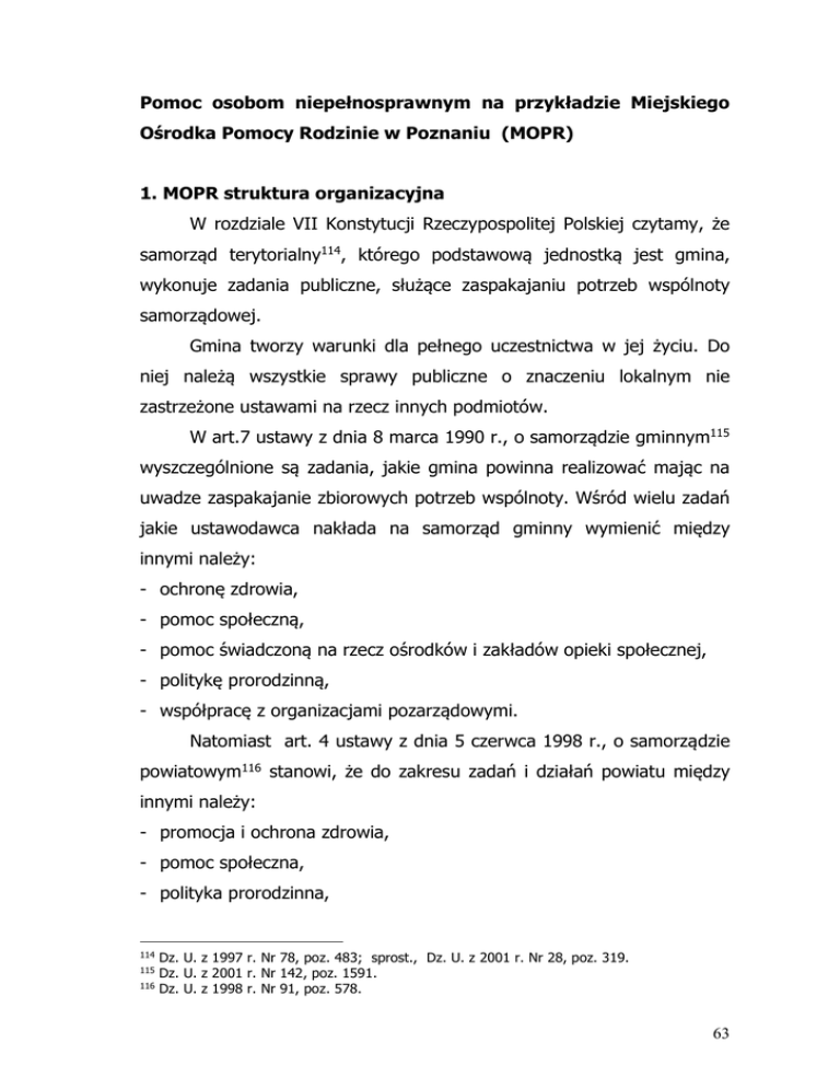 Pomoc osobom niepełnosprawnym na przykładzie Miejskiego Ośrodka Pomocy Rodzinie w Poznaniu (MOPR) 1. MOPR struktura organizacyjna W rozdziale VII Konstytucji Rzeczypospolitej Polskiej czytamy, że samorząd terytorialny114, którego podstawową jednostką jest gmina, wykonuje zadania publiczne, służące zaspakajaniu potrzeb wspólnoty samorządowej. Gmina tworzy warunki dla pełnego uczestnictwa w jej życiu. Do niej należą wszystkie sprawy publiczne o znaczeniu lokalnym nie zastrzeżone ustawami na rzecz innych podmiotów. W art.7 ustawy z dnia 8 marca 1990 r., o samorządzie gminnym115 wyszczególnione są zadania, jakie gmina powinna realizować mając na uwadze zaspakajanie zbiorowych potrzeb wspólnoty. Wśród wielu zadań jakie ustawodawca nakłada na samorząd gminny wymienić między innymi należy: - ochronę zdrowia, - pomoc społeczną, - pomoc świadczoną na rzecz ośrodków i zakładów opieki społecznej, - politykę prorodzinną, - współpracę z organizacjami pozarządowymi. Natomiast art. 4 ustawy z dnia 5 czerwca 1998 r., o samorządzie powiatowym116 stanowi, że do zakresu zadań i działań powiatu między innymi należy: - promocja i ochrona zdrowia, - pomoc społeczna, - polityka prorodzinna, 114 115 116 Dz. U. z 1997 r. Nr 78, poz. 483; sprost., Dz. U. z 2001 r. Nr 28, poz. 319. Dz. U. z 2001 r. Nr 142, poz. 1591. Dz. U. z 1998 r. Nr 91, poz. 578. 63 - wspieranie osób niepełnosprawnych, - współpraca z organizacjami pozarządowymi. Miejski Ośrodek Pomocy Rodzinie (MOPR) na mocy uchwały Rady Miasta Poznania117, rozpoczął działalność z dniem 1 czerwca 1999 r. Na podstawie art.30 ust.1 ustawy z dnia 8 marca 1990 r., o samorządzie gminnym118, Prezydent Miasta Poznania wydał zarządzenie119, w sprawie nadania statutu Miejskiemu Ośrodkowi Pomocy Rodzinie w Poznaniu. Zarządzenie to w § 2 postanawia, że dotychczasowe uchwały120Rady Miasta w sprawie nadania statutu jednostce budżetowej – Miejskiemu Ośrodkowi Pomocy Rodzinie przestały obowiązywać. Statut postanawia, że Miejski Ośrodek Pomocy Rodzinie jest miejską jednostką organizacyjną i działa jako jednostka budżetowa w rozumieniu przepisów ustawy o finansach publicznych121. MOPR działalność swą prowadzi na podstawie następujących aktów prawnych: - ustawy z dnia 12 marca 2004 r. o pomocy społecznej122, - ustawy z dnia 27 sierpnia 1997 r. o rehabilitacji zawodowej i społecznej oraz zatrudnianiu osób niepełnosprawnych123, - ustawy z dnia 28 listopada 2003 r. o świadczeniach rodzinnych124, - ustawy z dnia 27 sierpnia 2004 r. o świadczeniach opieki zdrowotnej finansowanych ze środków publicznych125, ustawy z dnia 13 października 1998 r. o systemie ubezpieczeń społecznych126, - ustawy z dnia 19 sierpnia 1994 r. o ochronie zdrowia psychicznego127, 117 118 119 120 121 122 123 124 125 126 Nr XIV/124/III/99 z dnia 18 maja 1999. Dz. U. z 2001 r. Nr 142, poz. 1591. Nr 312/2004/P z dnia 30 kwietnia 2004 . Nr 334 z dnia 28 czerwca 1990 r. oraz Nr 625 z dnia 2 sierpnia 2002. Dz. U. Nr 155, poz.1014 z 1998. tekst jednolity Dz. U. z 2004 r. Nr 64, poz.593. Dz. U. z 1997 r. Nr 123, poz. 776 z późn. zm. Dz. U. z 2003 r. Nr 228, poz. 2255. Dz. U. z dnia 27 września 2004 r. Nr 20, poz.2135. tekst jednolity Dz. U. Nr 137/98, poz.887 z późn. zm. 64 - ustawy z dnia 1 grudnia 1994 r. o zasiłkach rodzinnych, pielęgnacyjnych i wychowawczych128, - ustawy z dnia 25 czerwca 1997 r. o cudzoziemcach129, - ustawy z dnia 13 listopada 2003 r. o dochodach jednostek samorządu terytorialnego130, - ustawy z dnia 24 kwietnia 2003 r. o działalności pożytku publicznego i o wolontariacie131, Statut obok postanowień ogólnych, określa cele i zadania realizowane przez Miejski Ośrodek Pomocy Rodzinie w Poznaniu, jego organizację oraz gospodarkę finansową. Przedmiotem działalności MOPR- u jest: - kompleksowa pomoc osobom i rodzinom w przezwyciężaniu trudnych sytuacji życiowych, których nie są w stanie one pokonać, - przeciwdziałanie patologii społecznej, - pomoc rodzinom we właściwym wypełnianiu ich funkcji i zadań. Zakres zadań pomocy społecznej jakie realizuje MOPR, określony został w § 5 pkt1 - 36 statutu. Do zadań świadczonych na rzecz osób niepełnosprawnych wymienić należy: - opracowywanie i wykonywanie miejskich programów na rzecz osób niepełnosprawnych dotyczących ich rehabilitacji społecznej, podejmowanie działań mających na celu ograniczenie skutków niepełnosprawności, - dofinansowywanie uczestnictwa osób niepełnosprawnych i ich opiekunów, turnusach rehabilitacyjnych, sportu, kulturze, rekreacji, turystyce, - dofinansowanie likwidacji barier architektonicznych, 127 128 129 130 131 Dz. U. z 1994 r. Nr 111, poz. 535 z późn. zm. tekst jednolity Dz. U. z 1998 r. Nr 102, poz. 651 z późn. zm. Dz. U. z 1997 r. Nr 114, poz.739 z późn. zm. Dz. U. z 2003 r. Nr 203, poz. 1966. Dz. U. z 2003 r. Nr 127, poz. 1399. 65 - dofinansowanie tworzenia i działania warsztatów terapii zajęciowej, - współpraca z organizacjami pozarządowymi i fundacjami działającymi na rzecz osób niepełnosprawnych w zakresie rehabilitacji społecznej. Poznański MOPR dąży do wypracowania nowej, skutecznej formuły współpracy z obywatelami i stworzenia lepszego wizerunku pomocy społecznej w Poznaniu. W swych strukturach stara się wypracowywać taką organizację, która ułatwiałyby kontakt z Ośrodkiem wszystkim osobom zabiegającym o pomoc państwową. Zasady kierowania Ośrodkiem, określenie struktury organizacyjnej, wyszczególnienie zadań realizowanych przez poszczególne działy, sekcje, zespoły, filie oraz określenie działalności kontrolnej zawiera Regulamin Organizacyjny Miejskiego Ośrodka Pomocy Rodzinie w Poznaniu. Miejskim Ośrodkiem Pomocy Rodzinie kieruje i reprezentuje go na zewnątrz Dyrektor powoływany przez Prezydenta m. Poznania. Dyrektor w regulaminie organizacyjnym zatwierdzonym przez Prezydenta m. Poznania określa organizację wewnętrz