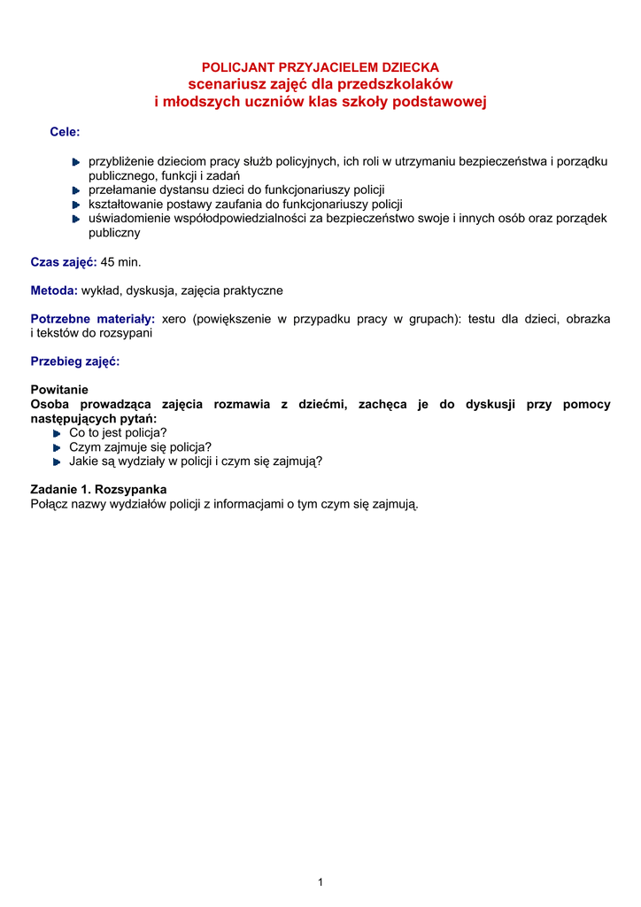 POLICJANT PRZYJACIELEM DZIECKA scenariusz zajęć dla przedszkolaków i młodszych uczniów klas szkoły podstawowej Cele: przybliżenie dzieciom pracy służb policyjnych, ich roli w utrzymaniu bezpieczeństwa i porządku publicznego, funkcji i zadań przełamanie dystansu dzieci do funkcjonariuszy policji kształtowanie postawy zaufania do funkcjonariuszy policji uświadomienie współodpowiedzialności za bezpieczeństwo swoje i innych osób oraz porządek publiczny Czas zajęć: 45 min. Metoda: wykład, dyskusja, zajęcia praktyczne Potrzebne materiały: xero (powiększenie w przypadku pracy w grupach): testu dla dzieci, obrazka i tekstów do rozsypani Przebieg zajęć: Powitanie Osoba prowadząca zajęcia rozmawia z dziećmi, zachęca je do dyskusji przy pomocy następujących pytań: Co to jest policja? Czym zajmuje się policja? Jakie są wydziały w policji i czym się zajmują? Zadanie 1. Rozsypanka Połącz nazwy wydziałów policji z informacjami o tym czym się zajmują. 1 WYDZIAŁ RUCHU DROGOWEGO utrzymywanie bezpieczeństwa i porządku w ruchu drogowym, kontrola ruchu drogowego, ujawnianie przestępstw i wykroczeń drogowych, postępowanie w sprawach o wypadki i kolizje WYDZIAŁ PREWENCJI działania na rzecz spraw nieletnich; bezpieczeństwa i porządku na szlakach kolejowych, wodnych i lotniskach; przemocy w rodzinie; nadzorowanie straży miejskiej LABORATORIUM KRYMINALISTYCZNE wykonywanie ekspertyz kryminalistycznych; zabezpieczanie śladów na miejscach przestępstw i zdarzeń; tworzenie zbiorów umożliwiających identyfikację osób i rzeczy WYDZIAŁ DO WALKI Z PRZESTĘPCZOŚCIĄ GOSPODARCZĄ I KORUPCJĄ rozpoznawanie, ujawnianie i ściganie sprawców przestępstw gospodarczych i korupcyjnych; wykrywanie sprawców tych przestępstw WYDZIAŁ DO WALKI Z PRZESTĘPCZOŚCIĄ SAMOCHODOWĄ rozpoznawanie, zapobieganie i zwalczanie przestępczości związanej z kradzieżą pojazdów samochodowych WYDZIAŁ KONWOJOWY konwojowanie osób skazanych; poszukiwanych; cudzoziemców; przedmiotów wartościowych WYDZIAŁ KRYMINALNY ustalanie sprawców przestępstw przeciwko mieniu; przestępstw związanych z patologiami społecznymi oraz ustalaniu miejsc pobytu i zatrzymywaniu osób poszukiwanych Co mogłoby się dziać gdyby nie było policji? Do czego jest potrzebna policja? W jakich sytuacjach jest potrzebna obywatelom? Czy na co dzień ludzie myślą o tym, że policja jest potrzebna? Gdy nie dzieje się nic złego czy ktoś myśli o policji? Czy tylko wtedy jak stanie się coś złego? Co ludzie zazwyczaj czują jak widzą policjanta? Co wy czujecie jak spotykacie policjanta? Dlaczego tak się dzieje? Czy dzieci mogą potrzebować pomocy policjanta? W jakich sytuacjach? Czy kiedykolwiek zdarzyło się wam, abyście poprosiły o pomoc policjanta? Czy poprosilibyście o pomoc policjanta gdyby zaszła taka potrzeba? Dlaczego niektórzy boją się policji? (policjanci są uzbrojeni; mają mundur; ludzie boją się, że dostaną mandat; obawiają się, że pójdą do więzienia; że zrobili coś złego itd.) Czy jest to obawa uzasadniona? Czy ludzie uczciwi mają powód, żeby bać się policji? Czy praca policjanta jest łatwa czy trudna? Co się może wydarzyć podczas służby? Jakie są zagrożenia? Czy jest stresująca? Co jest przyjemnego w byciu policjantem? 2 Czy znacie inne zawody, które są podobne do zawodu policjanta (ratownik, strażak, żołnierz, strażnik miejski, żandarmeria wojskowa)? Co je łączy? (służba społeczeństwu, poświęcenie, odwaga, narażenie na niebezpieczeństwo, praca w nietypowych godzinach, częste przebywanie poza domem, brak zrozumienia i akceptacji przez społeczeństwo itd.) Zadanie 2. Czy nadajesz się na policjanta? Sprawdź swoją wiedzę. 1. a) b) c) Jaki jest numer telefonu na policję? 999 998 997 2. a) b) c) Co to jest dochodzenie? droga policjanta, która pokonuje każdego dnia do pracy doprowadzenie przestępcy do aresztu śledztwo 3. a) b) c) Co bada specjalista od daktyloskopii? charakter pisma ślady po kulach odciski palców 4. a) b) c) Policjant powinien pomagać ludziom: zawsze tylko podczas pełnienia służby tylko w ważnych sprawach 5. a) b) c) Żeby zostać dobrym funkcjonariuszem policji w przyszłości młody człowiek powinien: być dobrze wykształcony, sumienny, dokładny uczyć się policyjnego zachowania z filmów i książek kryminalnych dużo ćwiczyć, żeby być w świetnej formie fizycznej 6. a) b) c) Linie papilarne są: takie same u osób blisko spokrewnionych inne u każdego człowieka zmieniają się wraz z wiekiem człowieka Zadanie 3. Sprawdź czy jesteś spostrzegawczy. Dzieci podzielone na 2-4 osobowe grupy przypatrują się obrazkowi przez 2-3 minuty. Każdy z członków grupy stara się zapamiętać jak najwięcej szczegółów. Następnie nauczyciel zadaje pytania (umieszczone poniżej). Każda grupa stawia sobie punkt za poprawną odpowiedź. Wygrywa ta, która ma najwięcej punktów. 1. Ile dzieci jest na obrazku? 2. Ile osób uległo wypadkowi? 3. Ile samochodów zostało zniszczonych? 4. Jakiej marki są zniszczone samochody? 5. Jaki znak drogowy jest na obrazku? 6. Ilu policjantów jest na obrazku? 7. Co robią policjanci na obrazku? 8. Ilu ratowników pomagało poszkodowanym? 9. Jakie obrażenia odnieśli poszkodowani? 10. Iloma radiowozami przyjechali policjanci? 11. Kto spowodował wypadek? Dlaczego tak się stało? 12. Gdzie są rowery dzieci? 13. Jakie zwierzątka są na obrazku? (ptaszek na znaku drogowym, ślimak na radiowozie) 3 4