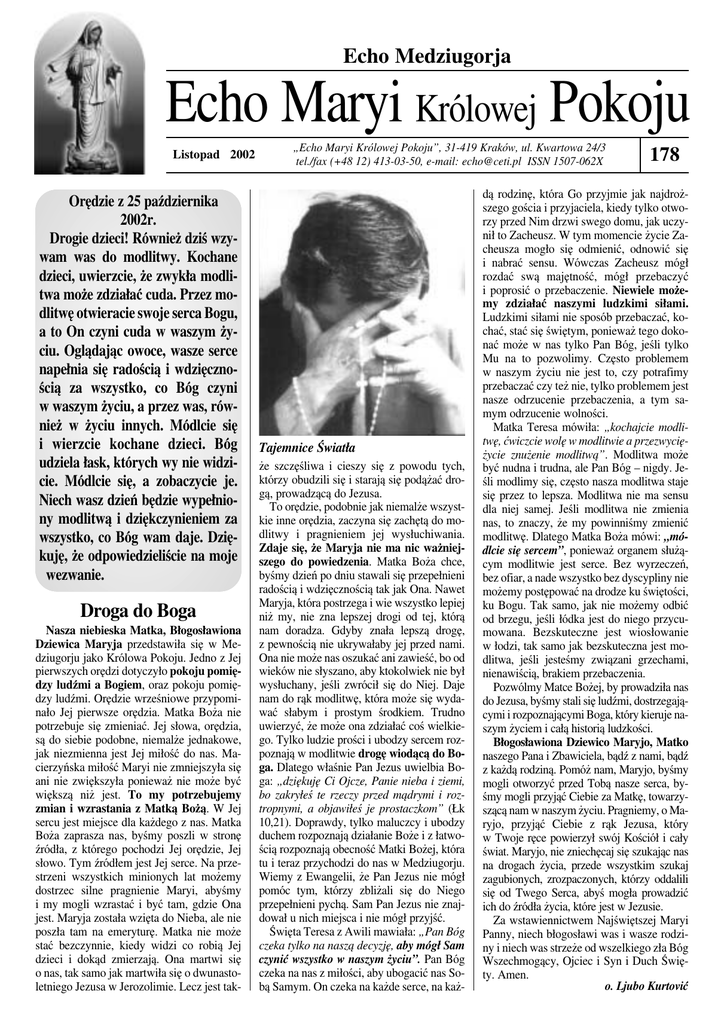 Echo Medziugorja Echo Maryi Królowej Pokoju Listopad 2002 Or´dzie z 25 pa˝dziernika 2002r. Drogie dzieci! Równie˚ dziÊ wzywam was do modlitwy. Kochane dzieci, uwierzcie, ˚e zwyk∏a modlitwa mo˚e zdzia∏aç cuda. Przez modlitw´ otwieracie swoje serca Bogu, a to On czyni cuda w waszym ˚yciu. Oglàdajàc owoce, wasze serce nape∏nia si´ radoÊcià i wdzi´cznoÊcià za wszystko, co Bóg czyni w waszym ˚yciu, a przez was, równie˚ w ˚yciu innych. Módlcie si´ i wierzcie kochane dzieci. Bóg udziela ∏ask, których wy nie widzicie. Módlcie si´, a zobaczycie je. Niech wasz dzieƒ b´dzie wype∏niony modlitwà i dzi´kczynieniem za wszystko, co Bóg wam daje. Dzi´kuj´, ˚e odpowiedzieliÊcie na moje wezwanie. Droga do Boga Nasza niebieska Matka, B∏ogos∏awiona Dziewica Maryja przedstawi∏a si´ w Medziugorju jako Królowa Pokoju. Jedno z Jej pierwszych or´dzi dotyczy∏o pokoju pomi´dzy lud˝mi a Bogiem, oraz pokoju pomi´dzy lud˝mi. Or´dzie wrzeÊniowe przypomina∏o Jej pierwsze or´dzia. Matka Bo˚a nie potrzebuje si´ zmieniaç. Jej s∏owa, or´dzia, sà do siebie podobne, niemal˚e jednakowe, jak niezmienna jest Jej mi∏oÊç do nas. Macierzyƒska mi∏oÊç Maryi nie zmniejszy∏a si´ ani nie zwi´kszy∏a poniewa˚ nie mo˚e byç wi´kszà ni˚ jest. To my potrzebujemy zmian i wzrastania z Matkà Bo˚à. W Jej sercu jest miejsce dla ka˚dego z nas. Matka Bo˚a zaprasza nas, byÊmy poszli w stron´ ˝ród∏a, z którego pochodzi Jej or´dzie, Jej s∏owo. Tym ˝ród∏em jest Jej serce. Na przestrzeni wszystkich minionych lat mo˚emy dostrzec silne pragnienie Maryi, abyÊmy i my mogli wzrastaç i byç tam, gdzie Ona jest. Maryja zosta∏a wzi´ta do Nieba, ale nie posz∏a tam na emerytur´. Matka nie mo˚e staç bezczynnie, kiedy widzi co robià Jej dzieci i dokàd zmierzajà. Ona martwi si´ o nas, tak samo jak martwi∏a si´ o dwunastoletniego Jezusa w Jerozolimie. Lecz jest tak- „Echo Maryi Królowej Pokoju”, 31-419 Kraków, ul. Kwartowa 24/3 tel./fax (+48 12) 413-03-50, e-mail: [email protected] ISSN 1507-062X Tajemnice Âwiat∏a ˚e szcz´Êliwa i cieszy si´ z powodu tych, którzy obudzili si´ i starajà si´ podà˚aç drogà, prowadzàcà do Jezusa. To or´dzie, podobnie jak niemal˚e wszystkie inne or´dzia, zaczyna si´ zach´tà do modlitwy i pragnieniem jej wys∏uchiwania. Zdaje si´, ˚e Maryja nie ma nic wa˚niejszego do powiedzenia. Matka Bo˚a chce, byÊmy dzieƒ po dniu stawali si´ przepe∏nieni radoÊcià i wdzi´cznoÊcià tak jak Ona. Nawet Maryja, która postrzega i wie wszystko lepiej ni˚ my, nie zna lepszej drogi od tej, którà nam doradza. Gdyby zna∏a lepszà drog´, z pewnoÊcià nie ukrywa∏aby jej przed nami. Ona nie mo˚e nas oszukaç ani zawieÊç, bo od wieków nie s∏yszano, aby ktokolwiek nie by∏ wys∏uchany, jeÊli zwróci∏ si´ do Niej. Daje nam do ràk modlitw´, która mo˚e si´ wydawaç s∏abym i prostym Êrodkiem. Trudno uwierzyç, ˚e mo˚e ona zdzia∏aç coÊ wielkiego. Tylko ludzie proÊci i ubodzy sercem rozpoznajà w modlitwie drog´ wiodàcà do Boga. Dlatego w∏aÊnie Pan Jezus uwielbia Boga: „dzi´kuj´ Ci Ojcze, Panie nieba i ziemi, bo zakry∏eÊ te rzeczy przed màdrymi i roztropnymi, a objawi∏eÊ je prostaczkom” (∑k 10,21). Doprawdy, tylko maluczcy i ubodzy duchem rozpoznajà dzia∏anie Bo˚e i z ∏atwoÊcià rozpoznajà obecnoÊç Matki Bo˚ej, która tu i teraz przychodzi do nas w Medziugorju. Wiemy z Ewangelii, ˚e Pan Jezus nie móg∏ pomóc tym, którzy zbli˚ali si´ do Niego przepe∏nieni pychà. Sam Pan Jezus nie znajdowa∏ u nich miejsca i nie móg∏ przyjÊç. Âwi´ta Teresa z Awili mawia∏a: „Pan Bóg czeka tylko na naszà decyzj´, aby móg∏ Sam czyniç wszystko w naszym ˚yciu”. Pan Bóg czeka na nas z mi∏oÊci, aby ubogaciç nas Sobà Samym. On czeka na ka˚de serce, na ka˚- 178 dà rodzin´, która Go przyjmie jak najdro˚szego goÊcia i przyjaciela, kiedy tylko otworzy przed Nim drzwi swego domu, jak uczyni∏ to Zacheusz. W tym momencie ˚ycie Zacheusza mog∏o si´ odmieniç, odnowiç si´ i nabraç sensu. Wówczas Zacheusz móg∏ rozdaç swà maj´tnoÊç, móg∏ przebaczyç i poprosiç o przebaczenie. Niewiele mo˚emy zdzia∏aç naszymi ludzkimi si∏ami. Ludzkimi si∏ami nie sposób przebaczaç, kochaç, staç si´ Êwi´tym, poniewa˚ tego dokonaç mo˚e w nas tylko Pan Bóg, jeÊli tylko Mu na to pozwolimy. Cz´sto problemem w naszym ˚yciu nie jest to, czy potrafimy przebaczaç czy te˚ nie, tylko problemem jest nasze odrzucenie przebaczenia, a tym samym odrzucenie wolnoÊci. Matka Teresa mówi∏a: „kochajcie modlitw´, çwiczcie wol´ w modlitwie a przezwyci´˚ycie znu˚enie modlitwà”. Modlitwa mo˚e byç nudna i trudna, ale Pan Bóg – nigdy. JeÊli modlimy si´, cz´sto nasza modlitwa staje si´ przez to lepsza. Modlitwa nie ma sensu dla niej samej. JeÊli modlitwa nie zmienia nas, to znaczy, ˚e my powinniÊmy zmieniç modlitw´. Dlatego Matka Bo˚a mówi: „módlcie si´ sercem”, poniewa˚ organem s∏u˚àcym modlitwie jest serce. Bez wyrzeczeƒ, bez ofiar, a nade wszystko bez dyscypliny nie mo˚emy post´powaç na drodze ku Êwi´toÊci, ku Bogu. Tak samo, jak nie mo˚emy odbiç od brzegu, jeÊli ∏ódka jest do niego przycumowana. Bezskuteczne jest wios∏owanie w ∏odzi, tak samo jak bezskuteczna jest modlitwa, jeÊli jesteÊmy zwiàzani grzechami, nienawiÊcià, brakiem przebaczenia. Pozwólmy Matce Bo˚ej, by prowadzi∏a nas do Jezusa, byÊmy stali si´ lud˝mi, dostrzegajàcymi i rozpoznajàcymi Boga, który kieruje naszym ˚yciem i ca∏à historià ludzkoÊci. B∏ogos∏awiona Dziewico Maryjo, Matko naszego Pana i Zbawiciela, bàd˝ z nami, bàd˝ z ka˚dà rodzinà. Pomó˚ nam, Maryjo, byÊmy mogli otworzyç przed Tobà nasze serca, byÊmy mogli przyjàç Ciebie za Matk´, towarzyszàcà nam w naszym ˚yciu. Pragniemy, o Maryjo, przyjàç Ciebie z ràk Jezusa, który w Twoje r´ce powierzy∏ sw