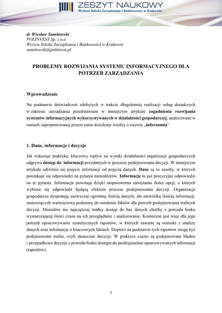 dr Wiesław Samitowski POLINVEST Sp. z o.o. Wyższa Szkoła Zarządzania i Bankowości w Krakowie [email protected] PROBLEMY ROZWIJANIA SYSTEMU INFORMACYJNEGO DLA POTRZEB ZARZĄDZANIA Wprowadzenie Na podstawie doświadczeń zdobytych w trakcie długoletniej realizacji usług doradczych w zakresie zarządzania przedstawiam w niniejszym artykule zagadnienia rozwijania systemów informacyjnych wykorzystywanych w działalności gospodarczej, analizowane w ramach zaproponowanej przeze mnie dziedziny wiedzy o nazwie „infornomia”. 1. Dane, informacje i decyzje Jak wskazuje praktyka, kluczowy wpływ na wyniki działalności organizacji gospodarczych odgrywa dostęp do informacji przydatnych w procesie podejmowania decyzji. W niniejszym artykule odróżnia się pojęcie informacji od pojęcia danych. Dane są to zasoby, w których poszukuje się odpowiedzi na pytania menedżerów. Informacje to już precyzyjne odpowiedzi na te pytania. Informacje powstają dzięki stopniowemu zawężaniu ilości opcji, z których wybiera się odpowiedź będącą efektem procesu podejmowania decyzji. Organizacje gospodarcze dysponują zazwyczaj ogromną ilością danych, ale niewielką ilością informacji, stanowiących wartościową podstawę do ustalenia faktów dla potrzeb podejmowania trafnych decyzji. Menedżer ma najczęściej trudny dostęp do baz danych choćby z powodu braku wystarczającej ilości czasu na ich przeglądanie i analizowanie. Konieczne jest więc dla jego potrzeb opracowywanie syntetycznych raportów, w których zawarte są wnioski z analizy danych oraz informacje o kluczowych faktach. Dopiero na podstawie tych raportów mogą być podejmowane trafne, czyli skuteczne decyzje. W praktyce często są podejmowane błędne i przypadkowe decyzje z powodu braku dostępu do profesjonalnie opracowywanych informacji (raportów). 1 Schemat 1. Proces podejmowania decyzji Źródło: opracowanie własne Uzyskiwanie przez menedżerów dostępu do profesjonalnych raportów jest możliwe w przypadku konsekwentnego, systematycznego rozwijania przez organizacje systemów informacyjnych dla potrzeb zarządzania, w tym rozwiązywania problemów we wdrażaniu zmian w tych systemach dla stałego wzrostu ich efektywności. Opracowywanie na podstawie analizy danych raportów zawierających informacje dla potrzeb podejmowania decyzji wymaga zazwyczaj twórczej pracy, w wyniku której następuje odkrywanie nowych związków między danymi. Ponieważ pojęcie „informacja” pochodzi od łacińskiego słowa „informatio”, oznaczającego: przedstawienie, wizerunek, pojęcie to powinno być rozumiane jako prezentacja faktów. Można więc stwierdzić, że tworzenie informacji dla potrzeb zarządzania polega na cierpliwym poszukiwaniu prawdziwego obrazu uwarunkowań oraz rzeczywistych efektów prowadzenia działalności gospodarczej. 2. Systemy informacyjne a narzędzia informatyczne Obecnie systemy informacyjne funkcjonują m.in. z zastosowaniem narzędzi informatycznych. W praktyce jednak często popełnianym błędem jest poszukiwanie narzędzi informatycznych bez przygotowania założeń systemu informacyjnego organizacji. Powoduje to poważne problemy podczas wdrożenia oprogramowania oraz niesatysfakcjonujące efekty tego wdrożenia. Występują nawet przypadki obniżenia efektywności systemu informacyjnego po wdrożeniu narzędzi informatycznych z powodu braku opracowania w odpowiednim czasie koncepcji systemu informacyjnego, którego elementem są narzędzia informatyczne. Schemat 2. Rola założeń systemu informacyjnego 2 Źródło: opracowanie własne W praktyce konieczne jest więc określenie założeń systemu informacyjnego zawierających m.in. odpowiedzi na poniższe pytania: Lp. Pytania 1. Jaka jest koncepcja zarządzania w organizacji (w tym przyjęty model biznesowy i polityka personalna), a co za tym idzie, jakie są wynikające stąd potrzeby informacyjne? Jakie informacje są potrzebne do oceny pracy w poszczególnych komórkach i głównych stanowiskach pracy? 2. Jaki jest plan rozwoju systemu informacyjnego (jakie nowe informacje są potrzebne i w jakiej kolejności należy je uzyskiwać - jaka jest gradacja potrzeb informacyjnych)? 3. Jakie stanowiska są odpowiedzialne za administrowanie danymi informacjami i wykorzystywanie tych danych w zarządzaniu? Na jakich stanowiskach pracy będą tworzone i aktualizowane bazy danych i w jaki sposób? 4. Gdzie są przygotowywane te same albo zbliżone dane lub informacje, które trzeba ujednolicić? W jaki sposób zapewnić spójność danych i informacji pochodzących z różnych komórek organizacyjnych? 5. Jakie są definicje poszczególnych rodzajów informacji z punktu widzenia wymogów zarządzania, np. dla obliczenia przychodów, jakie należy przyjąć klasyfikacje rodzajów produktów, rodzajów przychodów, rodzajów jednostek fizycznych, by informacje były możliwe do zastosowania w poszczególnych formułach obliczeniowych, służących liczeniu przyjętych rodzajów wskaźników? 6. Jakie wzory raportów należy stosować, by agregować informacje? 7. Jakie są oczekiwane narzędzia informatyczne dla wsparcia tworzenia określonych rodzajów informacji dla zarządzania (podejmowania decyzji)? Jak należy w pełni wykorzystać posiadane już możliwości narzędzi informatycznych? 8. Jak użytkownicy powinni merytorycznie uczestniczyć w budowaniu systemów informacyjnych i nie pozostawiać informatyków bez niezbędnego wsparcia ze strony użytkowników? Jaki zespół projektowy powinien kierować budową systemu informacyjnego i jakie role powinni mieć poszczególni jego członkowie? 9. Jaki jest odpowiedni okresów czasu na wdrożenie zmian merytorycznych i organizacyjnych w systemie informacyjnym, by podnieść jego efektywność? 10. Jak zapewnić konsekwencję w budowaniu systemu informacyjnego, by unikać wzajemnie sprzecznych działań utrudniających jego budowę? 11. Jakie są konieczne „podręczniki” dla użytkowni