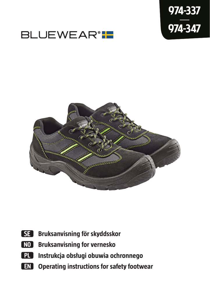 974-337 — 974-347 Bruksanvisning för skyddsskor Bruksanvisning for vernesko Instrukcja obsługi obuwia ochronnego Operating instructions for safety footwear SE - Bruksanvisning i original Rätten till ändringar förbehålles. Vid eventuella problem, kontakta vår serviceavdelning på telefon 0200-88 55 88. www.jula.se NO - Bruksanvisning (Oversettelse av original bruksanvisning) Med forbehold om endringer. Ved eventuelle problemer kan du kontakte vår serviceavdeling på telefon 67 90 01 34. www.jula.no PL - Instrukcja obsługi (Tłumaczenie oryginalnej instrukcji) Z zastrzeżeniem prawa do zmian. W razie ewentualnych problemów skontaktuj się telefonicznie z naszym działem obsługi klienta pod numerem: 22 338 88 88. www.jula.pl EN - Operating instructions (Translation of the original instructions) Jula reserves the right to make changes. In the event of problems, please contact our service department. www.jula.com Tillverkare/ Produsent / Producenci/ Manufacturer Jula AB, Box 363, 532 24 SKARA Importör/ Importør/ Importer/ Importer Jula Norge AS, Solheimsveien 6–8, 1471 LØRENSKOG Distributör/ Distributør/ Dystrybutor/ Distributor Jula Poland Sp. z o.o., ul. Malborska 49, 03-286 Warszawa, Polska Date of production: 2015-12-10 © Jula AB SVENSKA������������������������������������������������������������������������������������������������������������������ 4 SÄKERHETSANVISNINGAR����������������������������������������������������������������������������������������������������������������������4 TEKNISKA DATA ��������������������������������������������������������������������������������������������������������������������������������������5 Exempel på märkning������������������������������������������������������������������������������������������������������������������������������ 5 Skyddsklass����������������������������������������������������������������������������������������������������������������������������������������������6 Kompletterande märkning���������������������������������������������������������������������������������������������������������������������� 7 BESKRIVNING����������������������������������������������������������������������������������������������������������������������������������������� 8 UNDERHÅLL������������������������������������������������������������������������������������������������������������������������������������������� 8 NORSK���������������������������������������������������������������������������������������������������������������������� 9 SIKKERHETSANVISNINGER��������������������������������������������������������������������������������������������������������������������� 9 TEKNISKE DATA��������������������������������������������������������������������������������������������������������������������������������������10 Eksempel på merking��������������������������������������������������������������������������������������������������������������